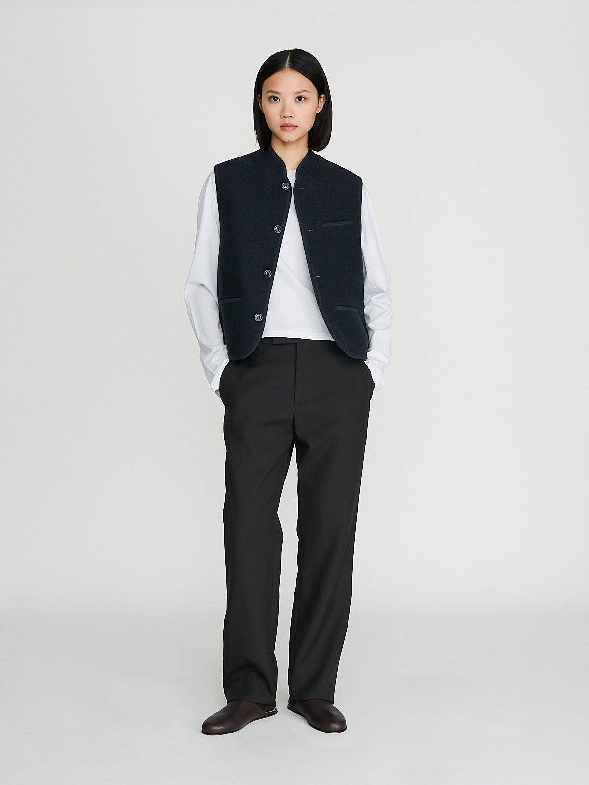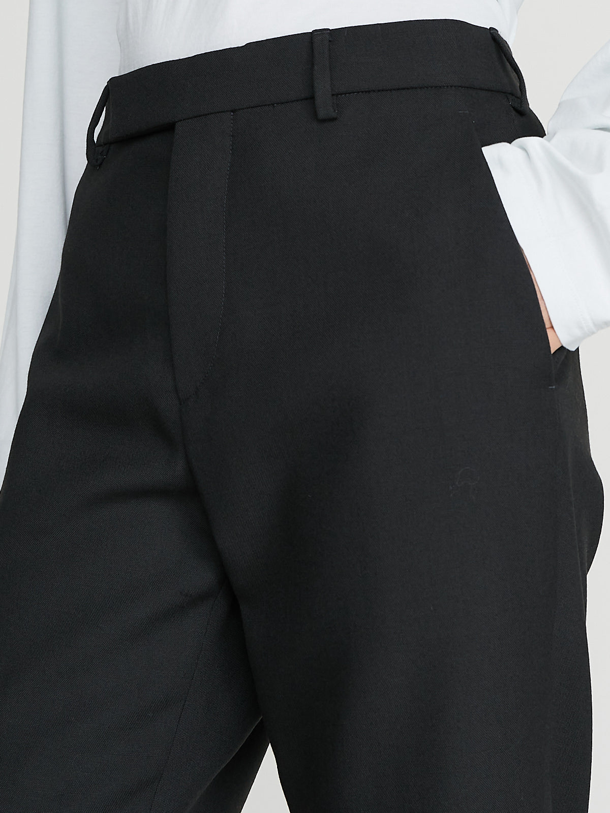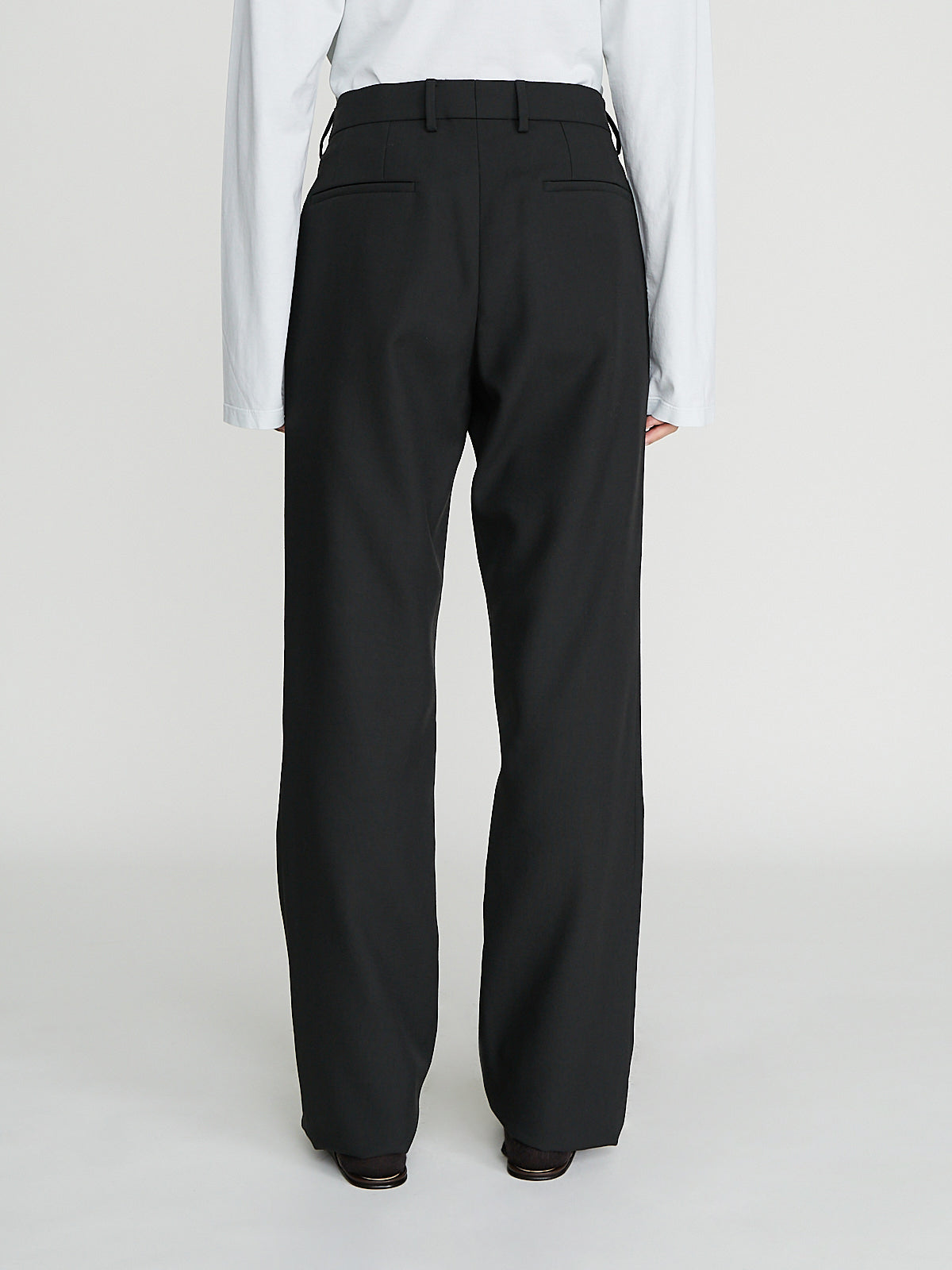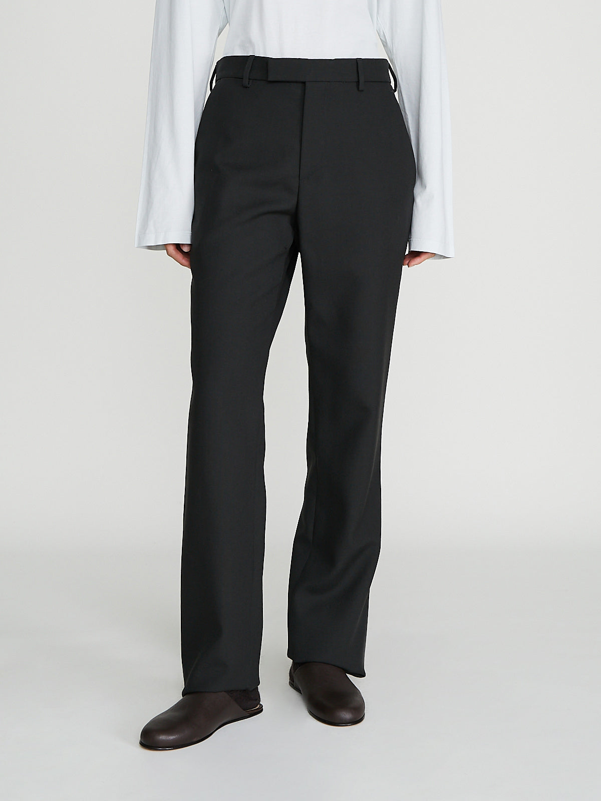 Fitted tailored trouser in dak brown virgin wool. Off-centre hook fastening, zip fly and belt loops. Slash pockets on the front and jetted pockets on the back. Straight legs.