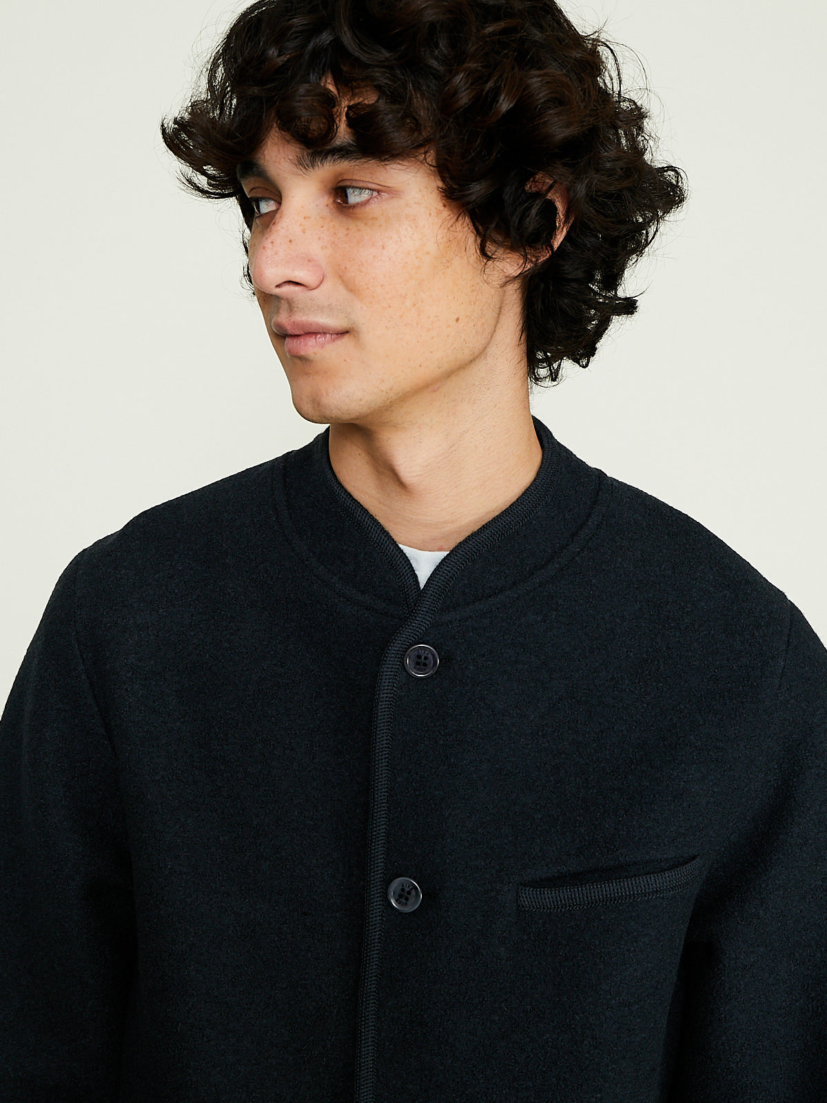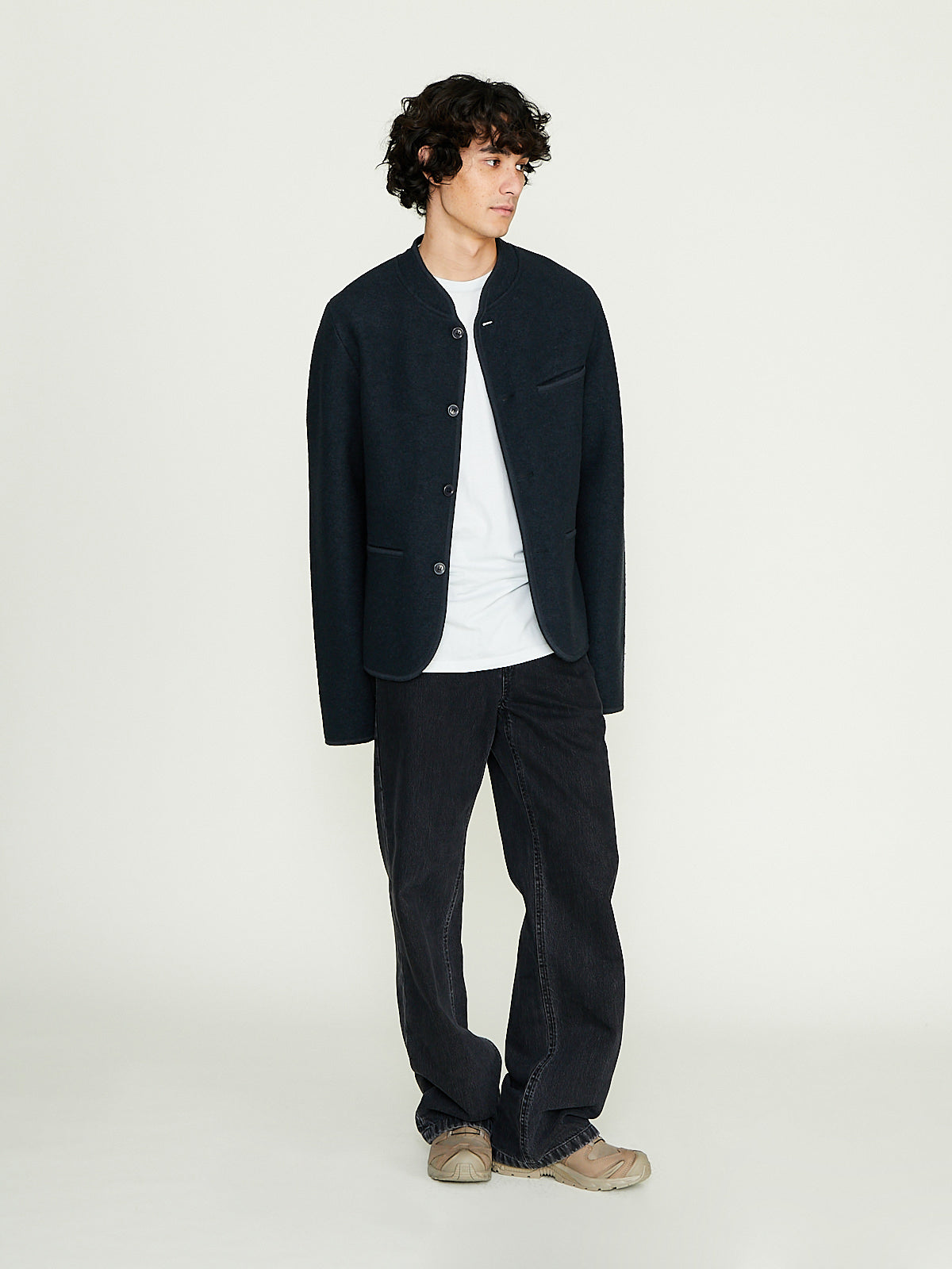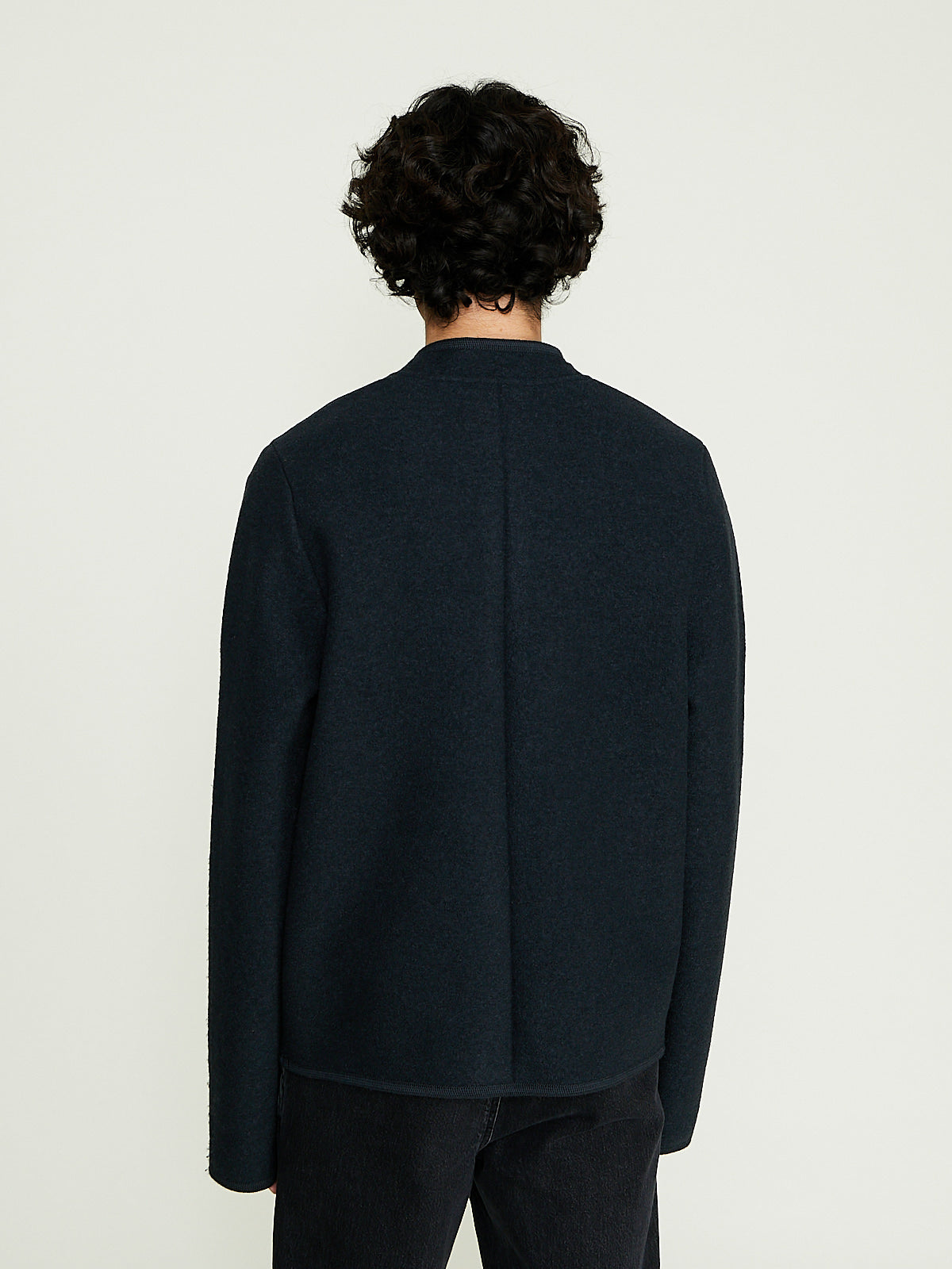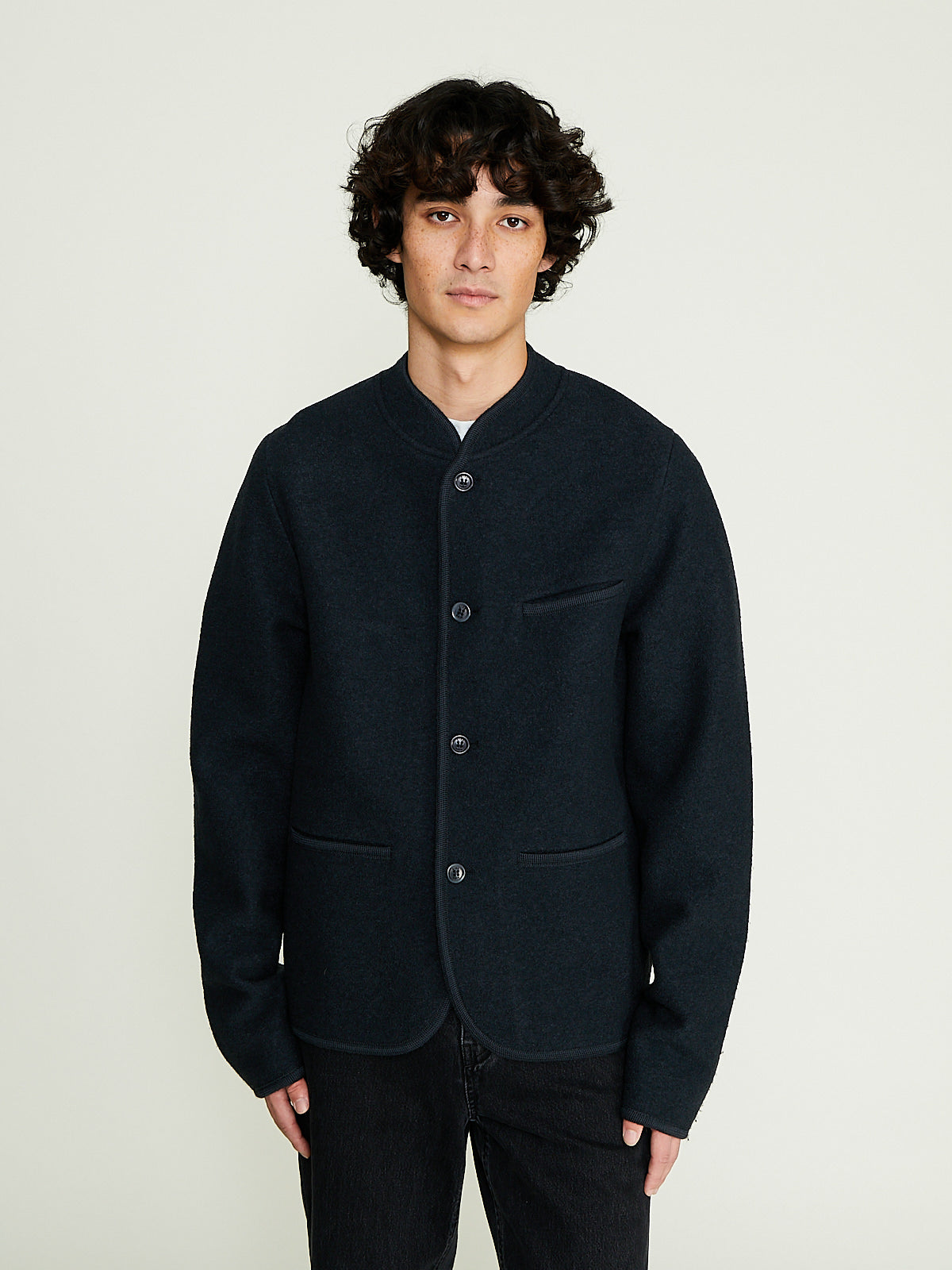 Walker jacket in dark bluey grey felted wool. Banded collar and a front button fastening. Slip  pockets on the front and a single chest pocket. Features an internal patch pocket. Woven wool border throughout. Boxy and regular fit. Unlined.