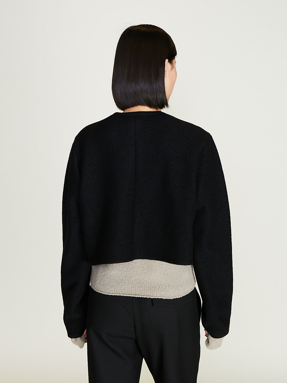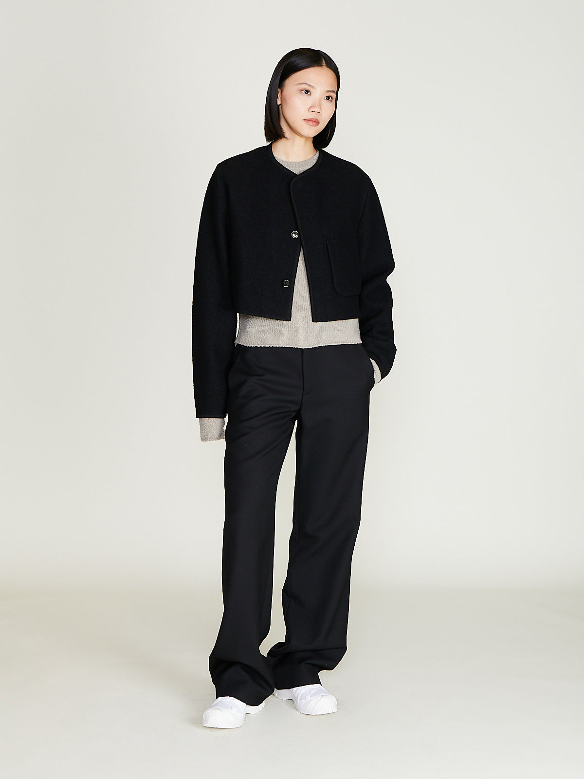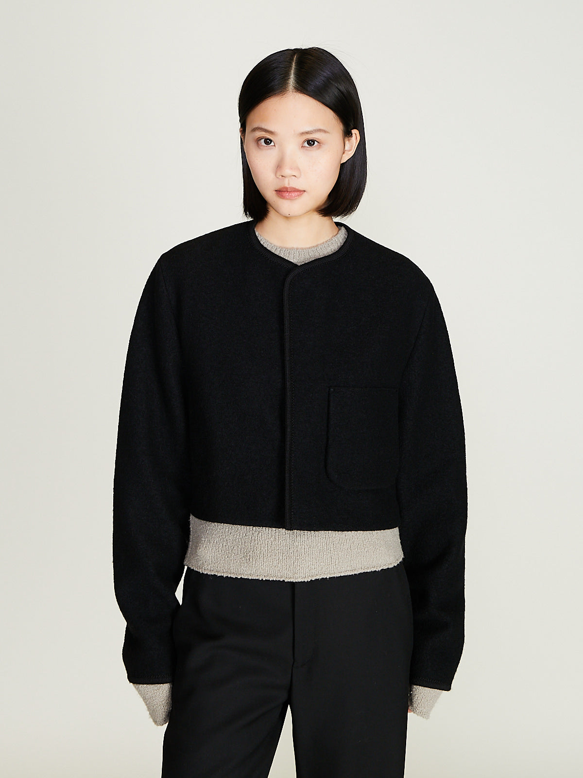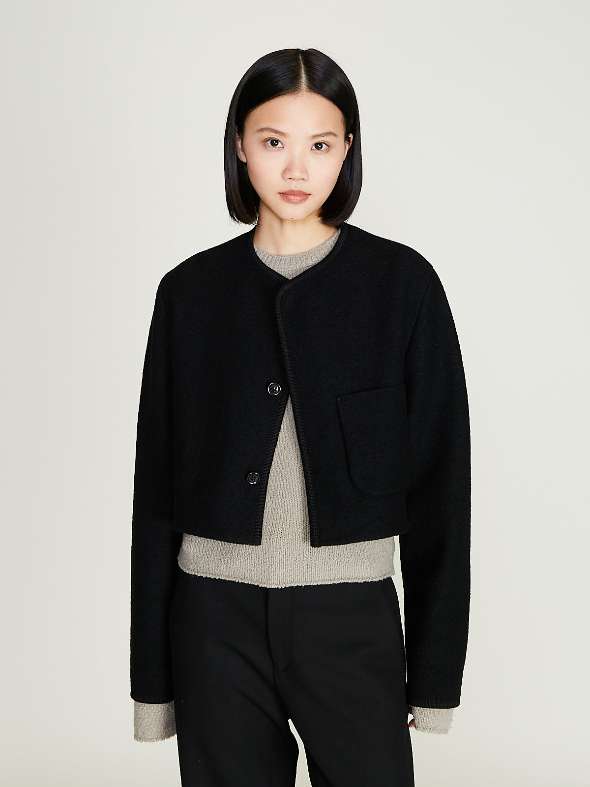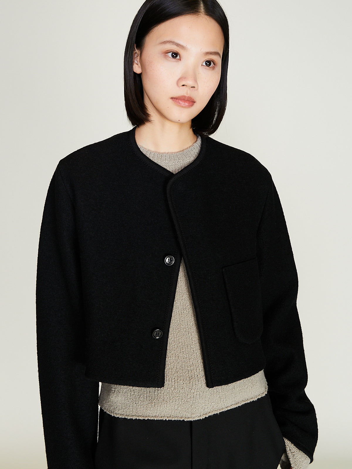 Cropped jacket in light felted black wool. Collarless and a concealed front button fastening. Single patch pocket the front and a single internal chest pocket. Woven wool border detailing throughout. Boxy and regular fit. Unlined.