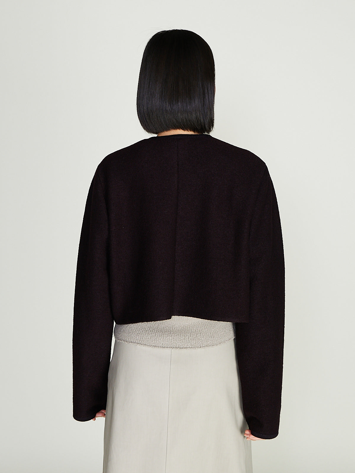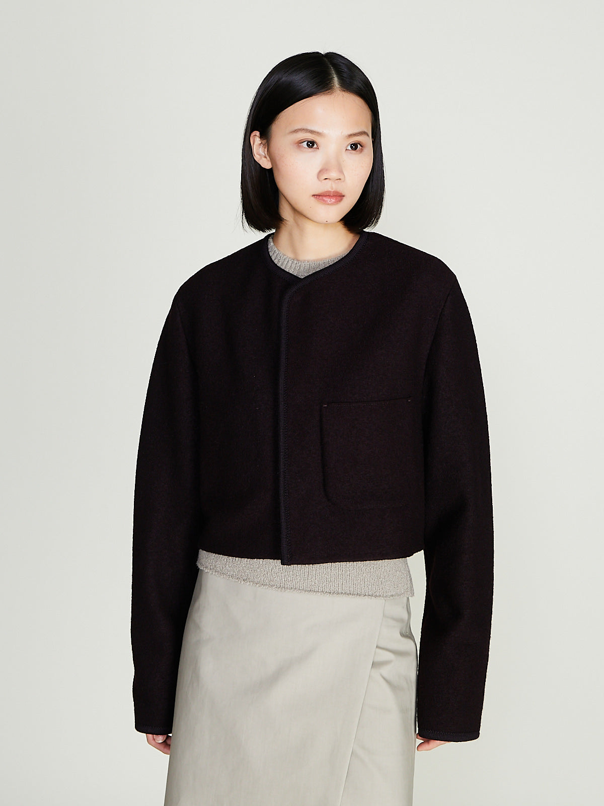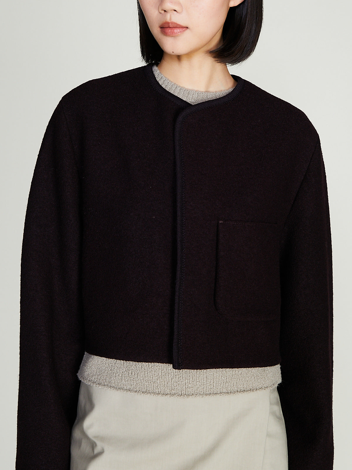 Cropped jacket in light felted dark brown wool. Collarless and a concealed front button fastening. Single patch pocket on the front and a single internal chest pocket. Features woven wool border detailing throughout. Boxy and regular fit.