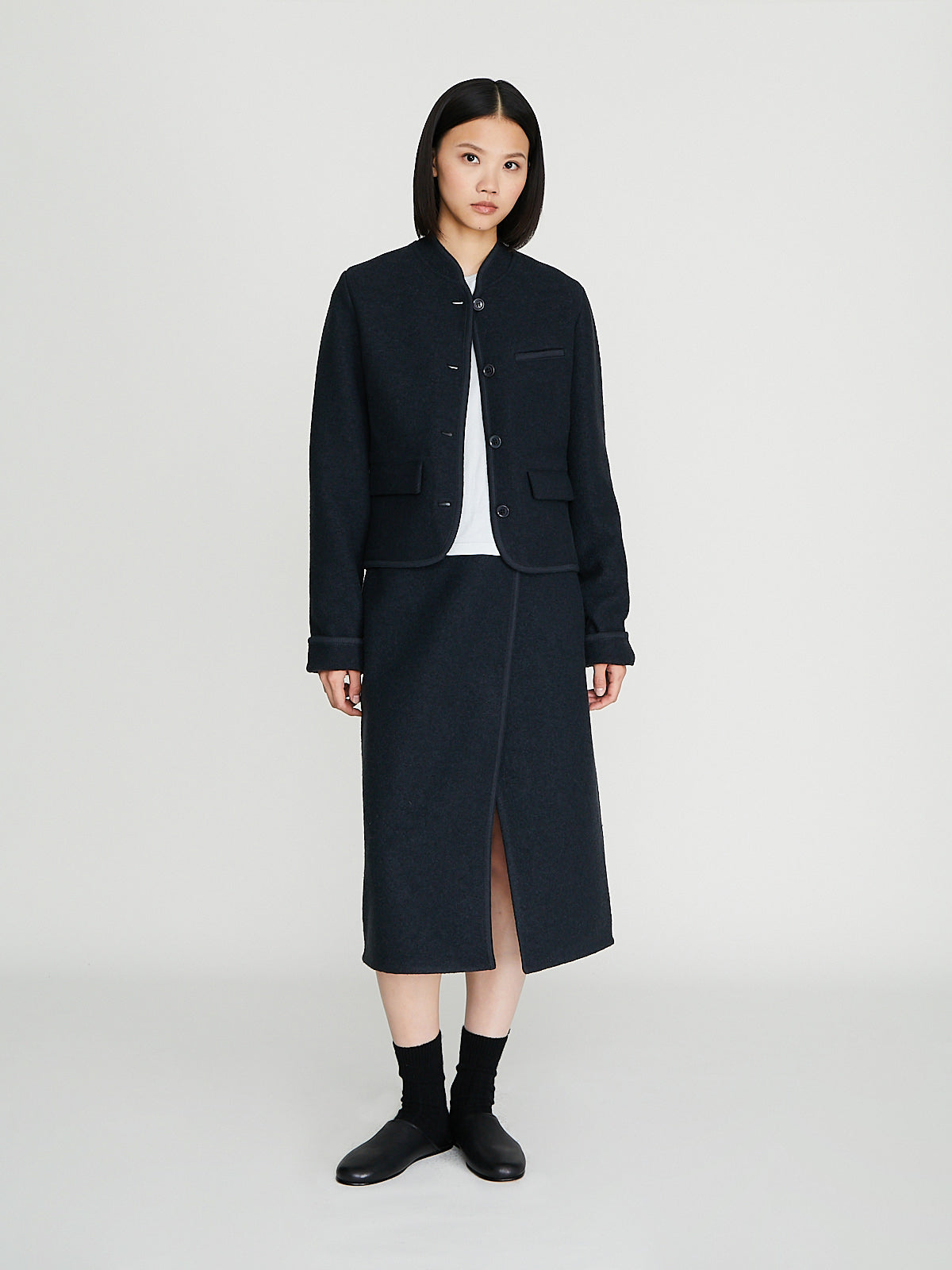 Cropped jacket in dark bluey grey felted wool. Banded collar and a concealed front button fastening. Flap pockets on the front and a single internal chest pocket. Woven wool border throughout. Boxy and regular fit. Unlined.