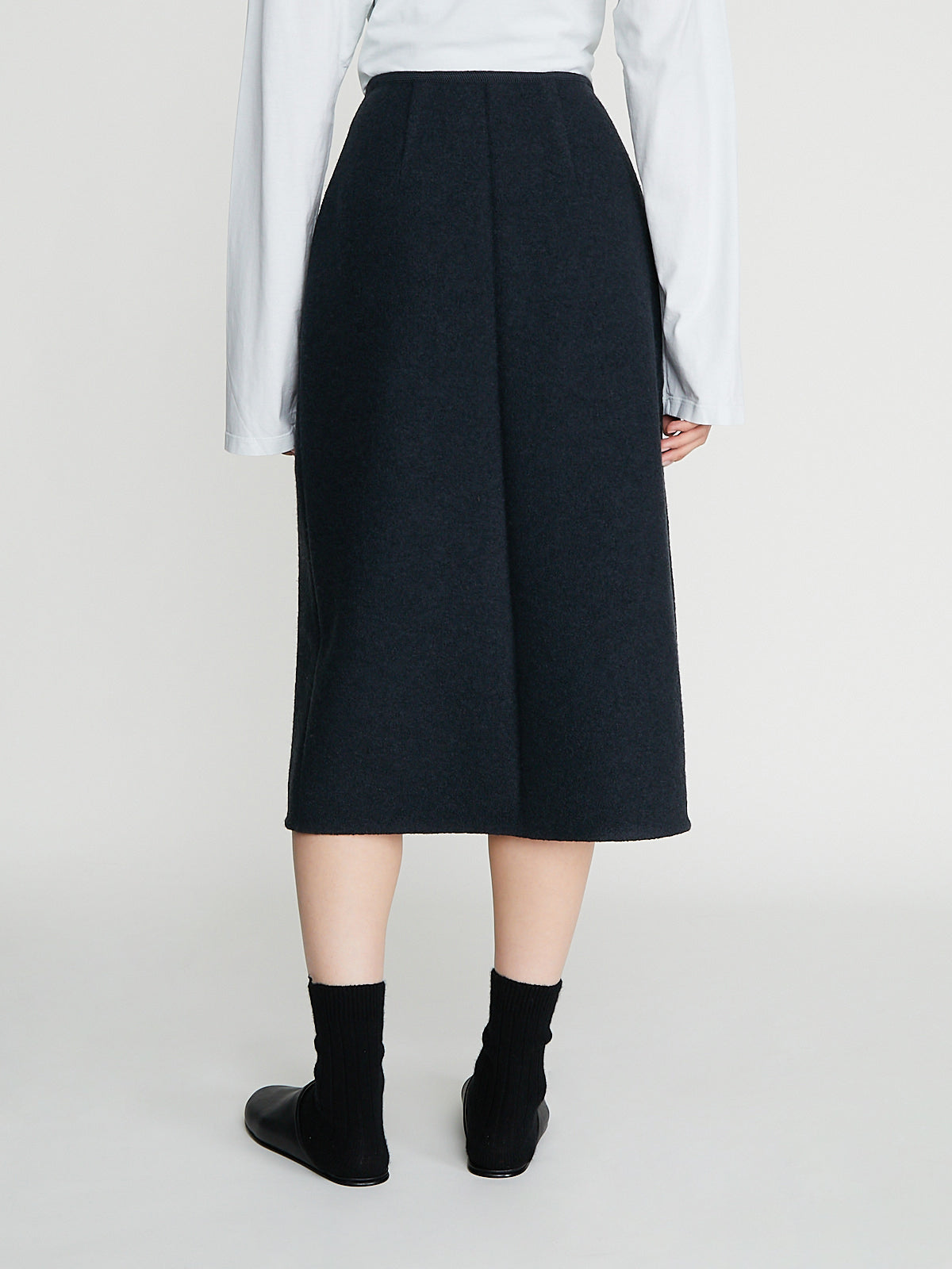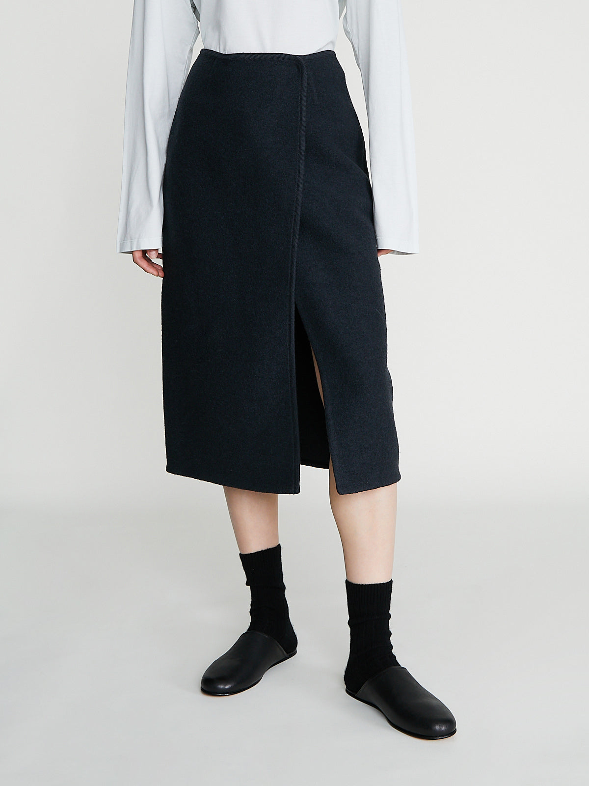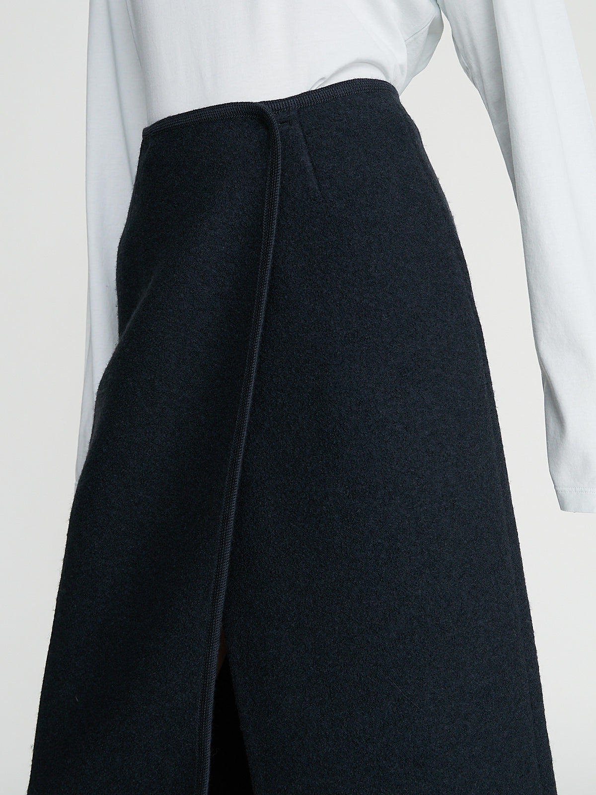 Wrap skirt made of lightweight dark bluey grey wool, woven like a knit and felted like a Loden. Sits at the waist and a double breasted overlapped closure with two hidden corozo nut-fruit buttons.