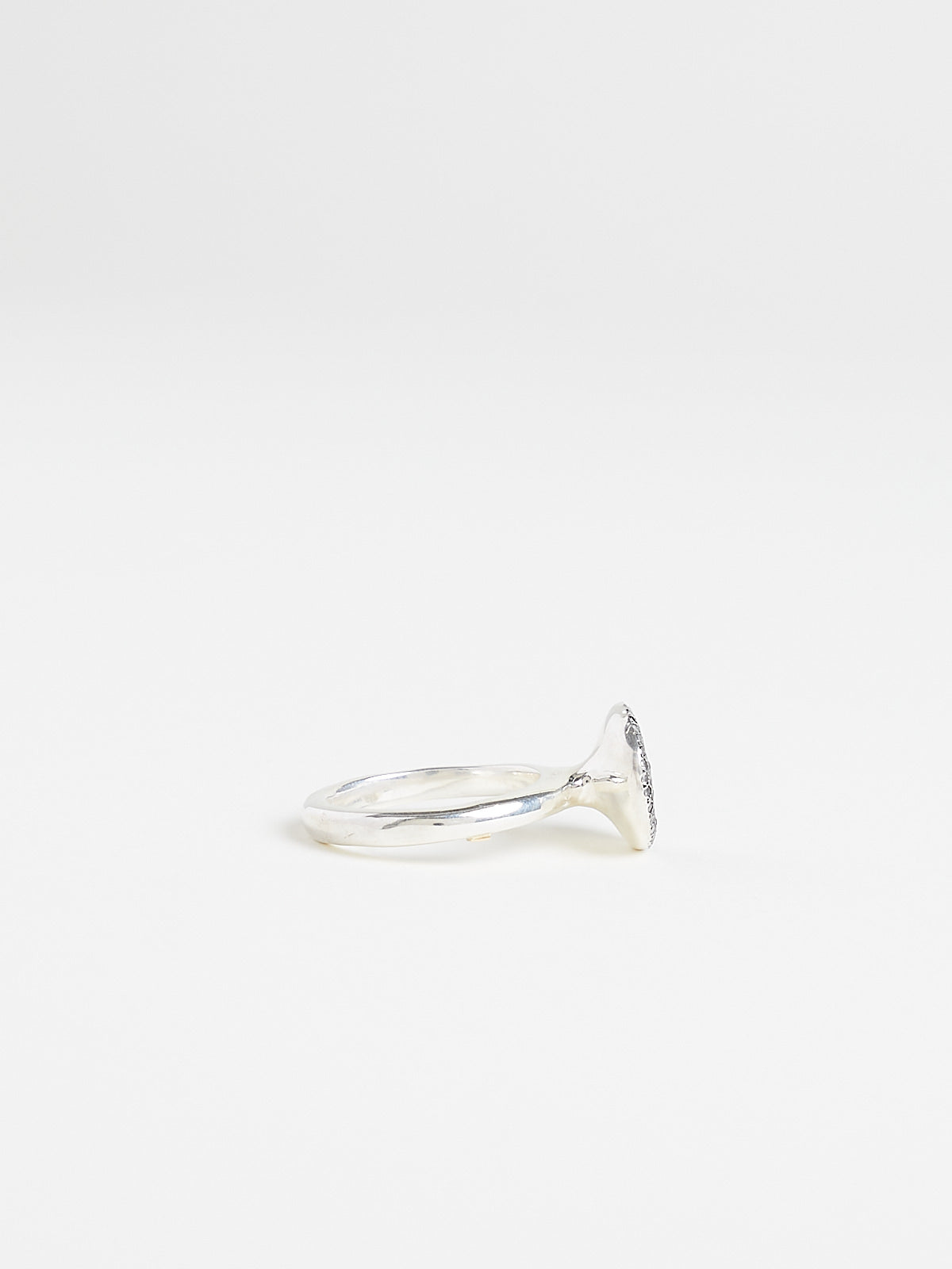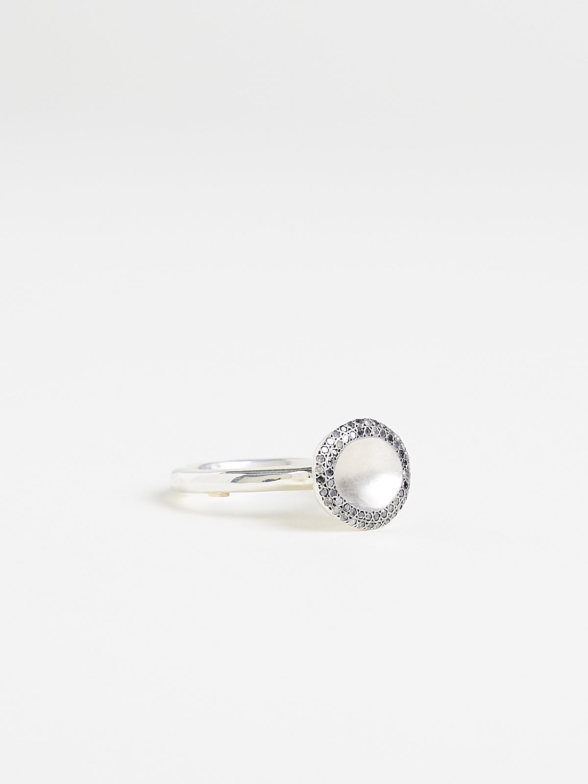 Handmade ring in sterling silver with a hammered concave centre surrounded by 58 icy grey pavé diamonds (0.33ct).