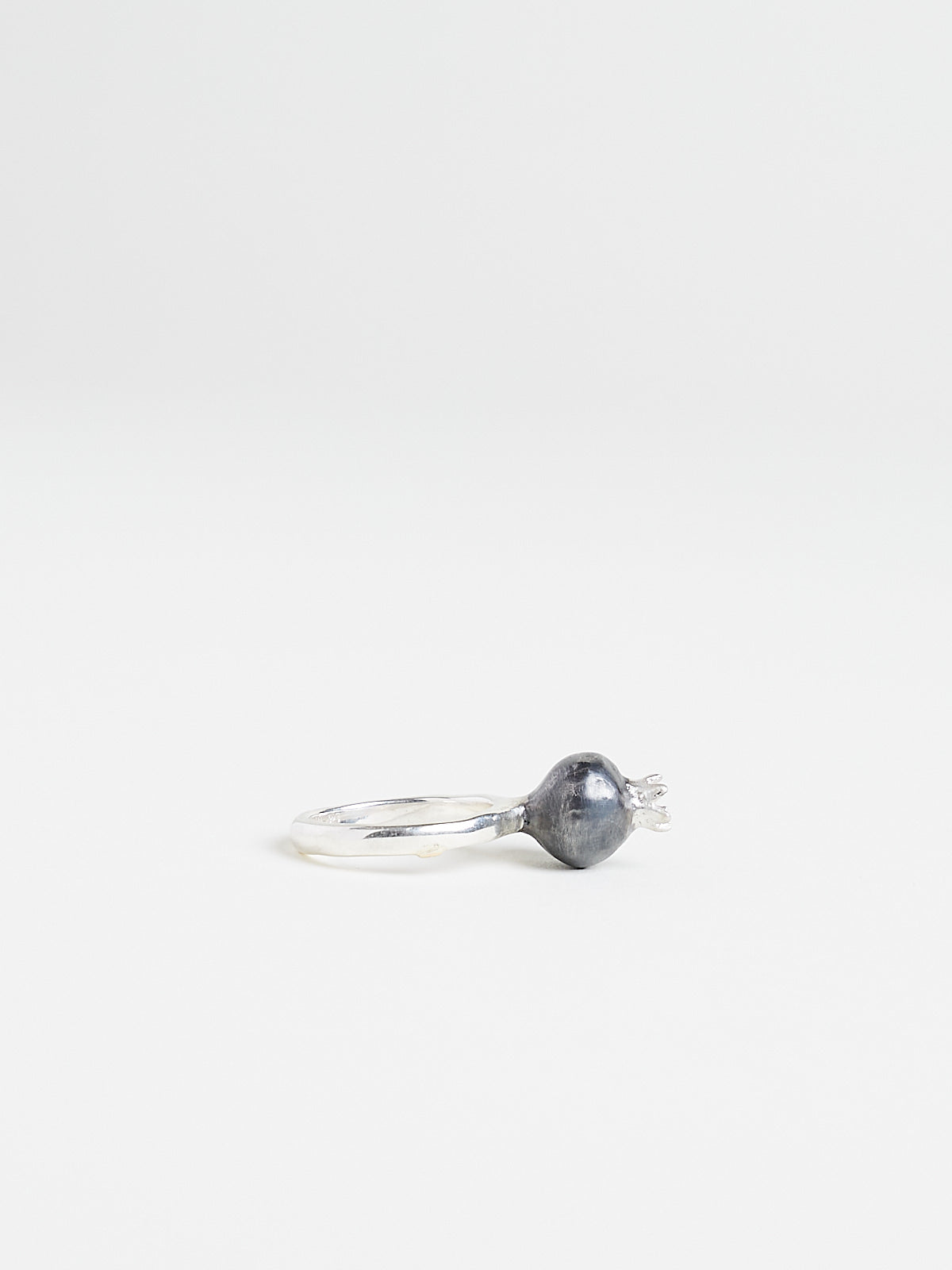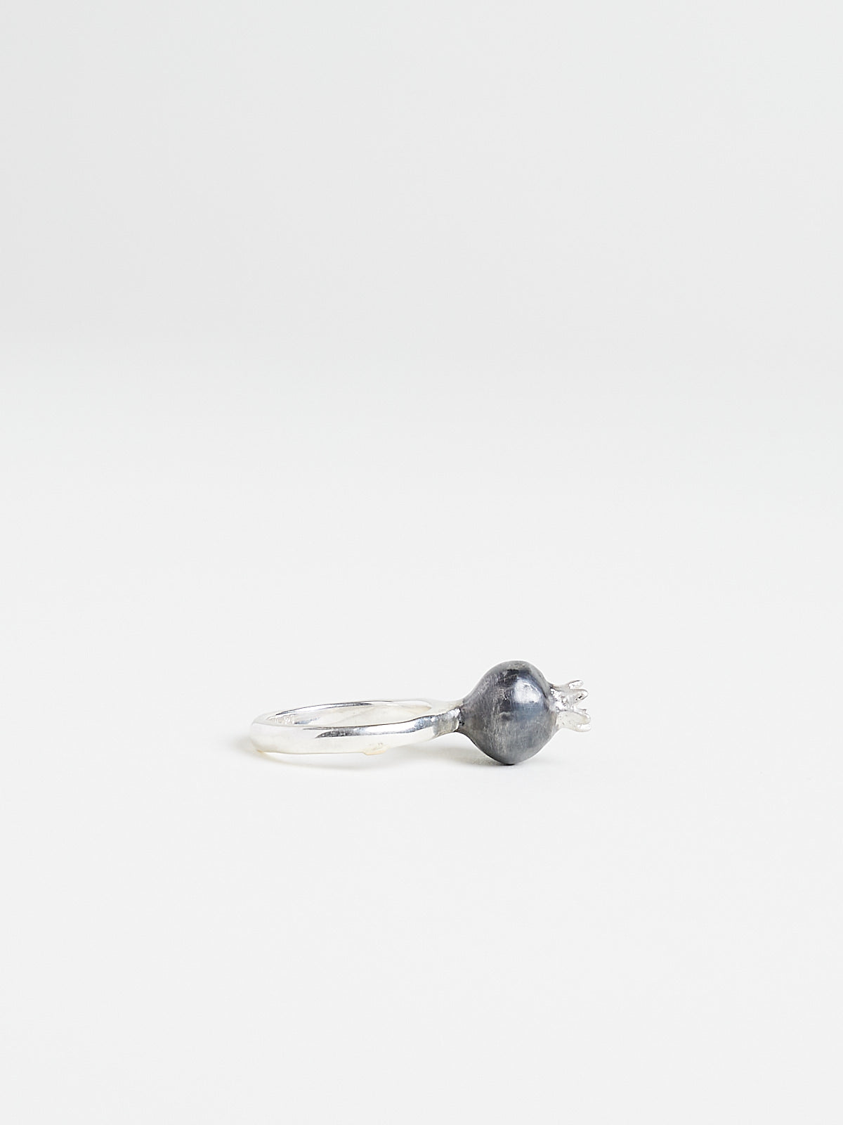 Handmade ring in sterling silver with a pomegranate in oxidised sterling silver.