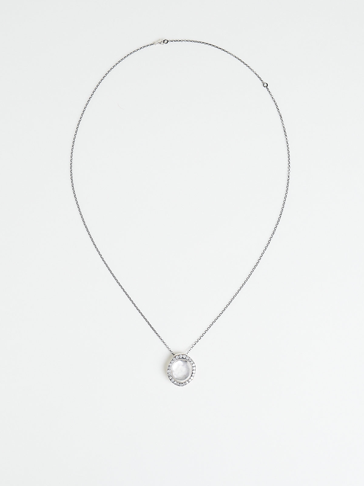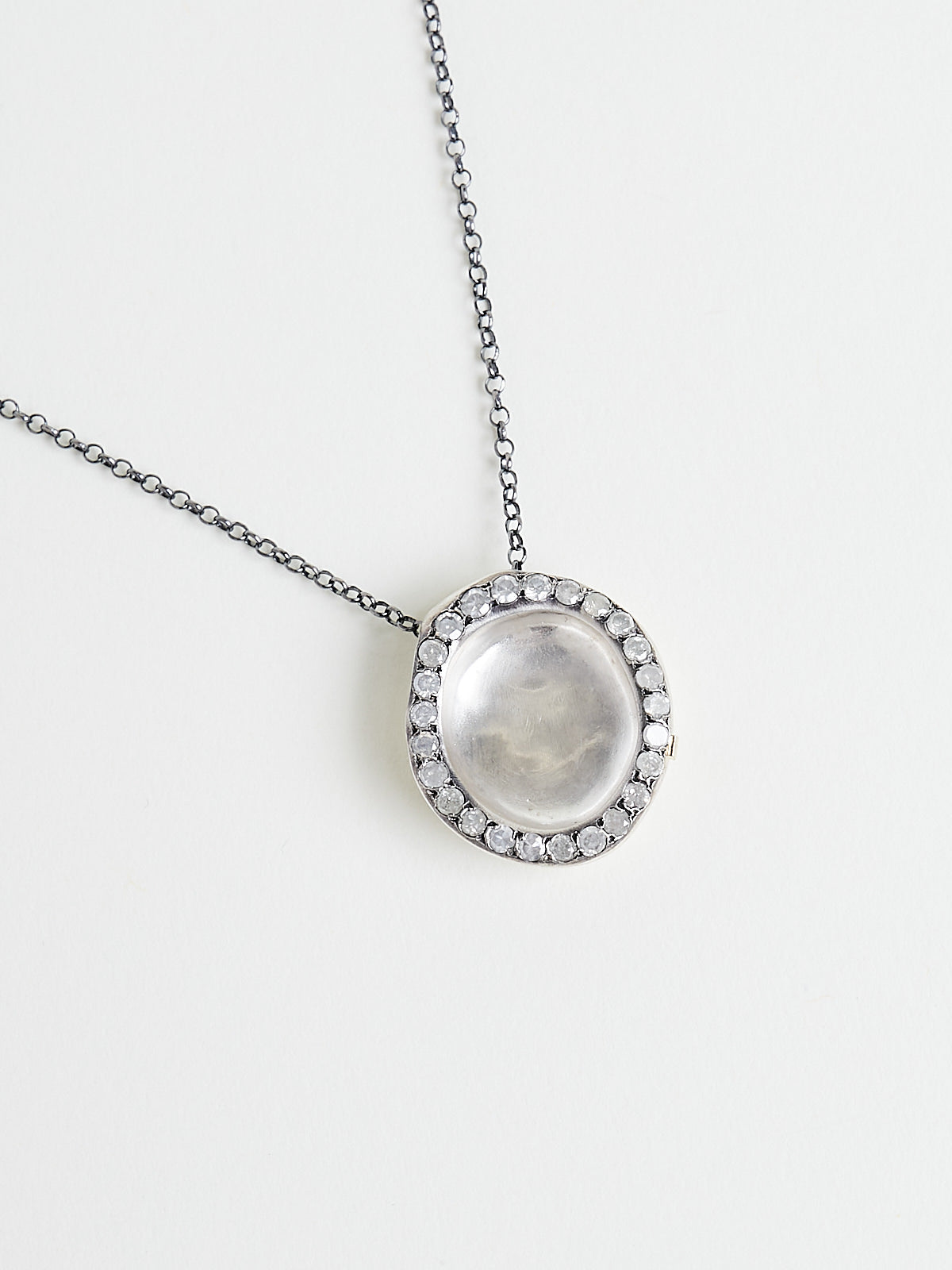 Handmade necklace in sterling silver with a delicate chain and a round concave pendant encrusted with 24 icy white pavé diamonds(1.65ct).