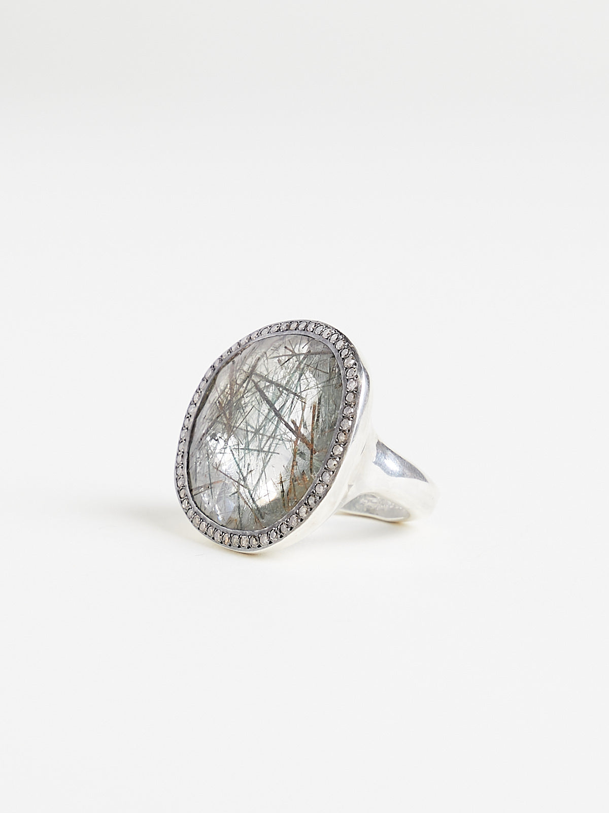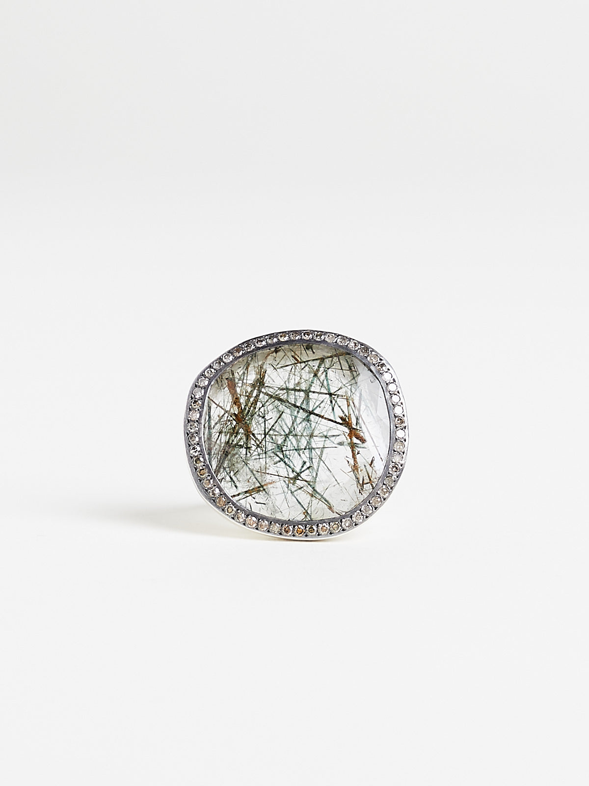 Handmade chunky ring in sterling silver with a 19.73ct green rutilated quartz surrounded by 51 cognac pavé diamonds (0.7ct).