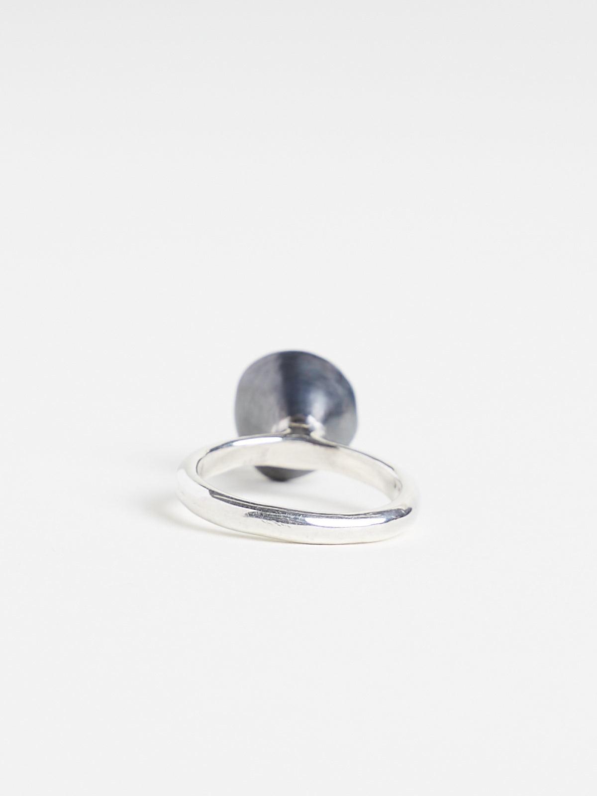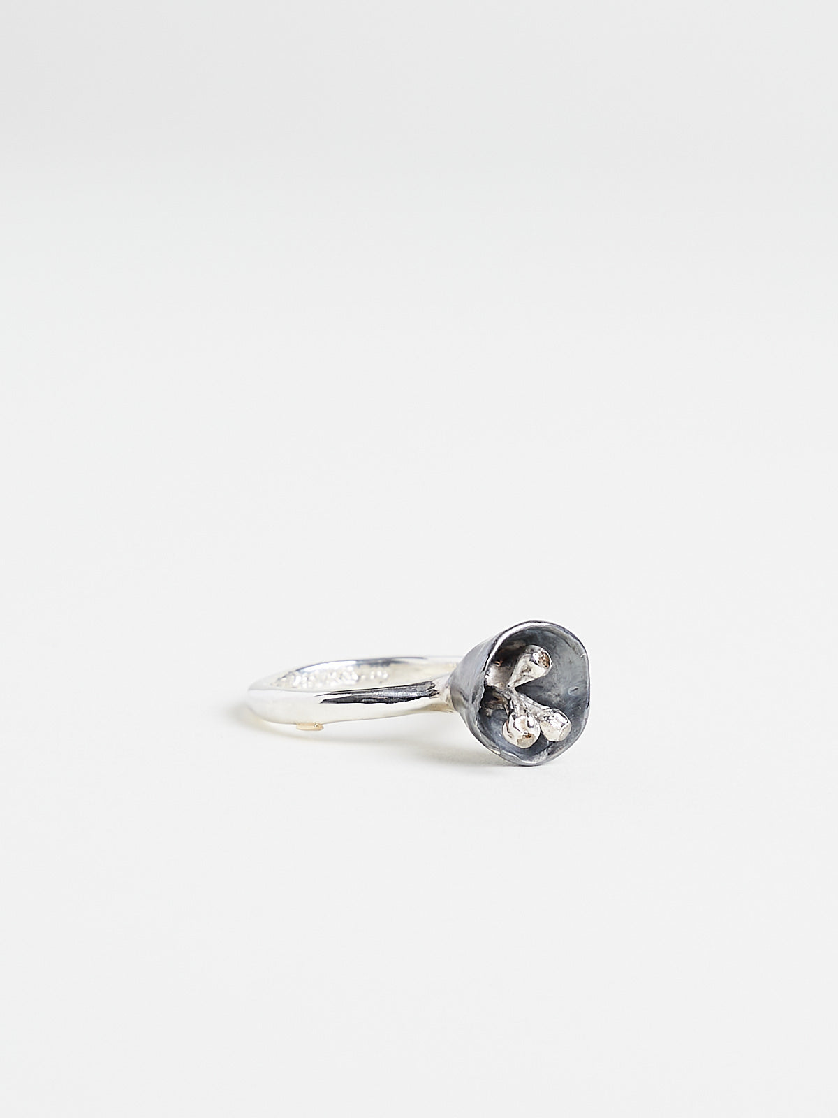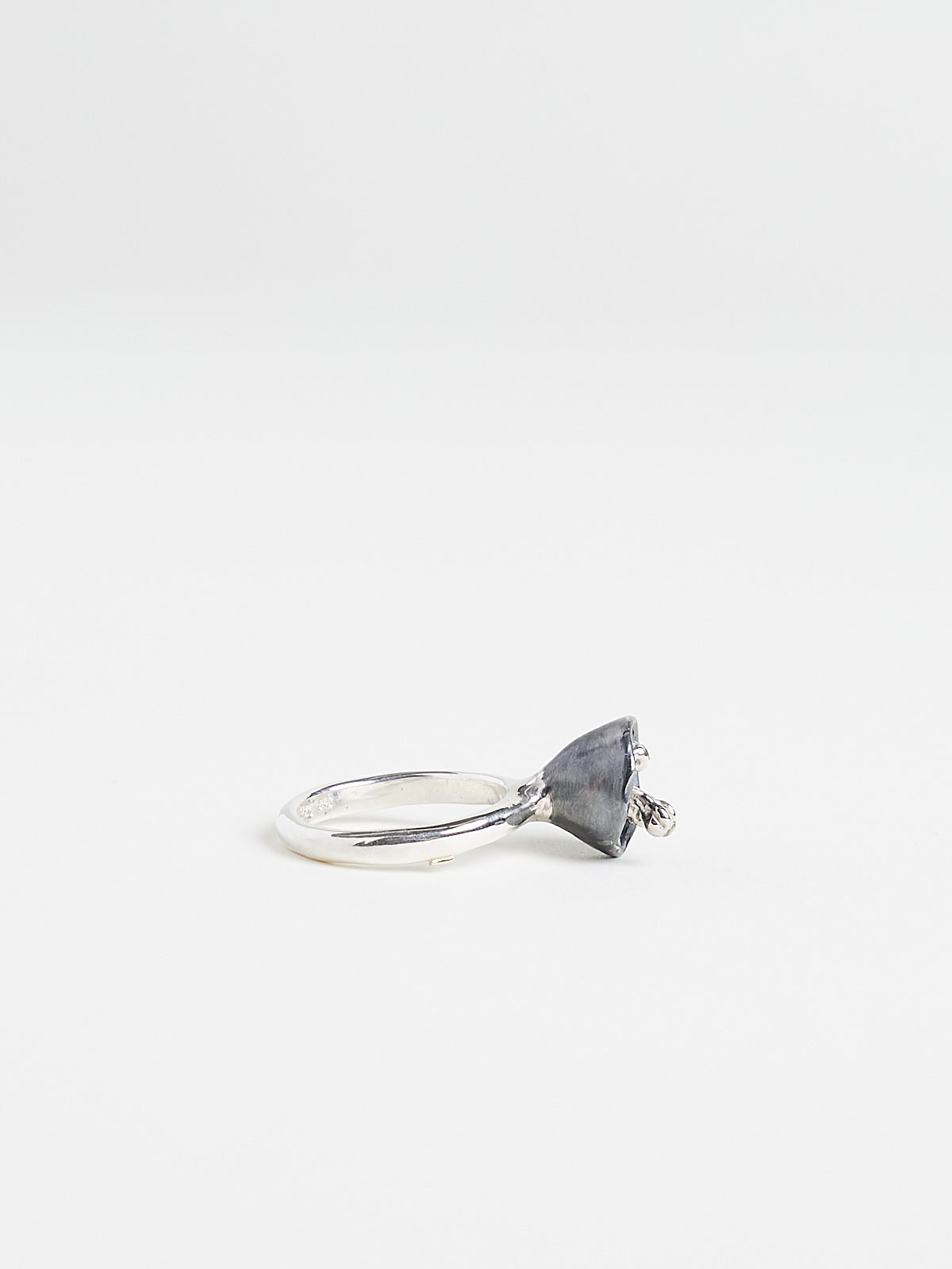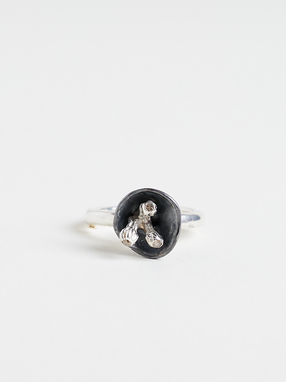 Handmade ring in sterling silver with an oxidised flower-like detail encrusted with 3 cognac pavé diamonds (0.09ct).