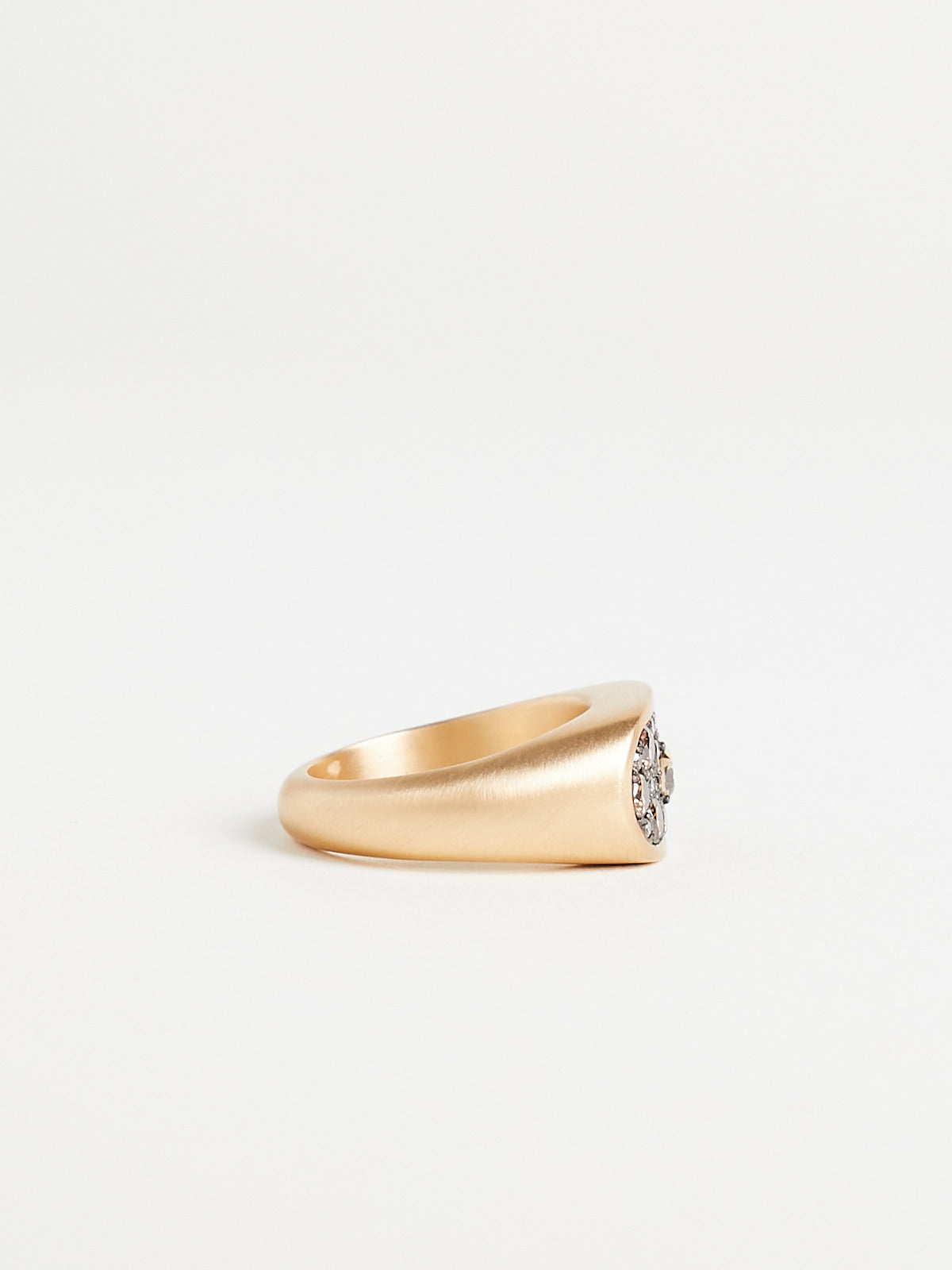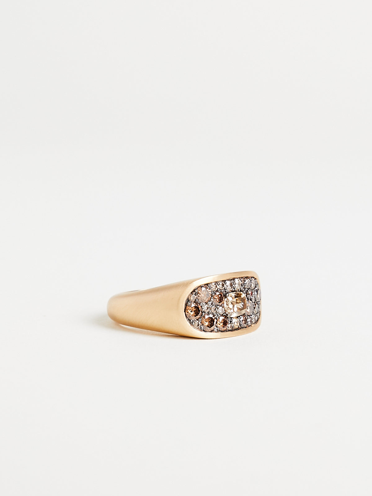 Ring in matte 18k single mine origin yellow gold with a central cushion-cut brown diamond and mosaic-set round melee diamonds (approximately 1.4cts).