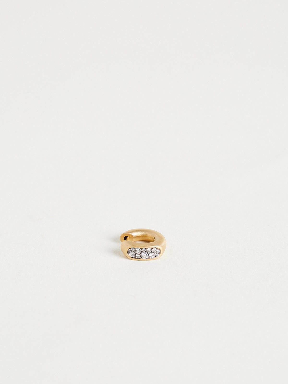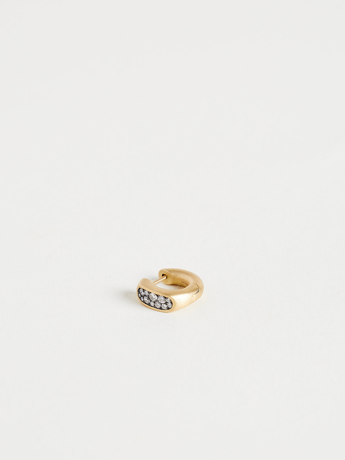 Handmade arc huggie hoops in 18k yellow gold encrusted with white diamonds. Features a hinged backing.