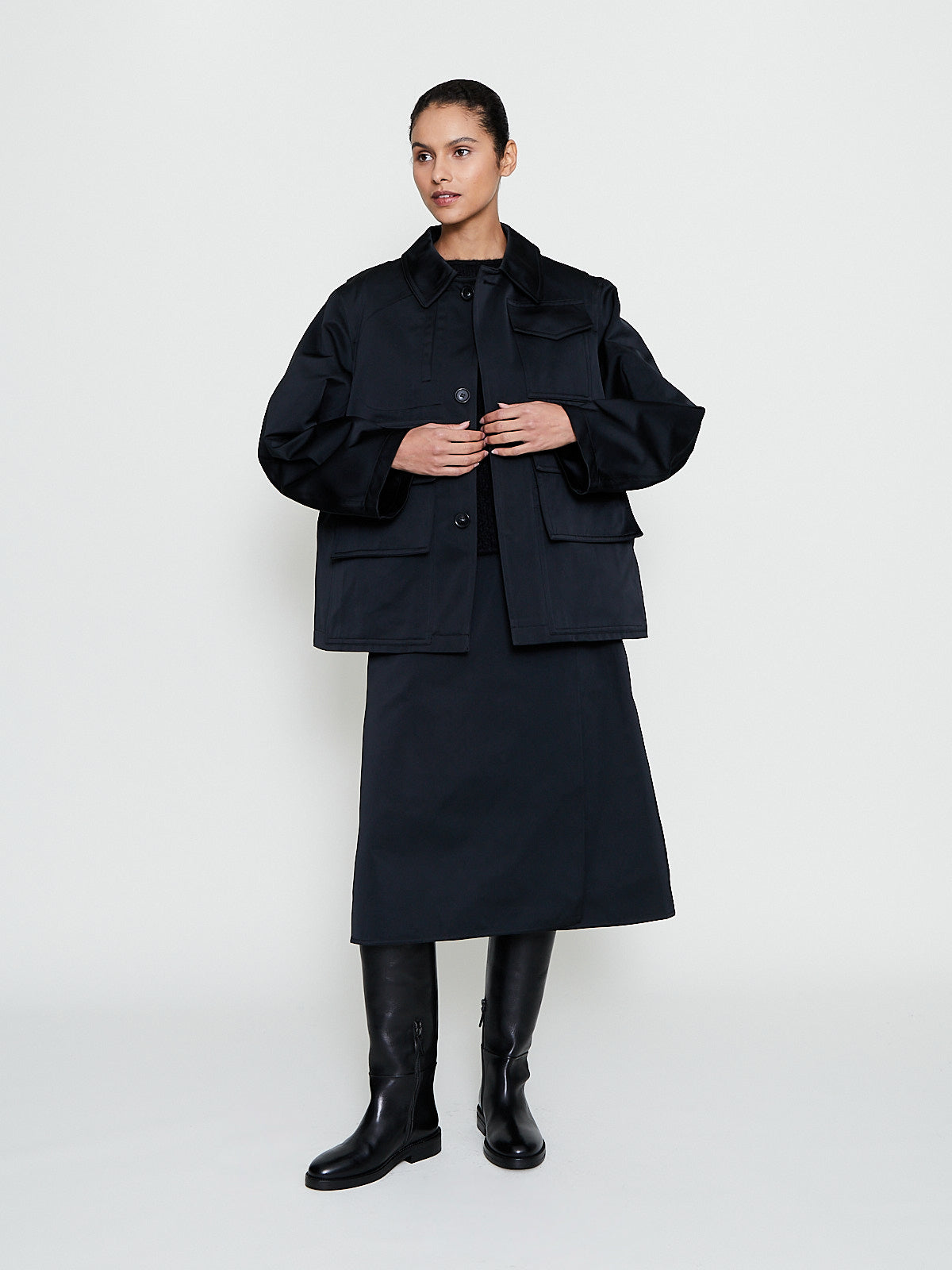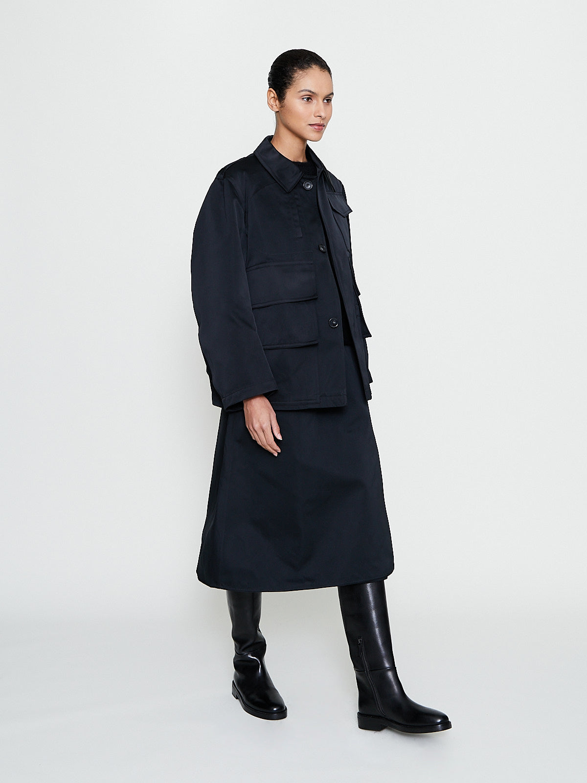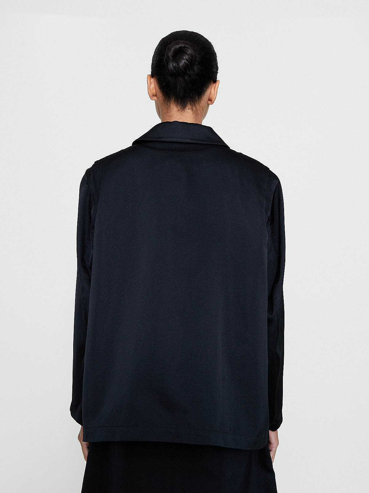 Oversized jacket in black polyester satin. Spread collar with a throat latch, concealed front button fastening and long sleeves. Large flap pockets on the front and a single chest pocket with a flap. Boxy fit.
