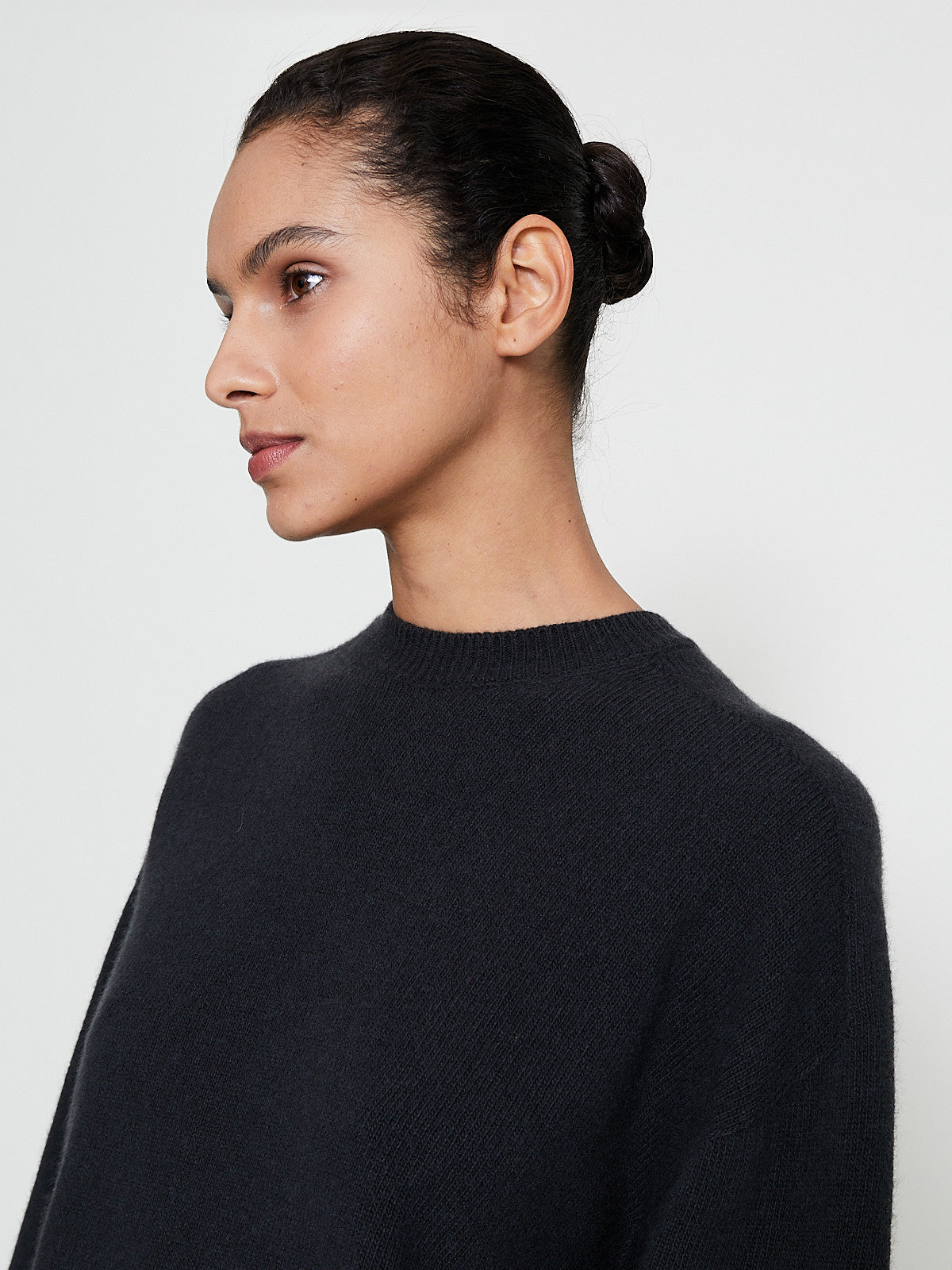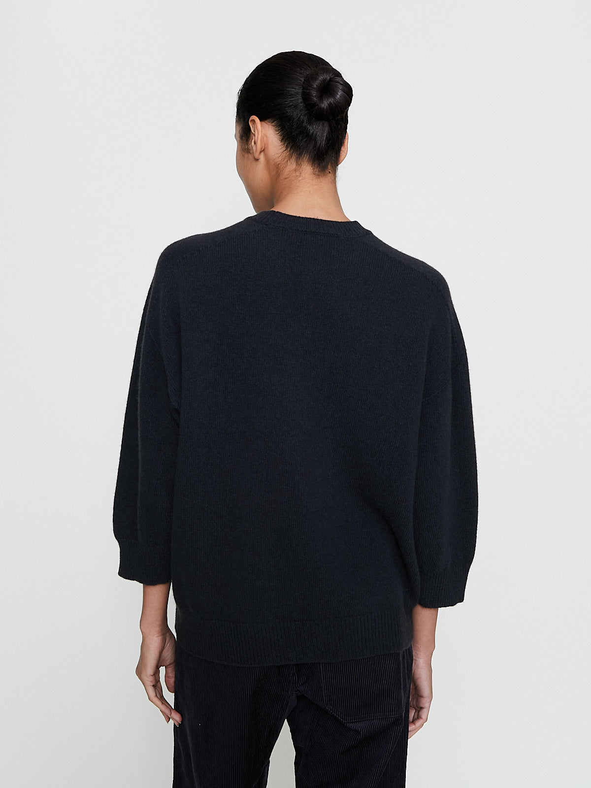 Relaxed knitted sweater in dark grey superfine wool. Crewneck and 3/4 half raglan sleeves with a dropped shoulder. Rib detail around the neck, cuffs and bottom hem.