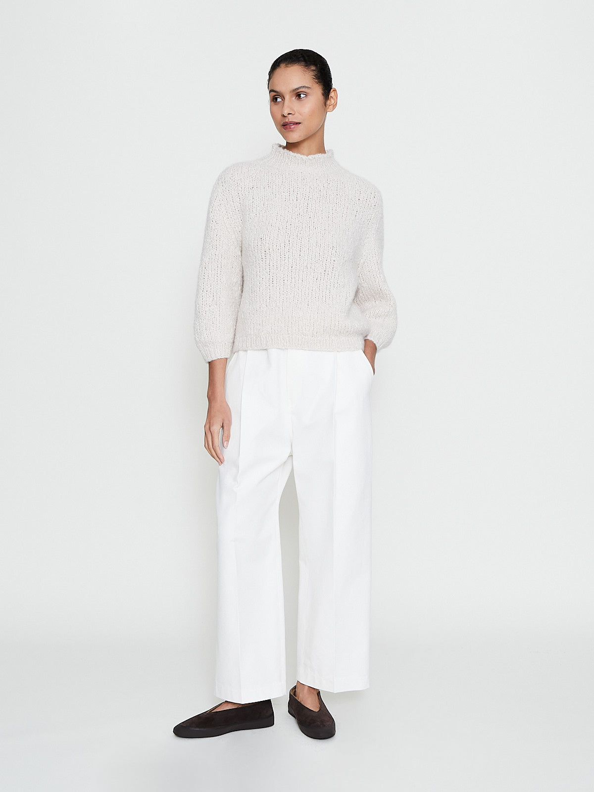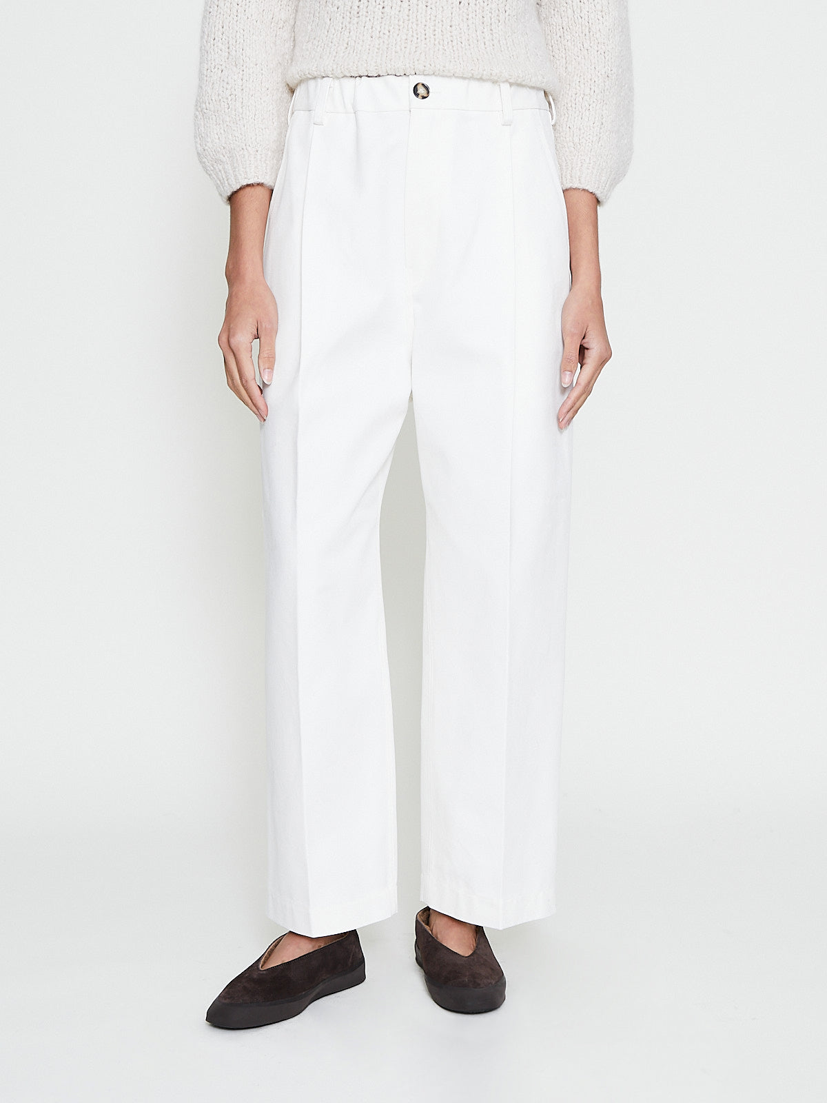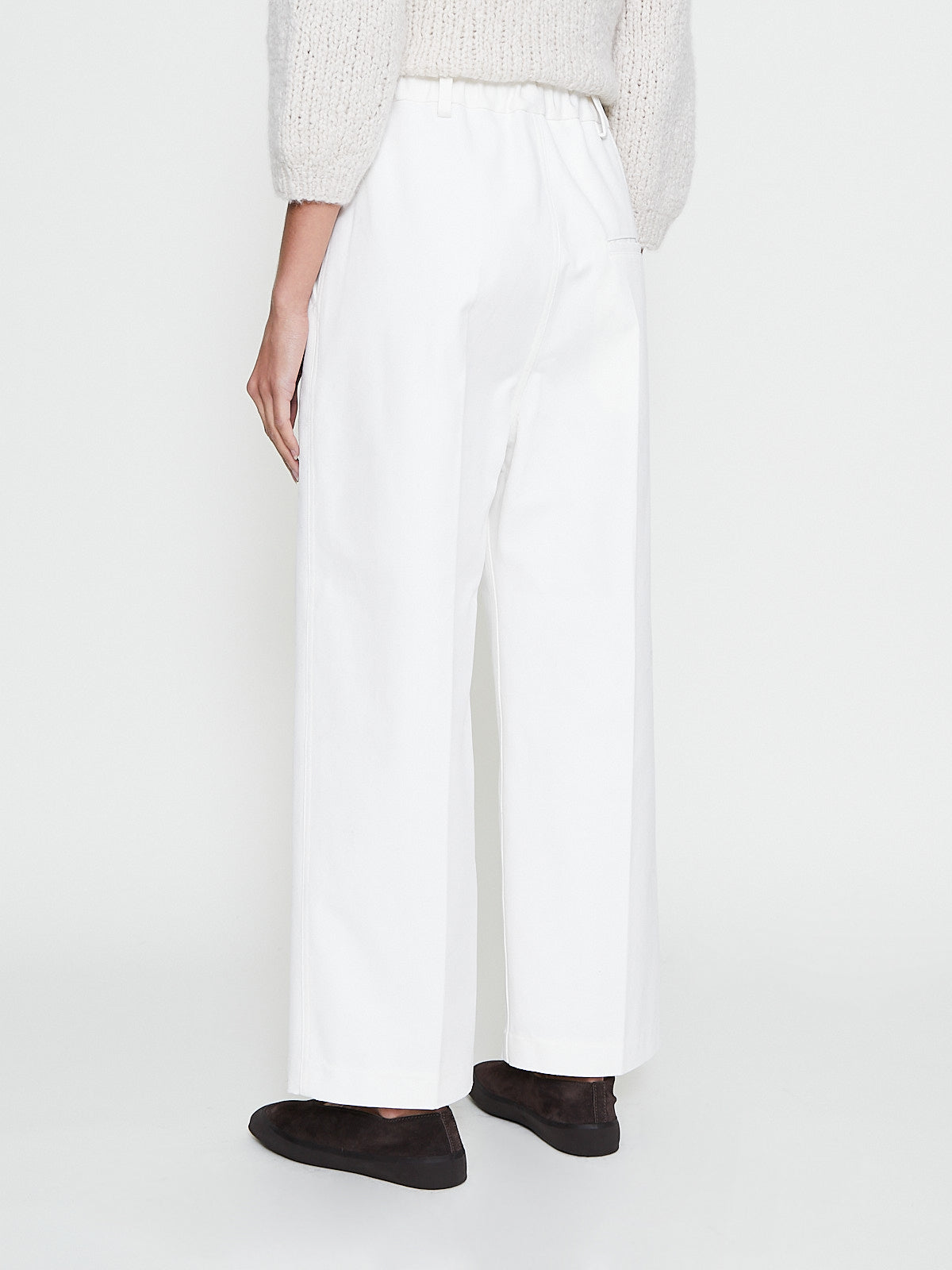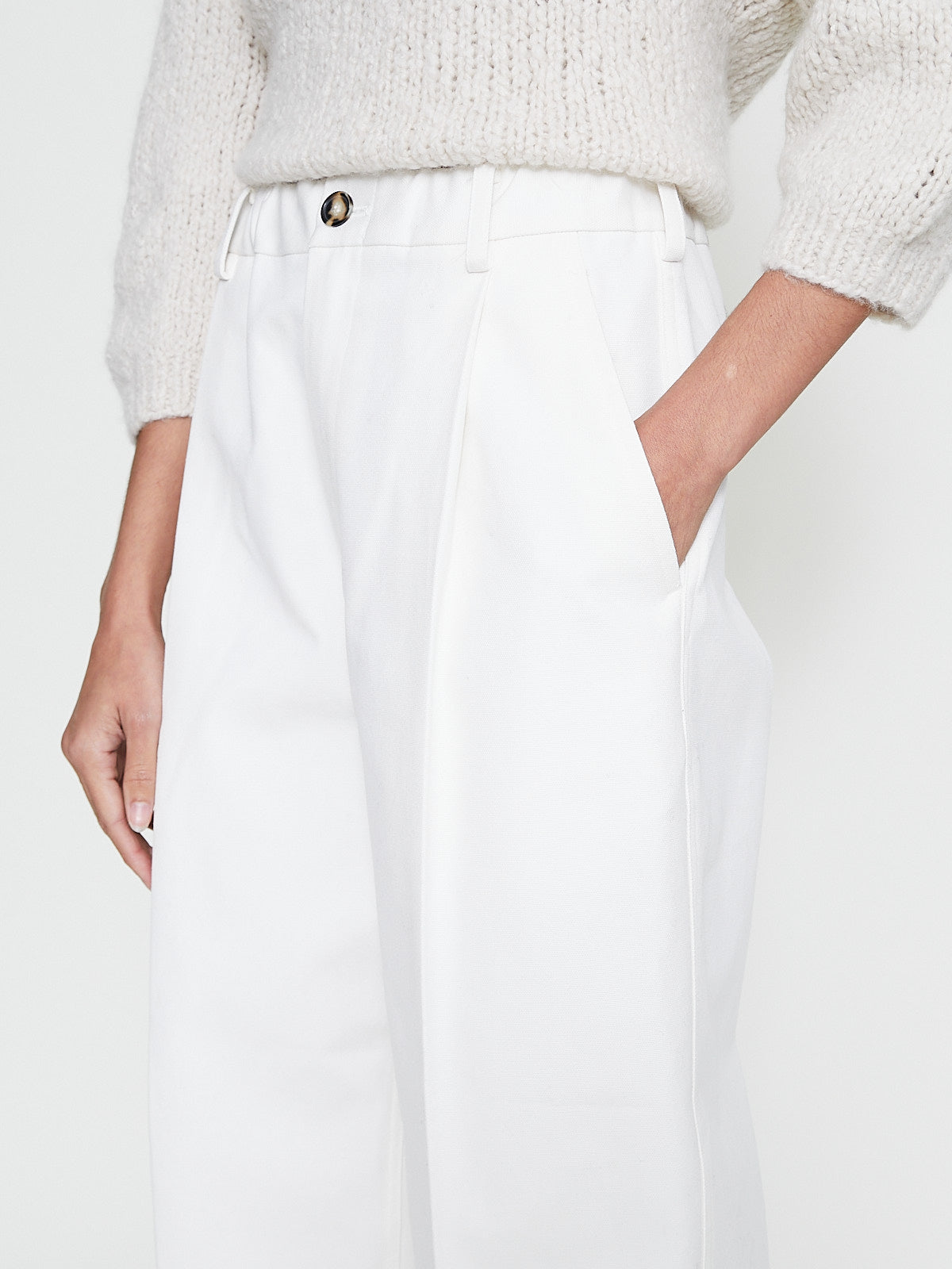 Oversized pants in off white heavy cotton canvas. Pull-on style with an elasticated waistband, single button and zip fly. Belt loops and a pleated front.. Slash pockets on the front and a welted slip pocket on the back with a button fastening. Straight wide legs.