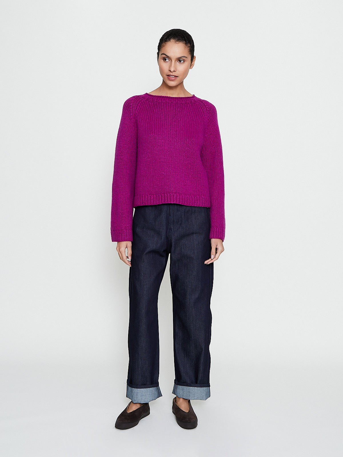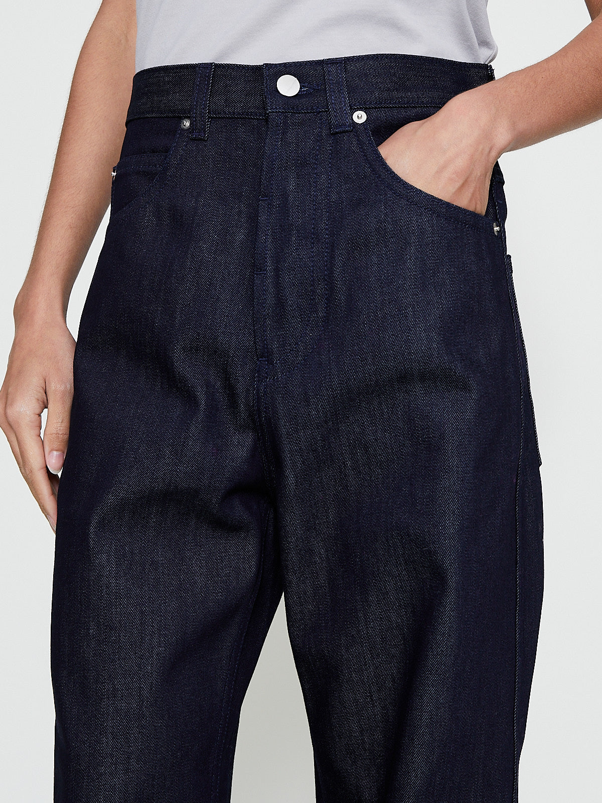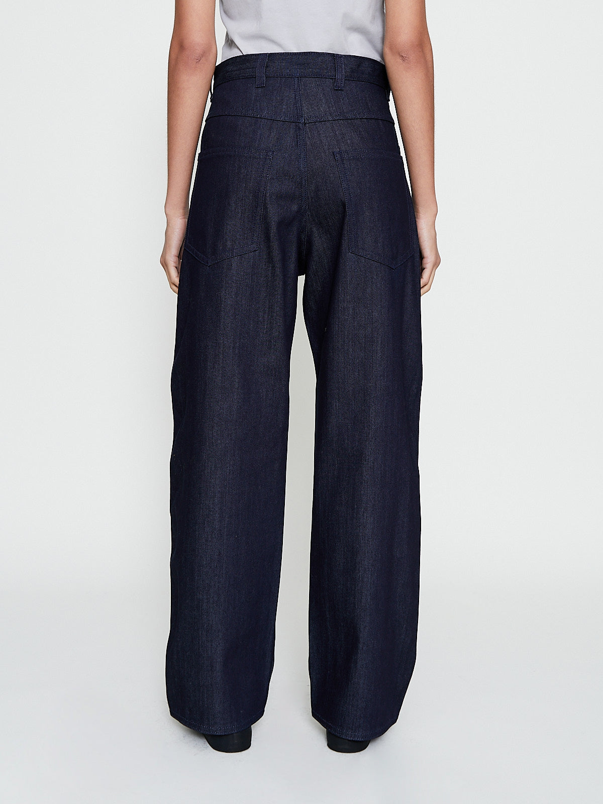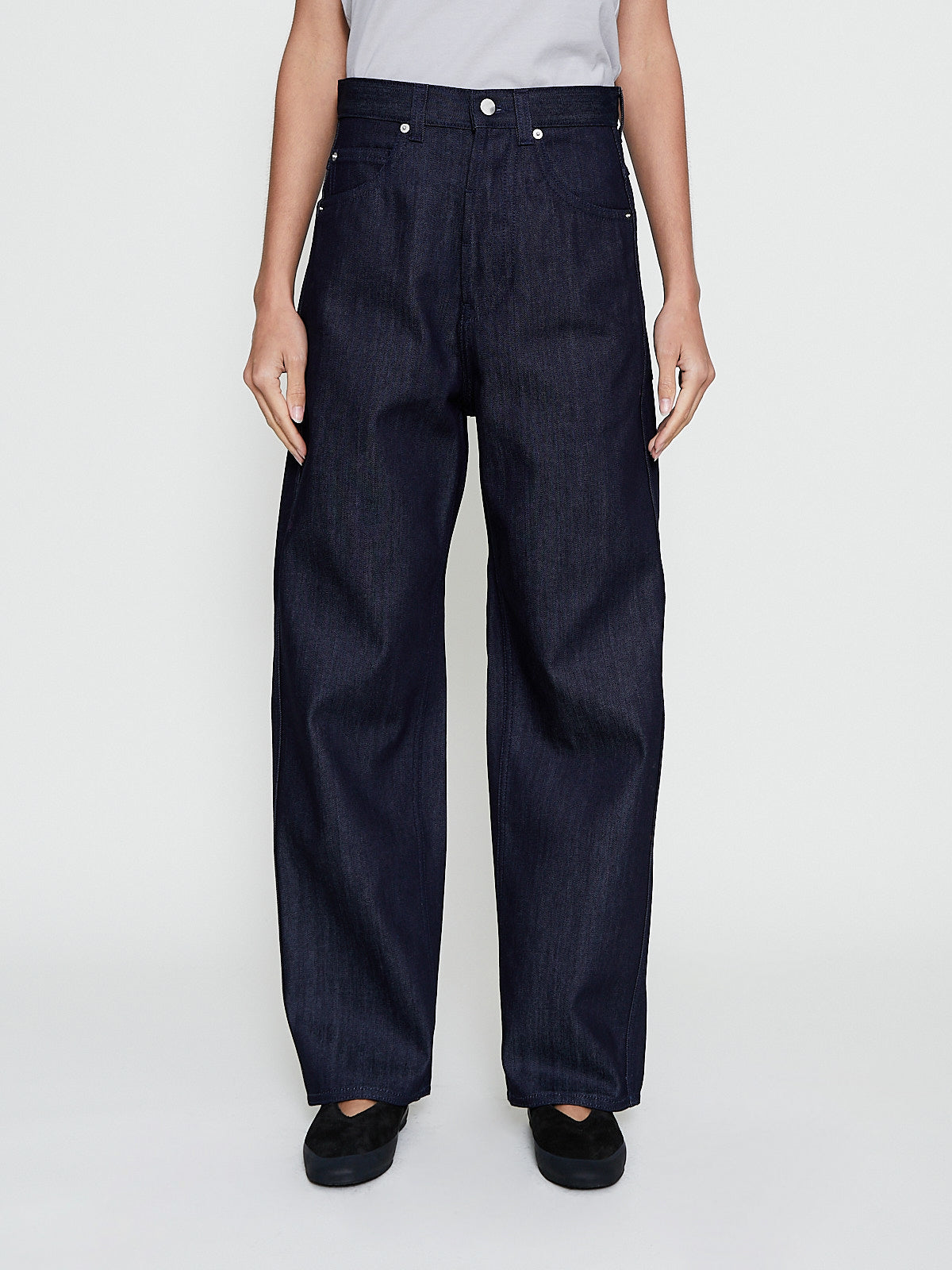 Oversized trouser in raw dark blue cotton denim. Sits low on the waist and a concealed button fly. Classic 5-pocket styling with rivet detailing. Scoop pockets on the front and patch pockets on the back. Features a back yoke and tone-on-tone topstitching. Wide straight leg.