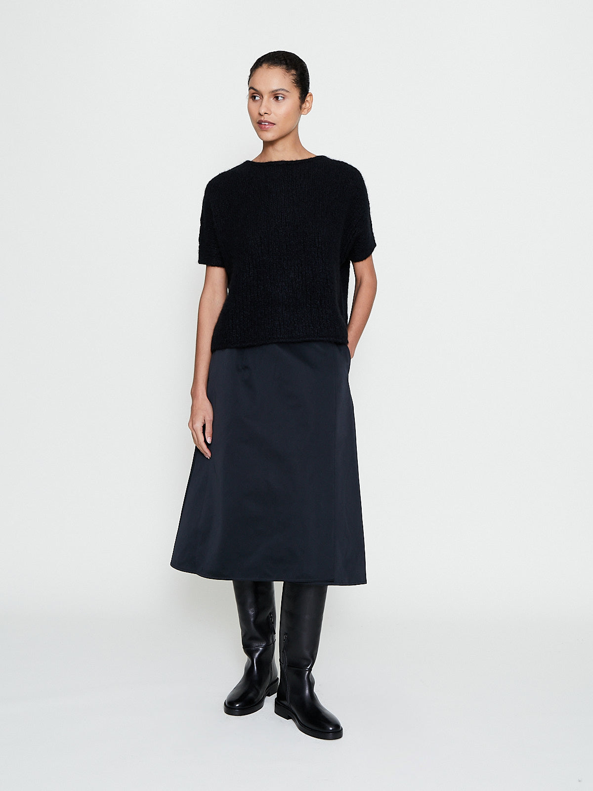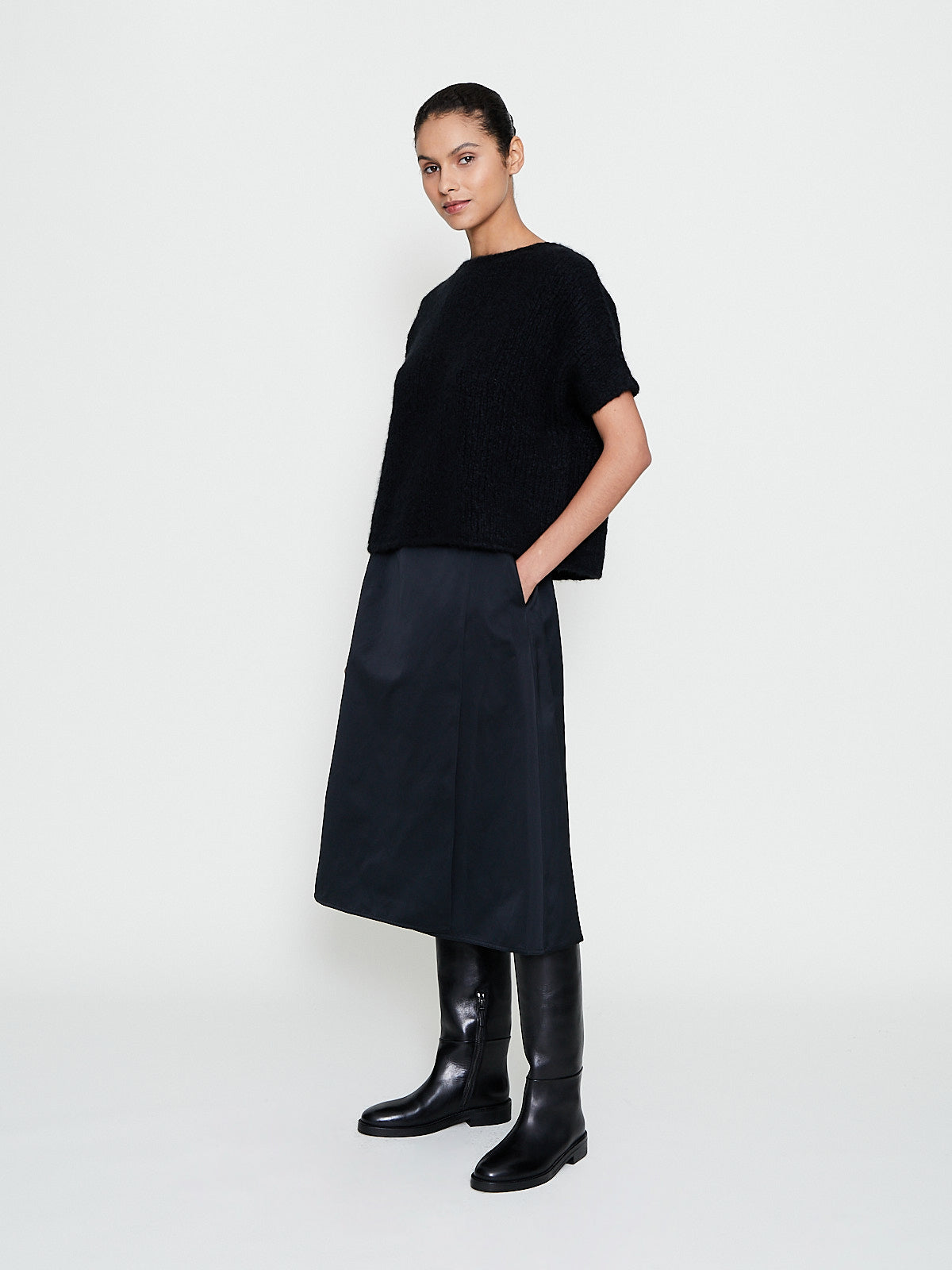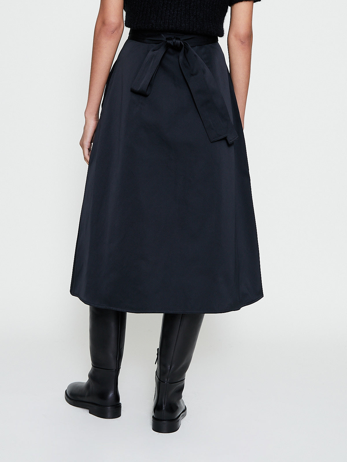 Wrap skirt in black polyester satin. Tie fastening on the waist and side seam pockets. Cuts below-the-knee. A-line silhouette.