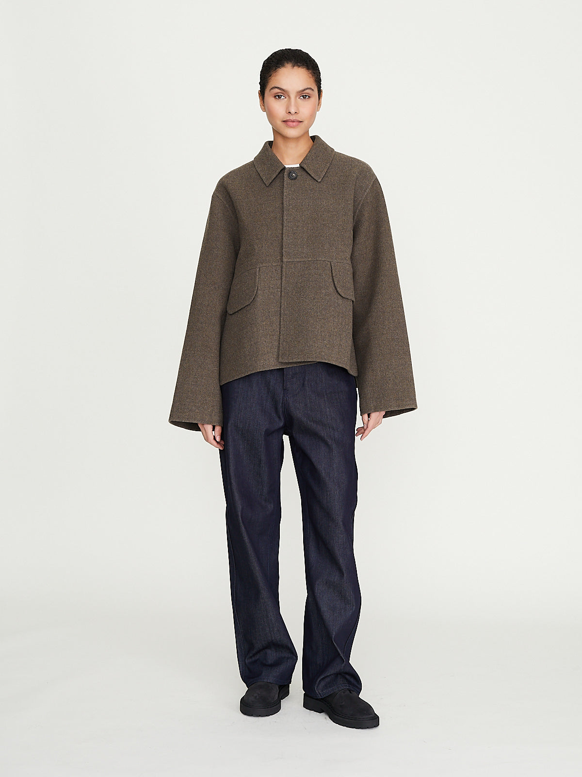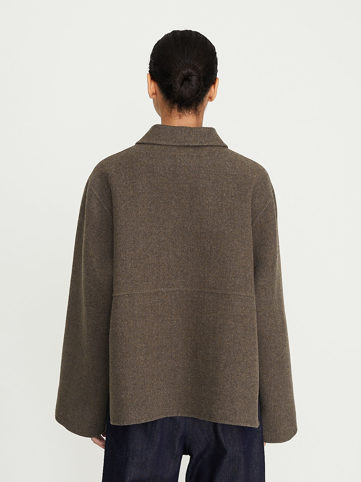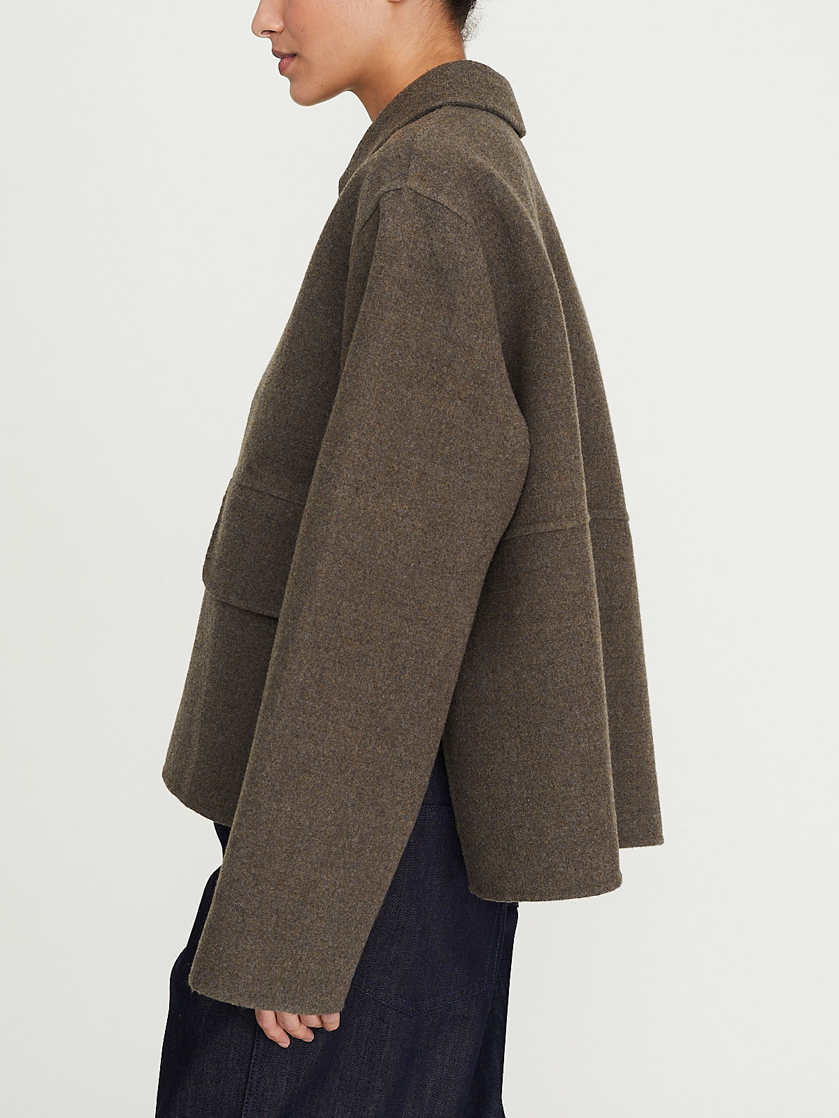 Boxy jacket in double-faced taupe wool/silk. Pointed collar, front single button fastening and long wide sleeves with a dropped shoulder. Flap pockets on the front and high side slits.