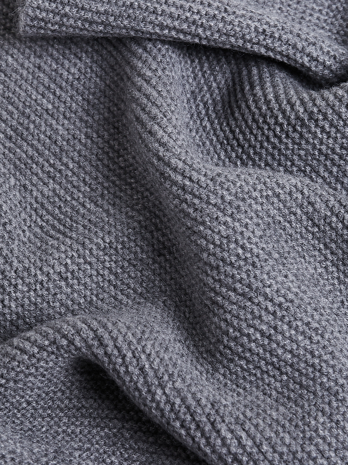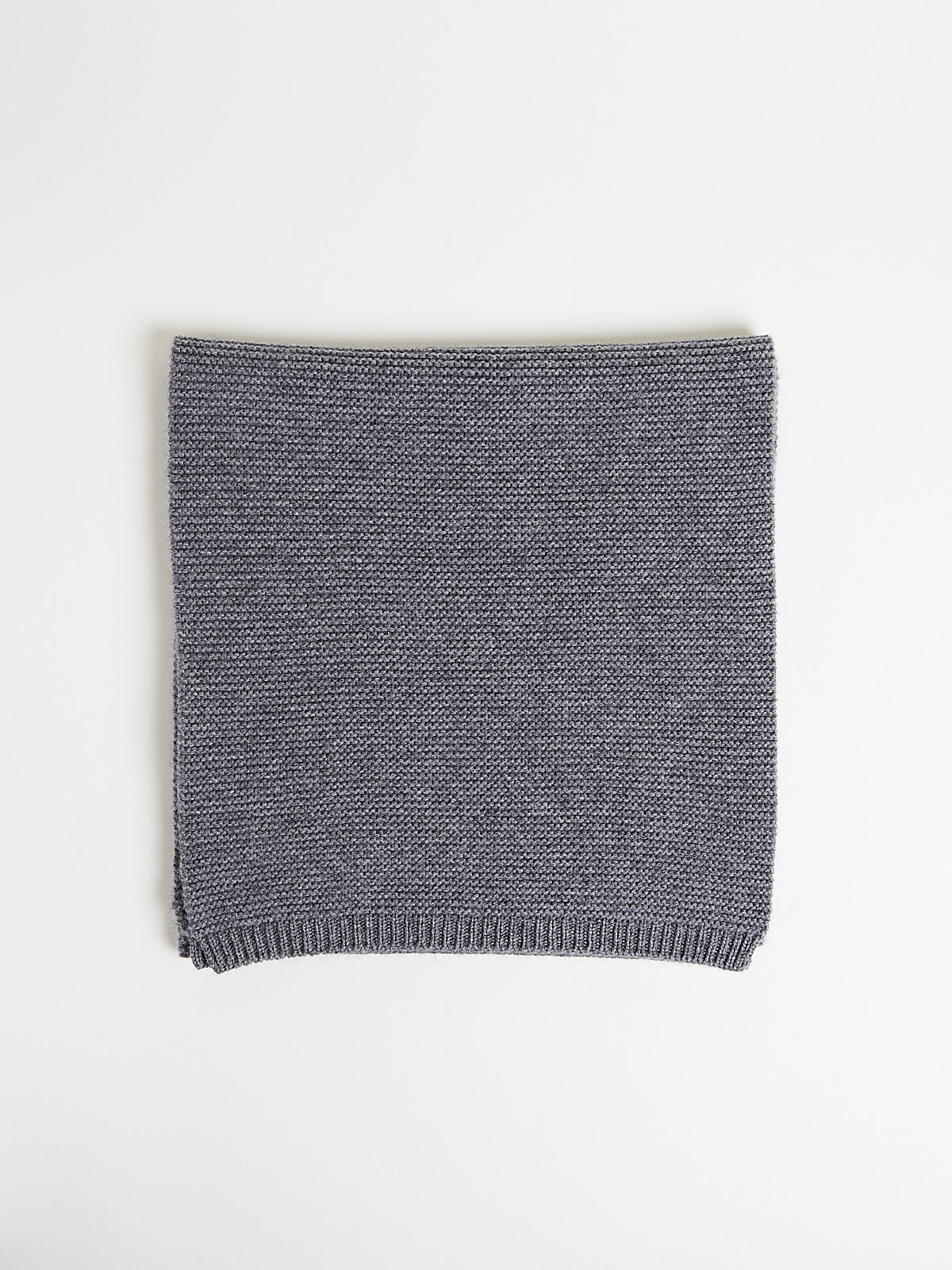 Knitted scarf in grey melange cashmere with a garter stitch. Rib detail at the edges.