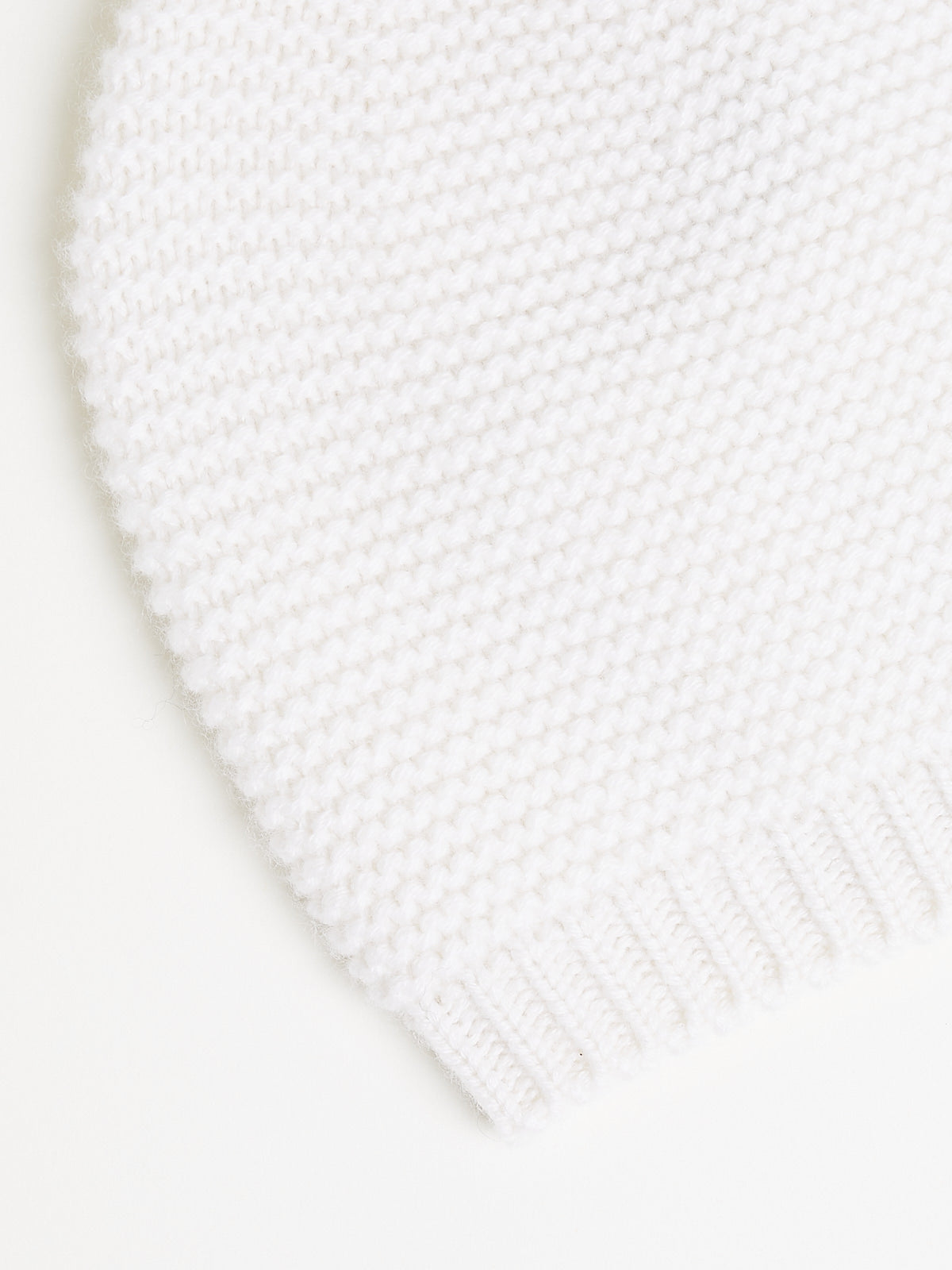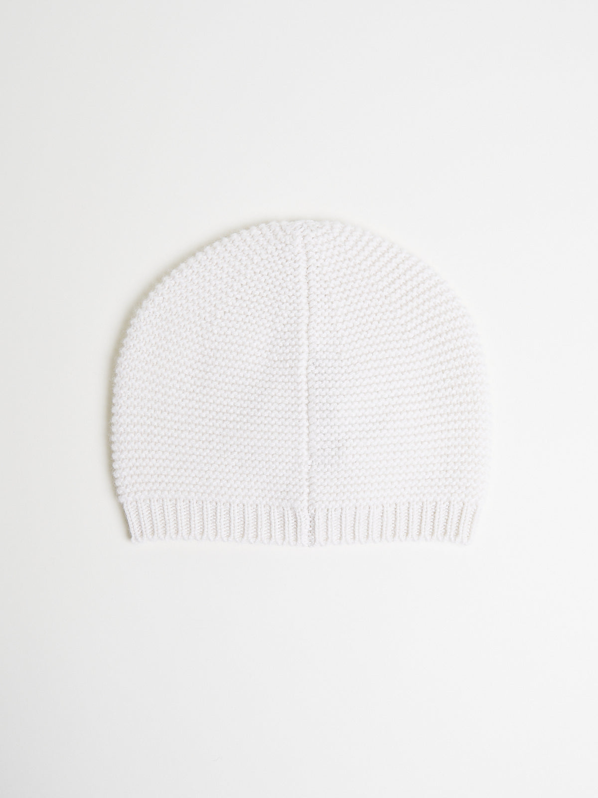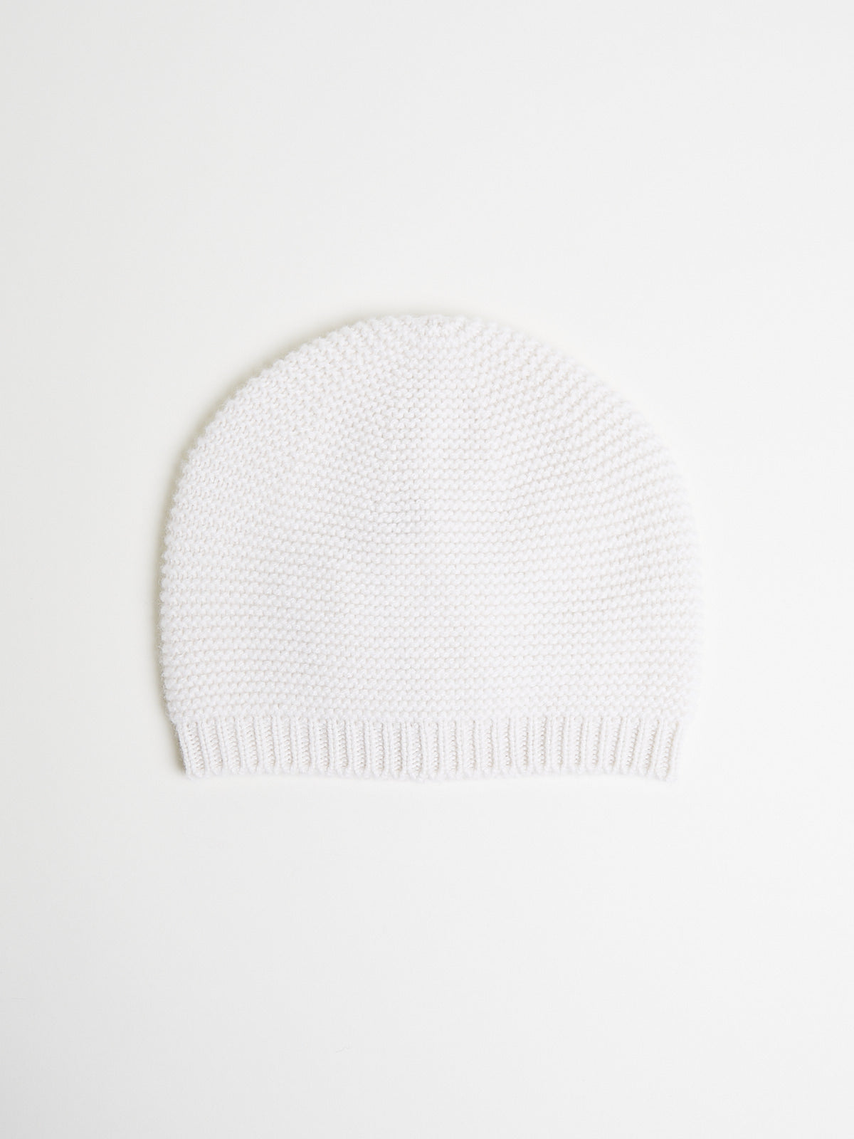Knitted beanie in ivory cashmere with a garter stitch. Features a ribbed cuff.