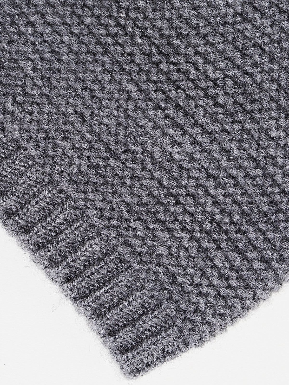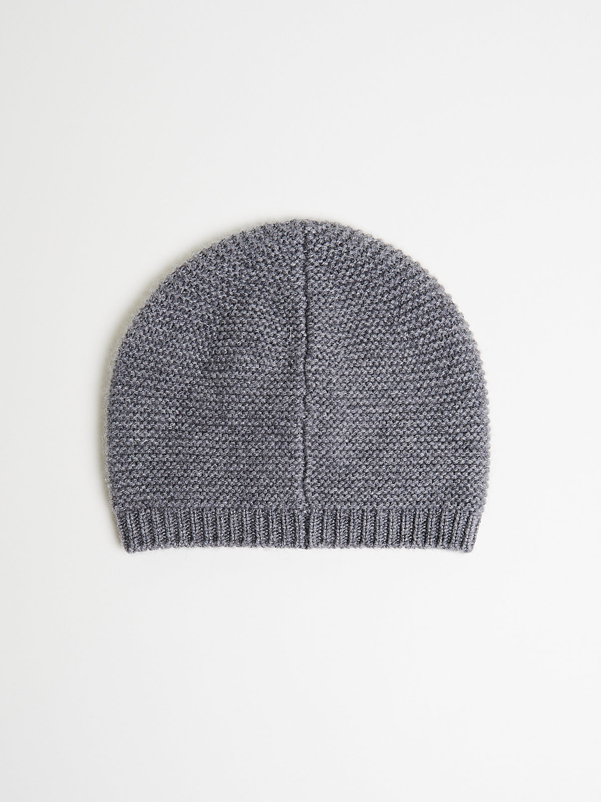 Knitted beanie in grey melange cashmere with a garter stitch. Features a ribbed cuff.
