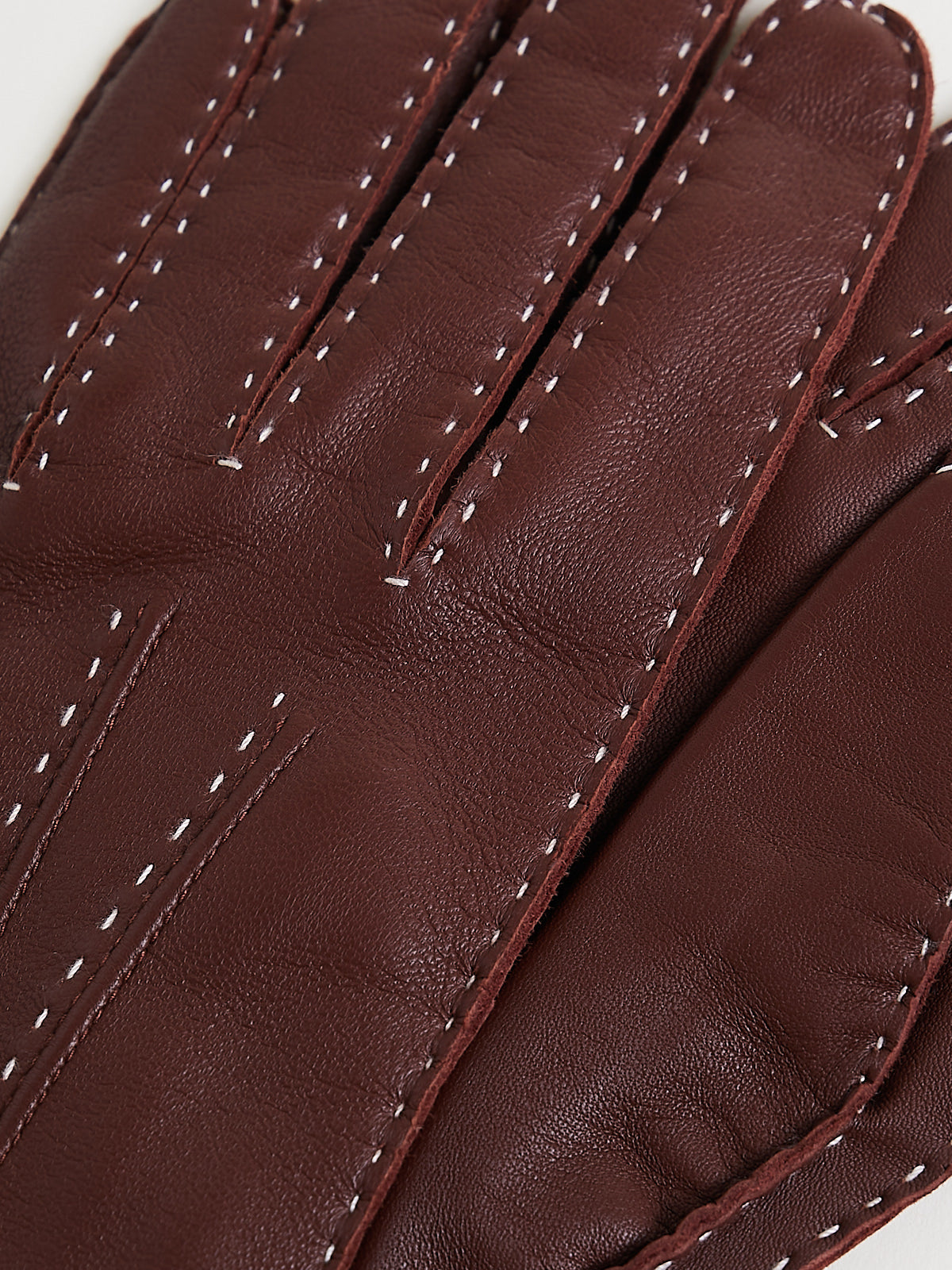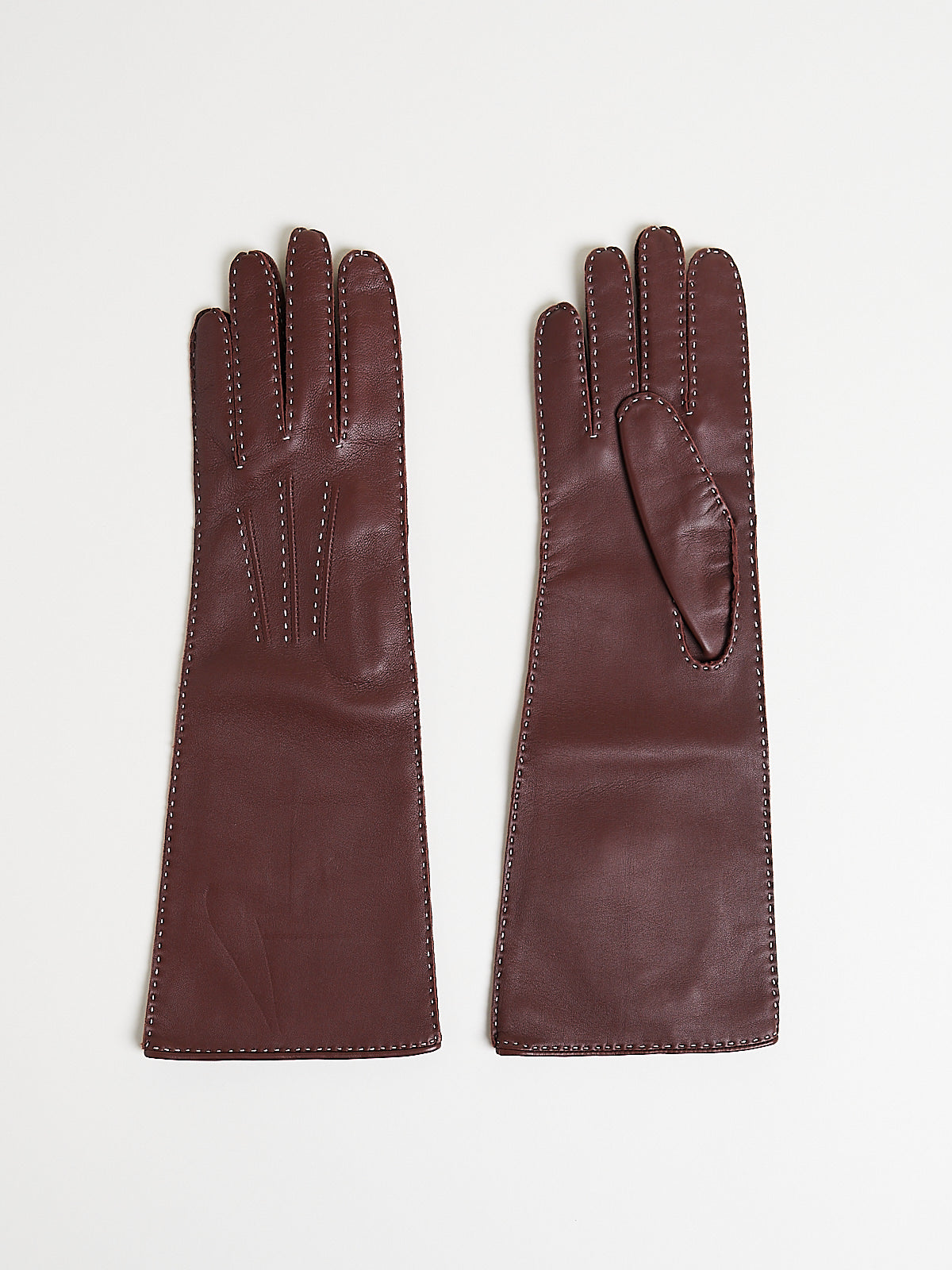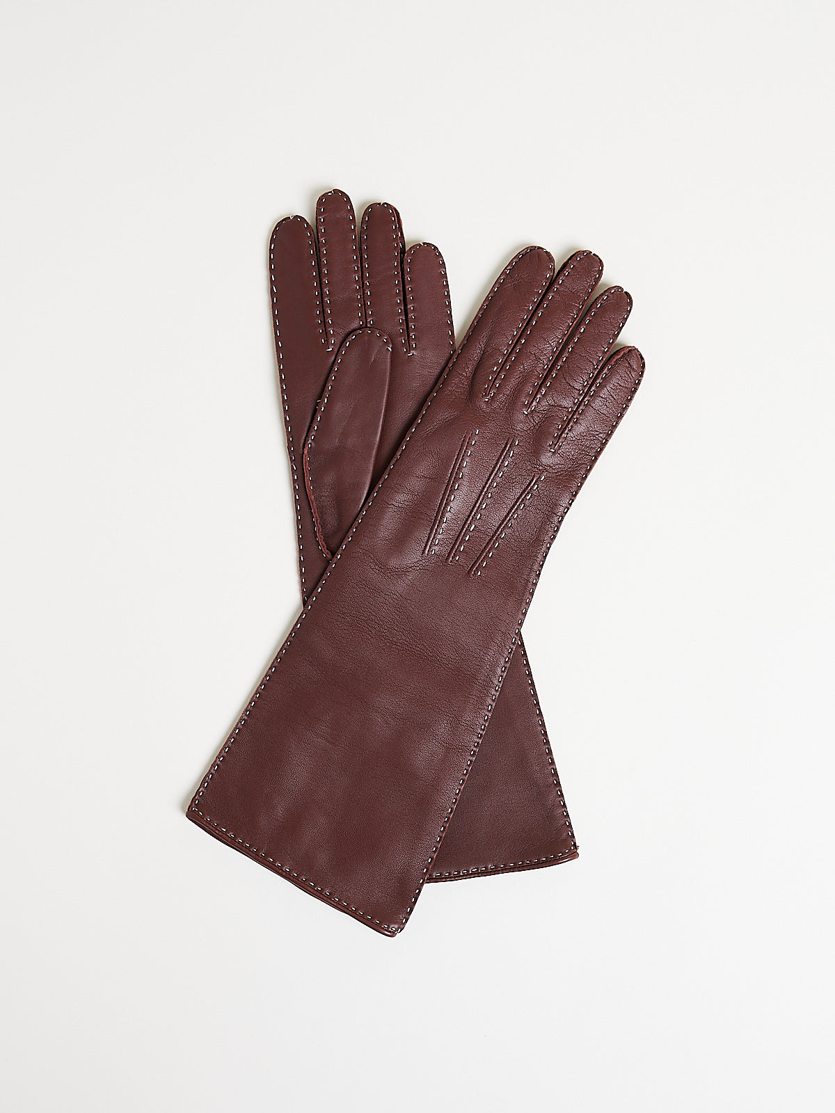 Medium-length gloves in mahogany brown lamb leather. Contrast stitching throughout and  three decorative seams on the back of the hand. Lined in silk.