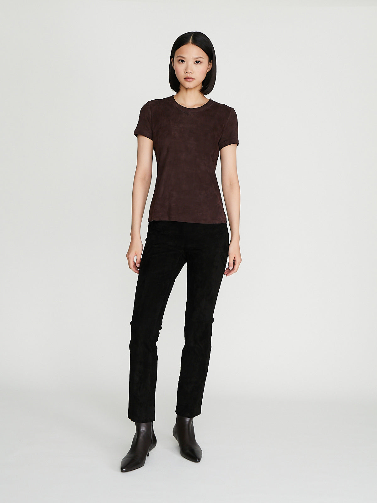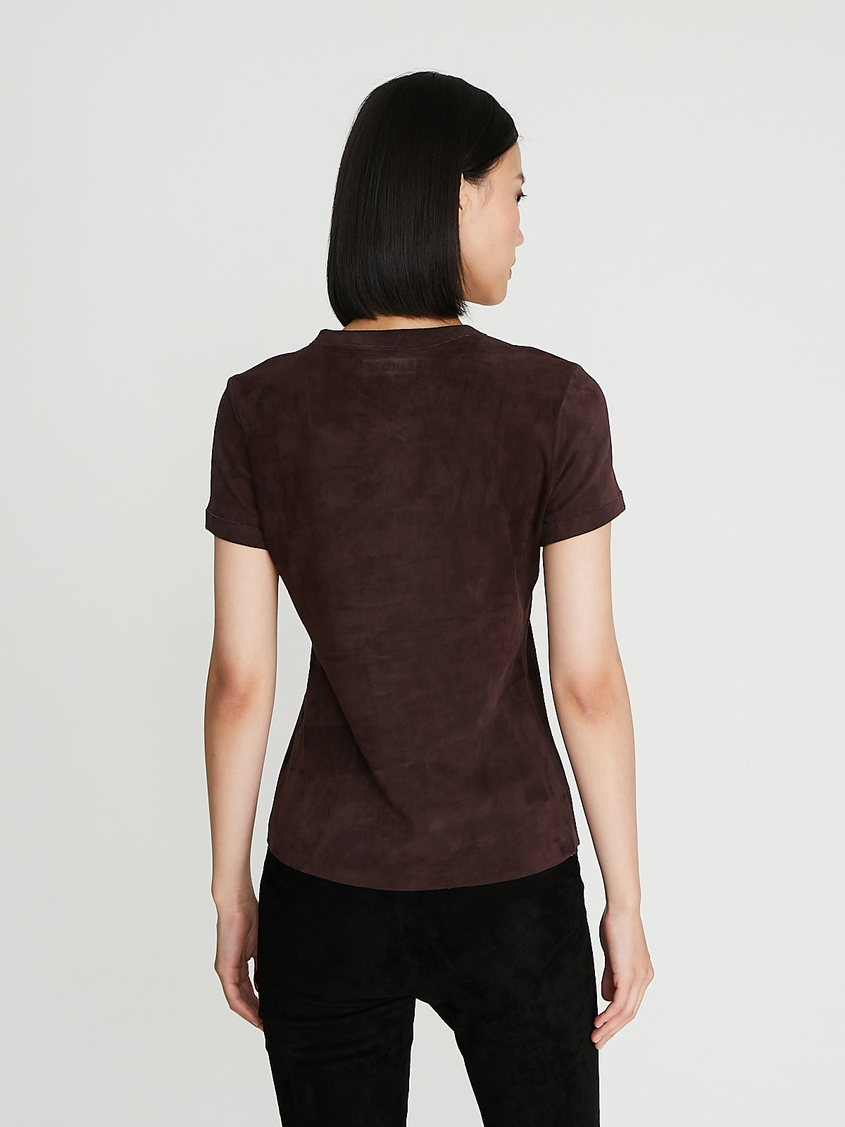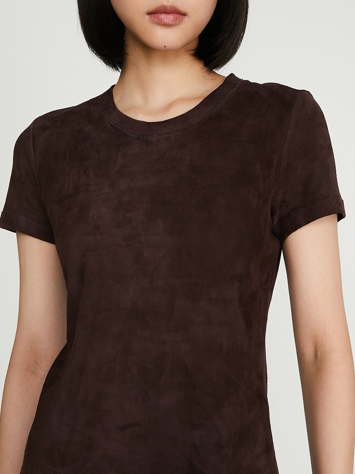 Fitted t-shirt in brown machine-washable light suede lambskin. Round neckline. Fully lined.