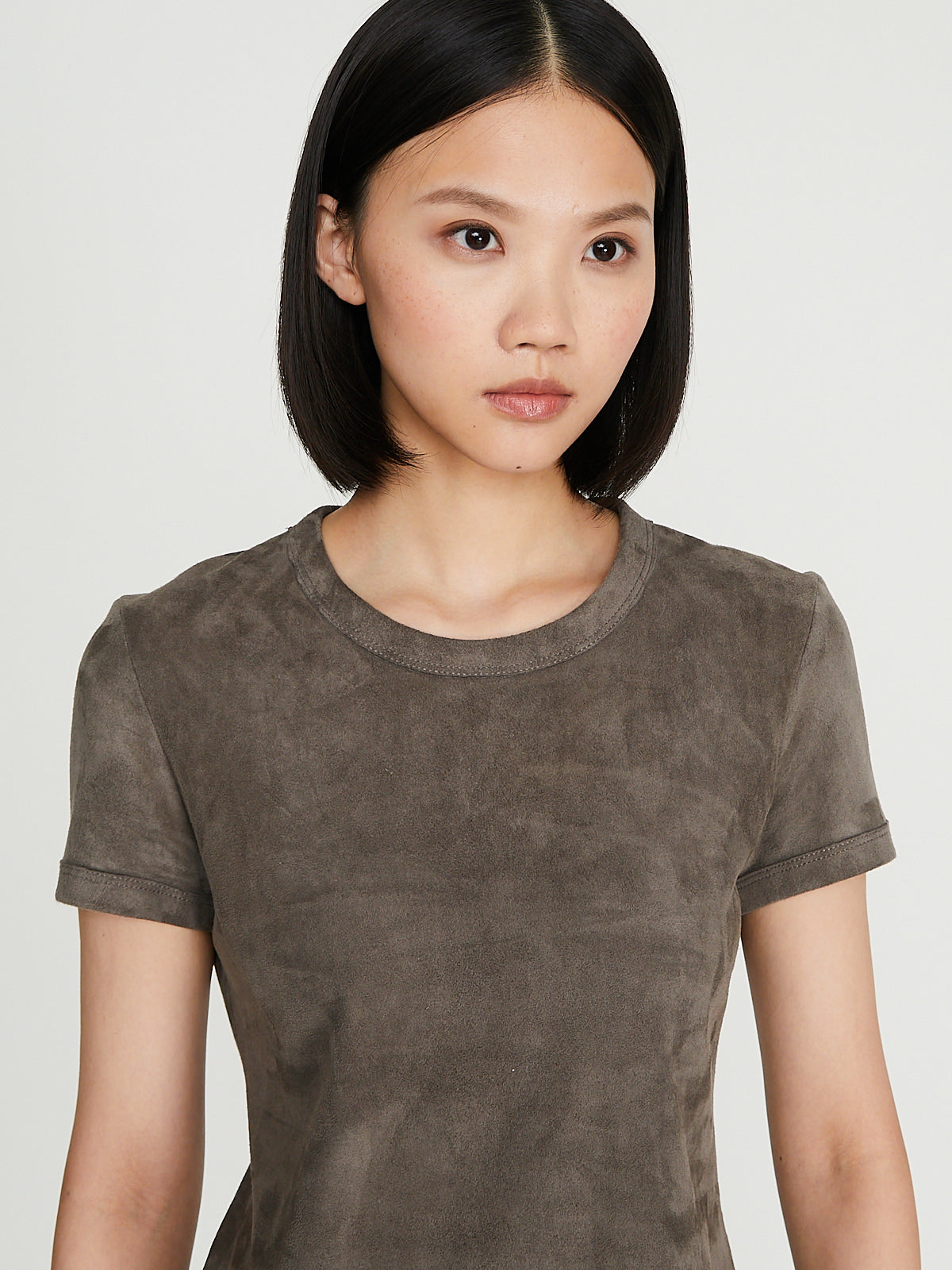 Fitted t-shirt in taupe machine-washable light suede lambskin. Round neckline. Fully lined.