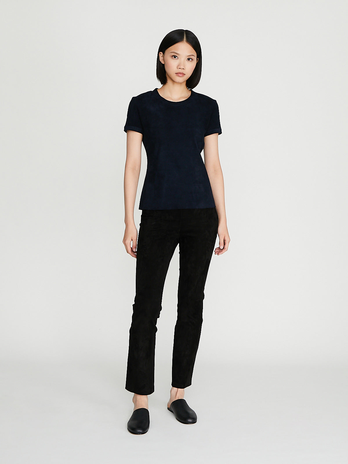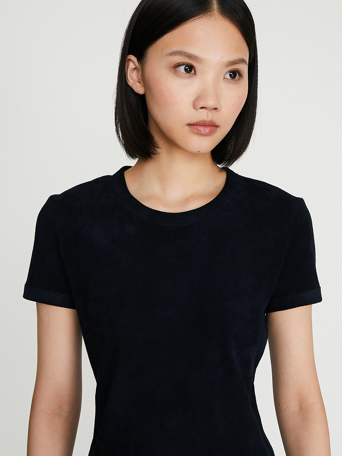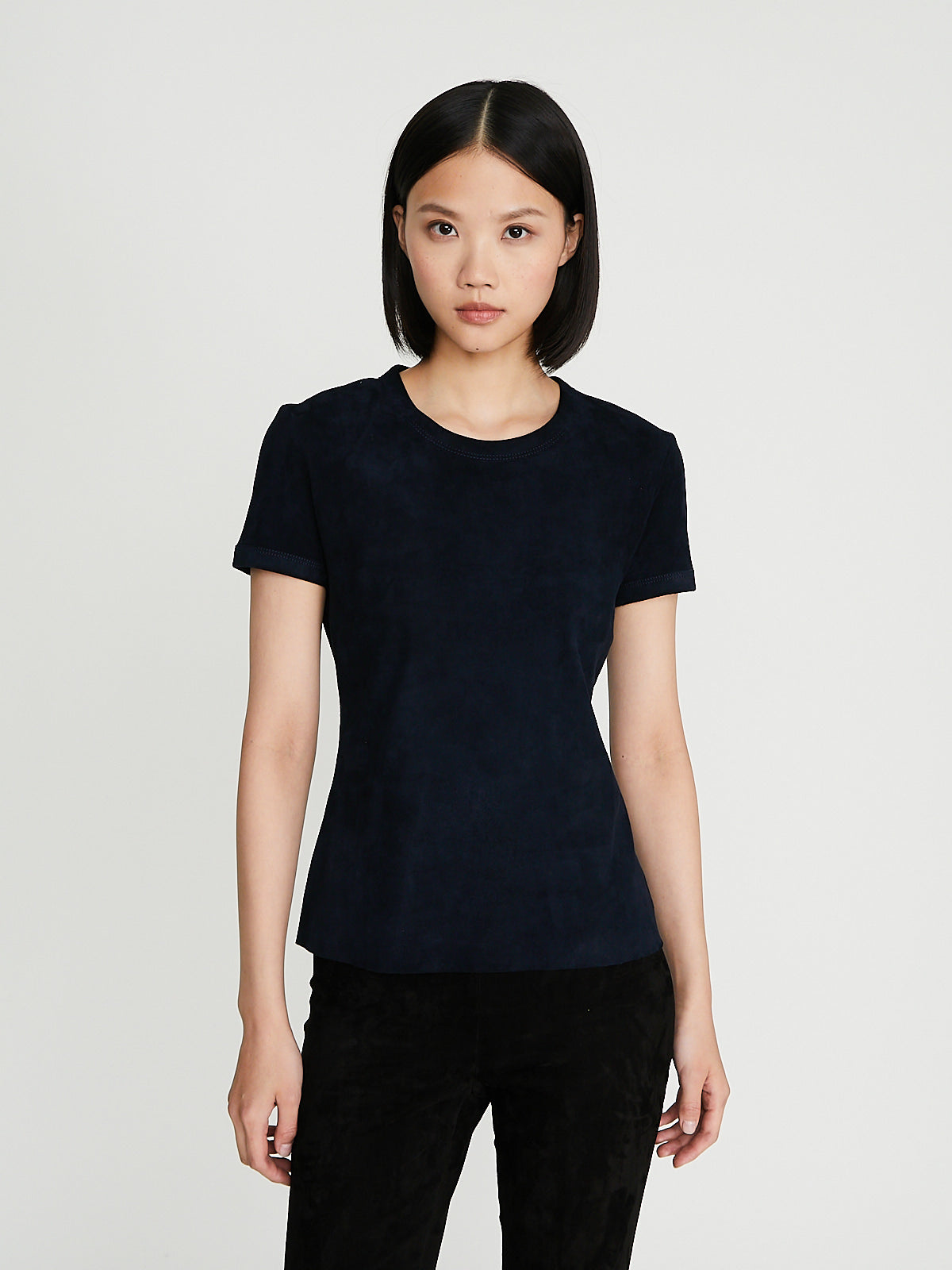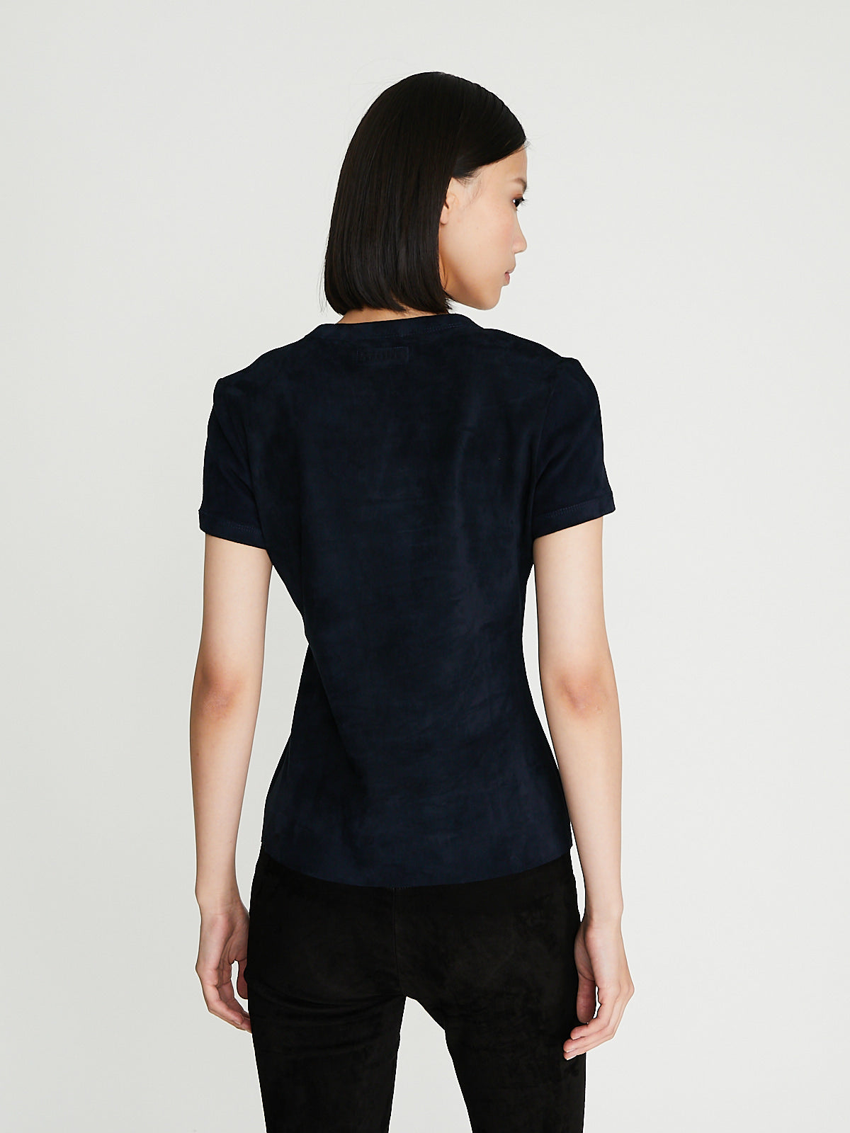Fitted t-shirt in black machine-washable light suede lambskin. Round neckline. Fully lined.