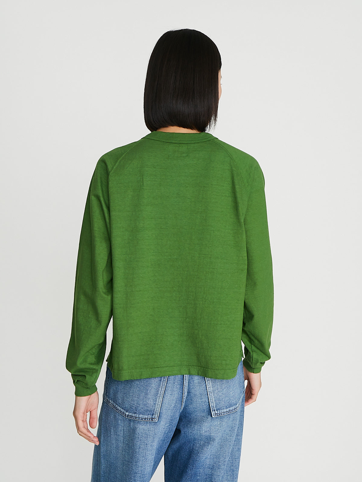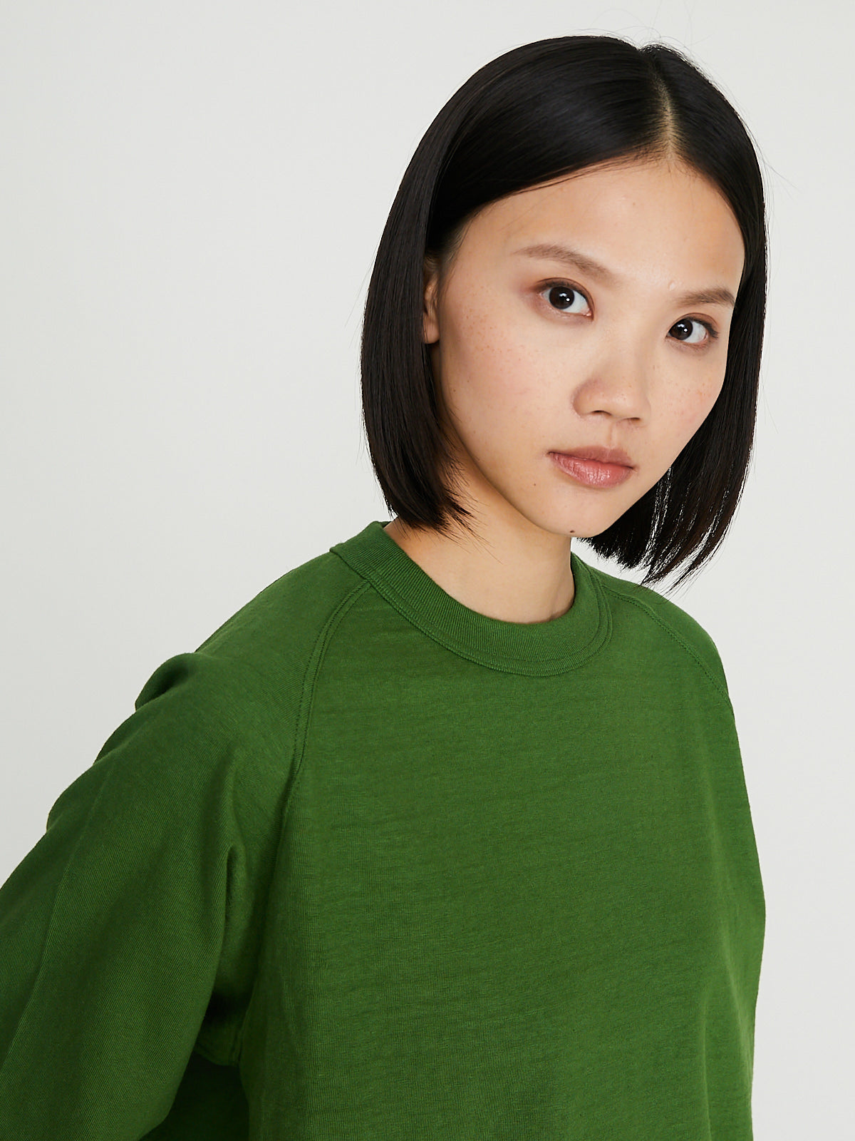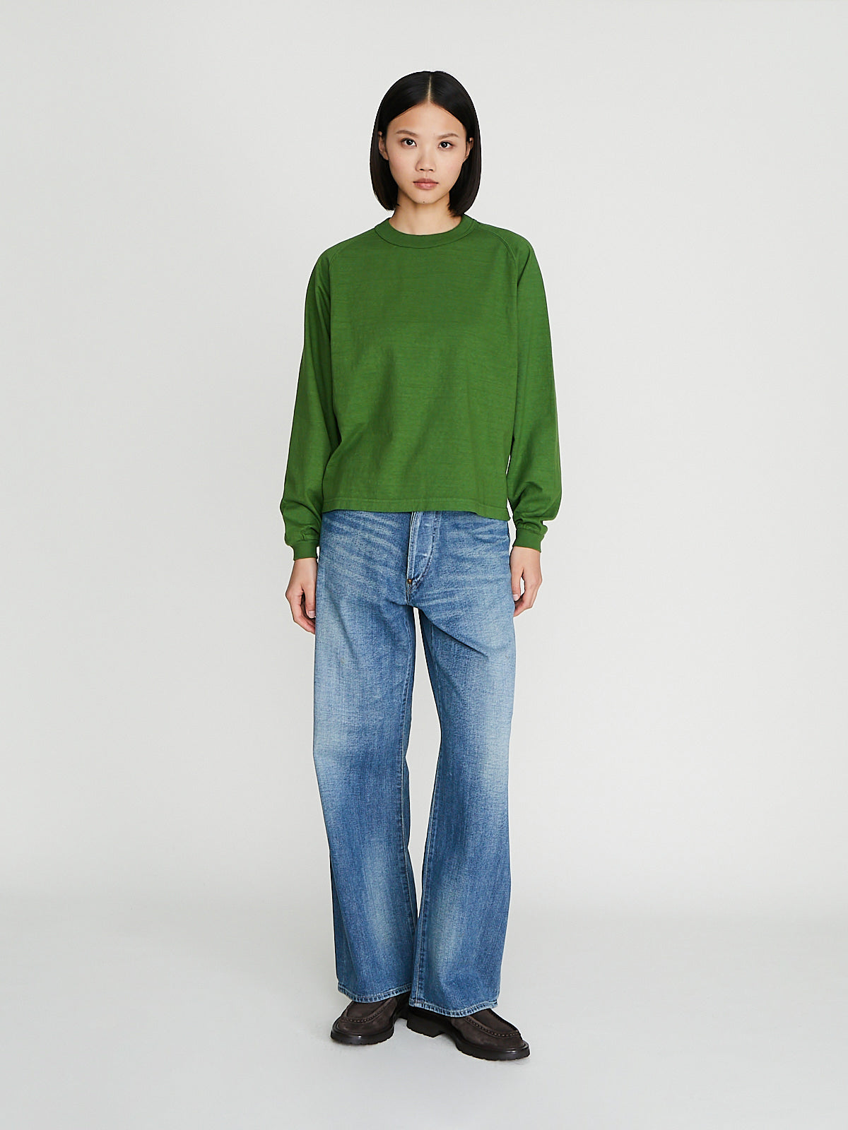 Boxy long sleeved t-shirt in recycled green Ochiwata (260gsm) cottonRound reinforced neckline and long raglan sleeves with ribbed cuffs. Constructed using antique loopwheel machines for a low tension, tubular knit without side seams. Unisex.
