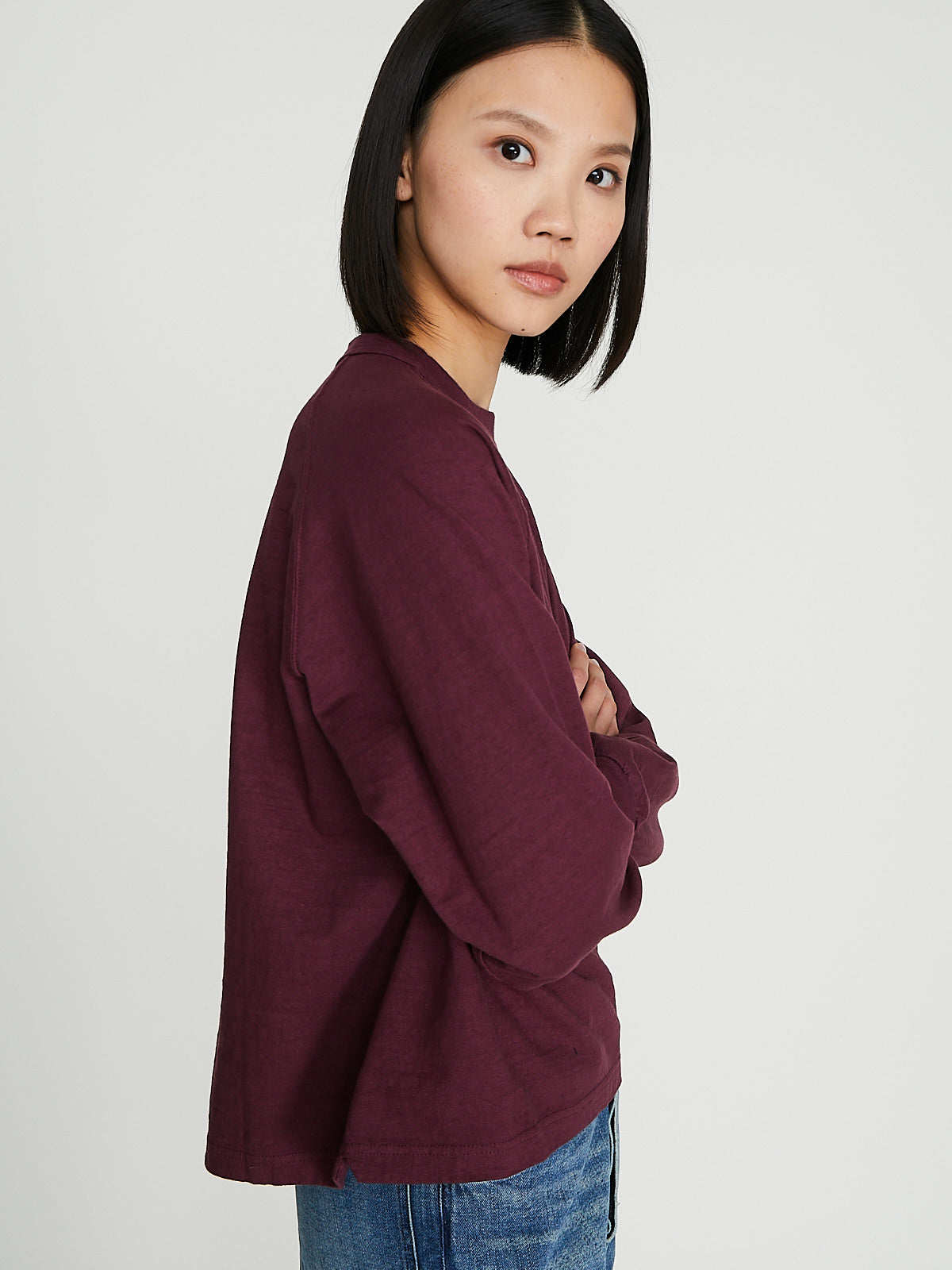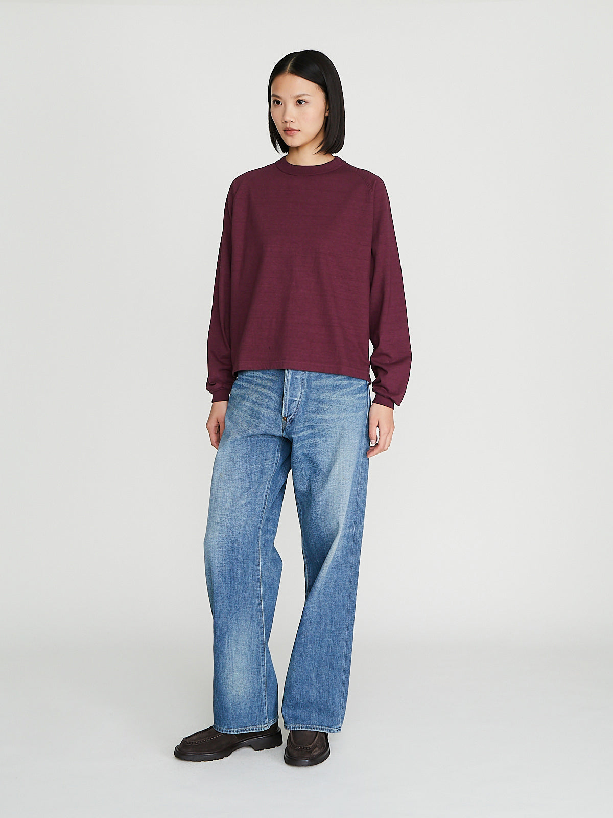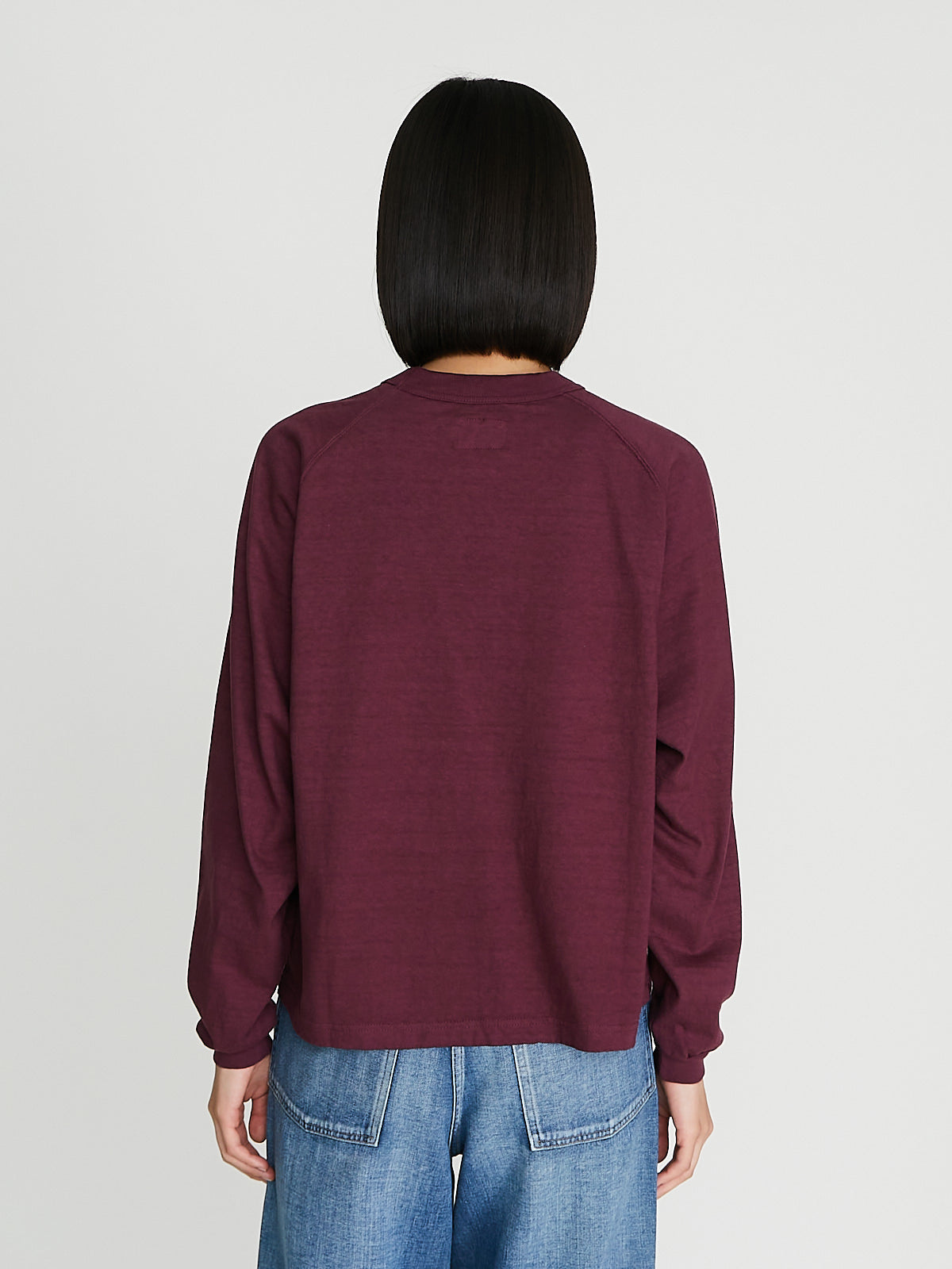 Boxy long sleeved t-shirt in recycled burgundy Ochiwata (260gsm) cottonRound reinforced neckline and long raglan sleeves with ribbed cuffs. Constructed using antique loopwheel machines for a low tension, tubular knit without side seams. Unisex.