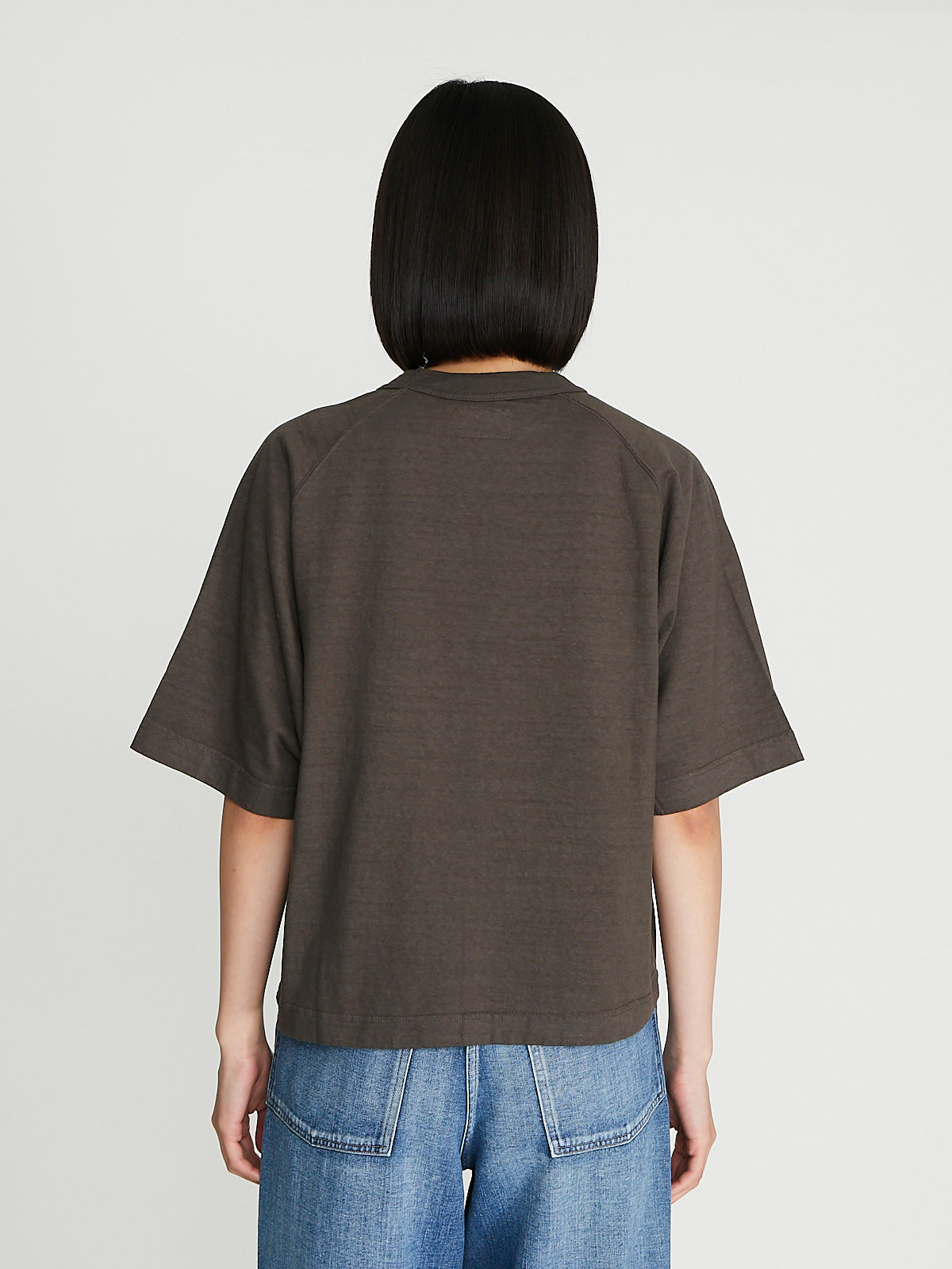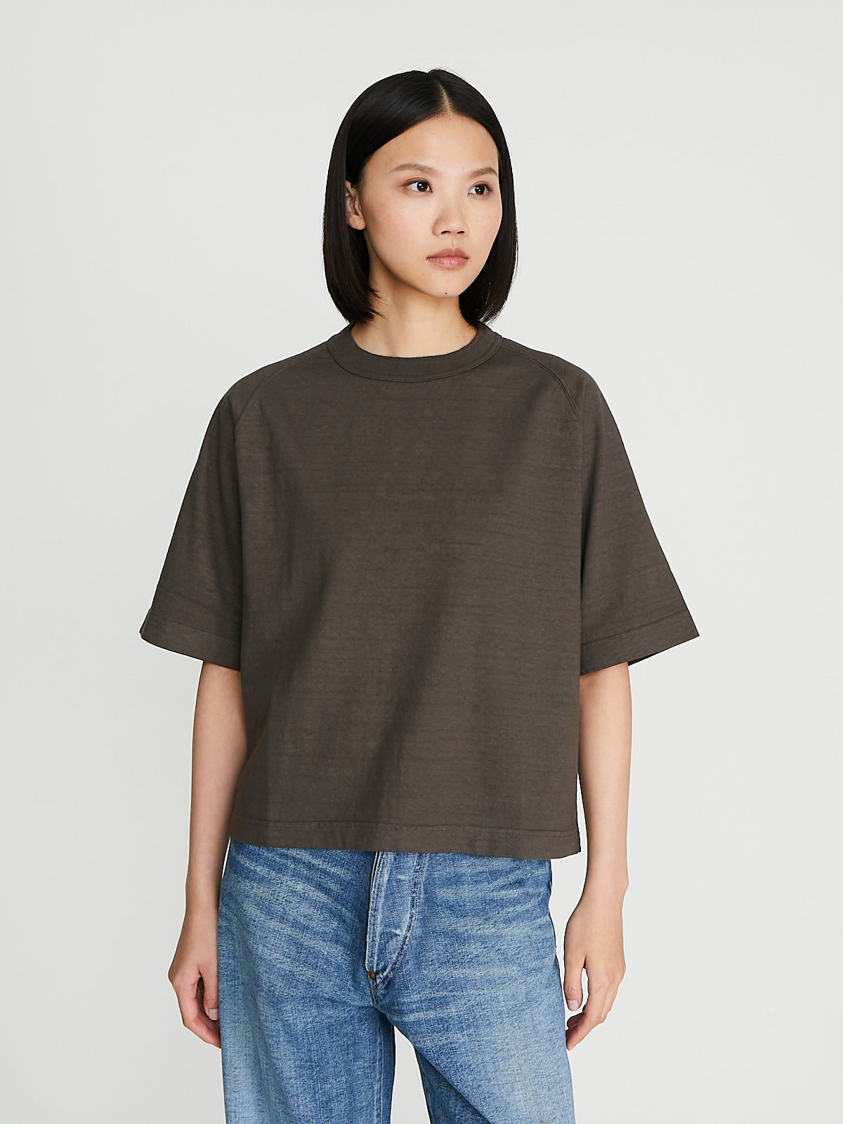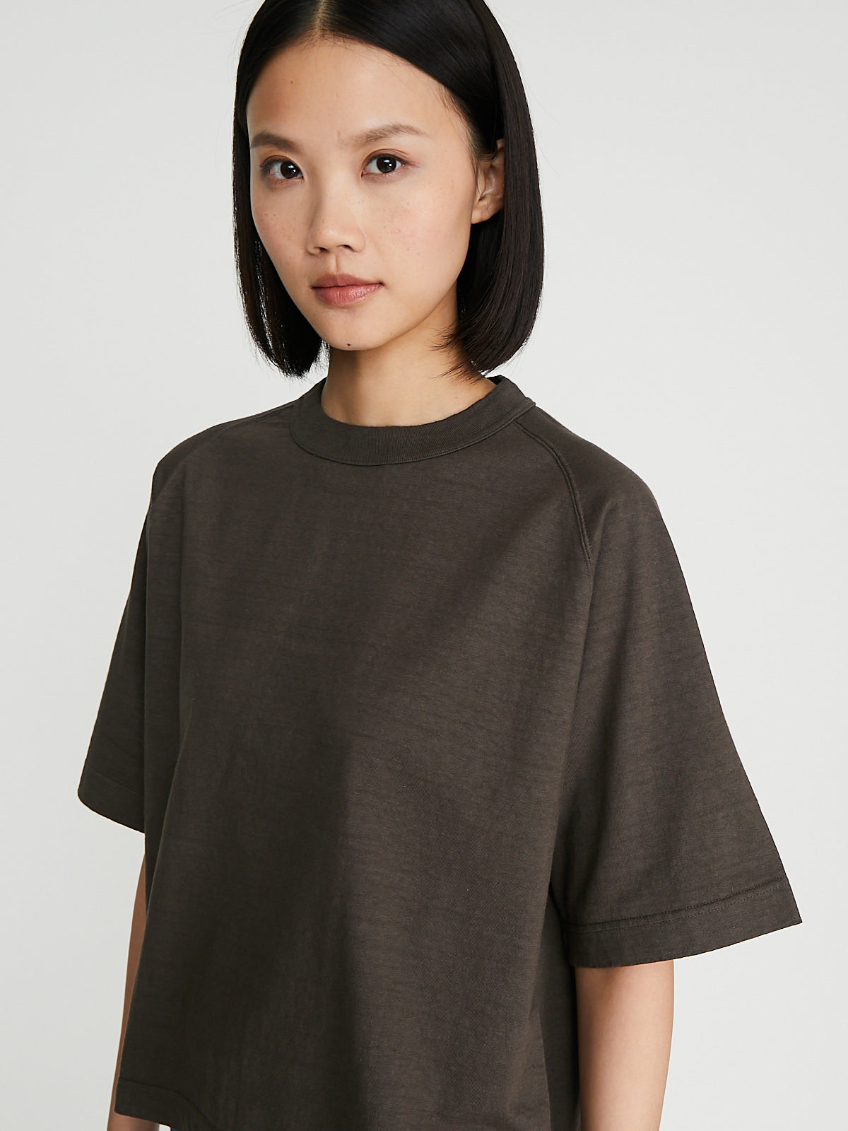 Boxy t-shirt in recycled dark olive Ochiwata (260gsm) cottonRound reinforced neckline and short raglan sleeves with ribbed cuffs. Constructed using antique loopwheel machines for a low tension, tubular knit without side seams. Unisex.