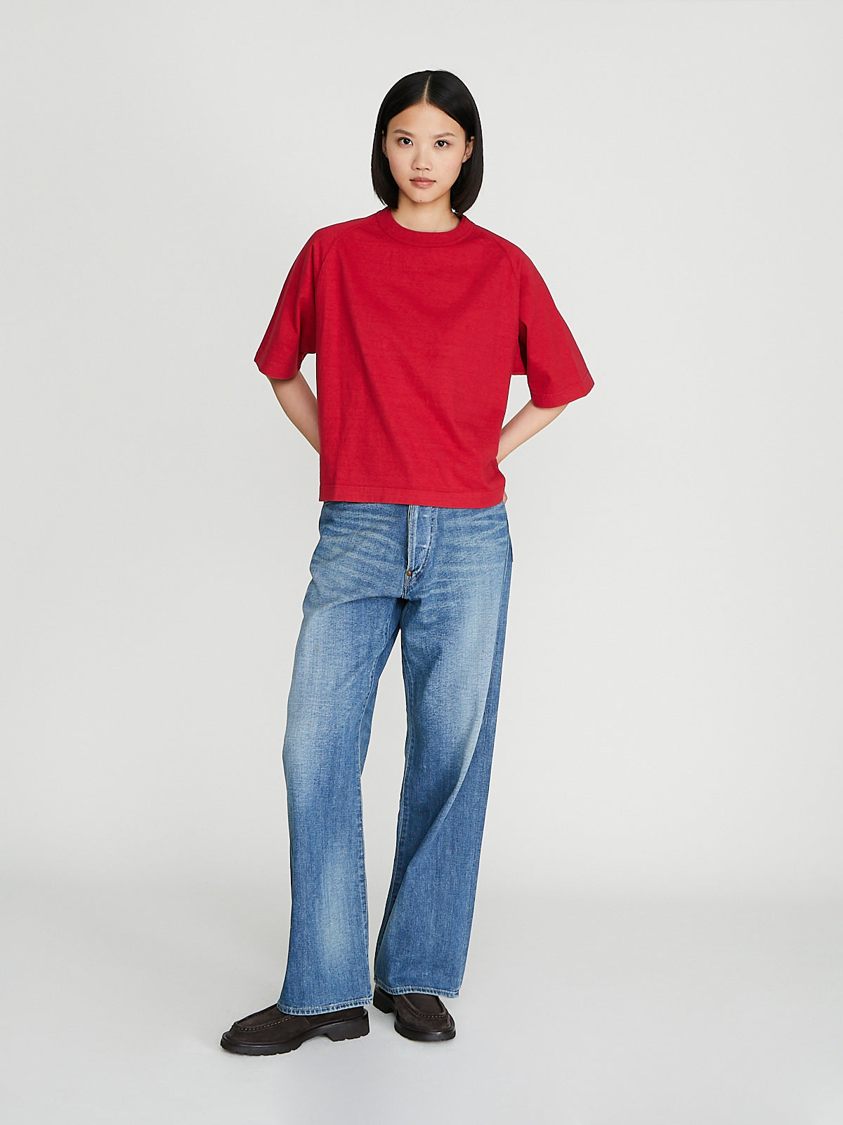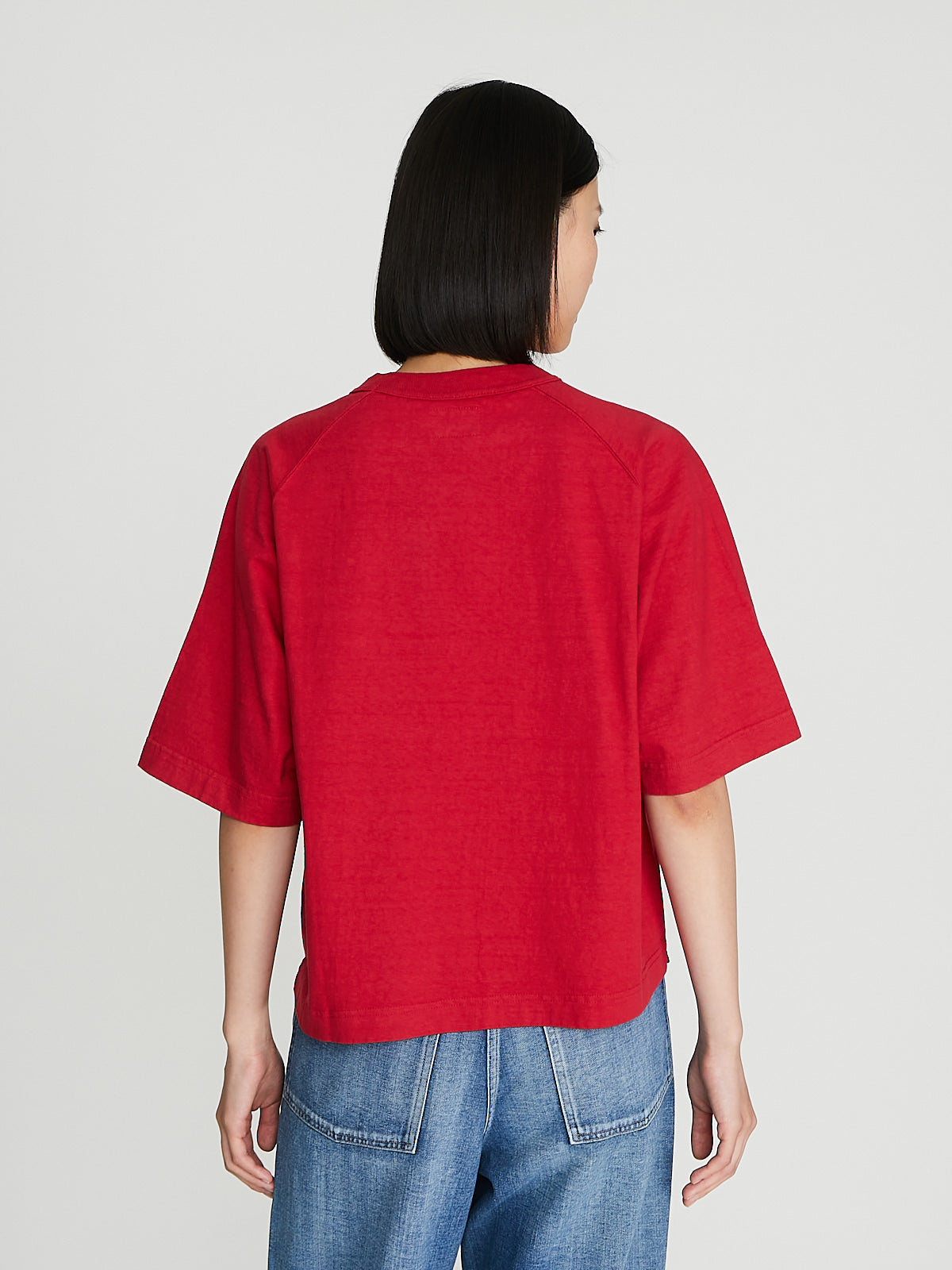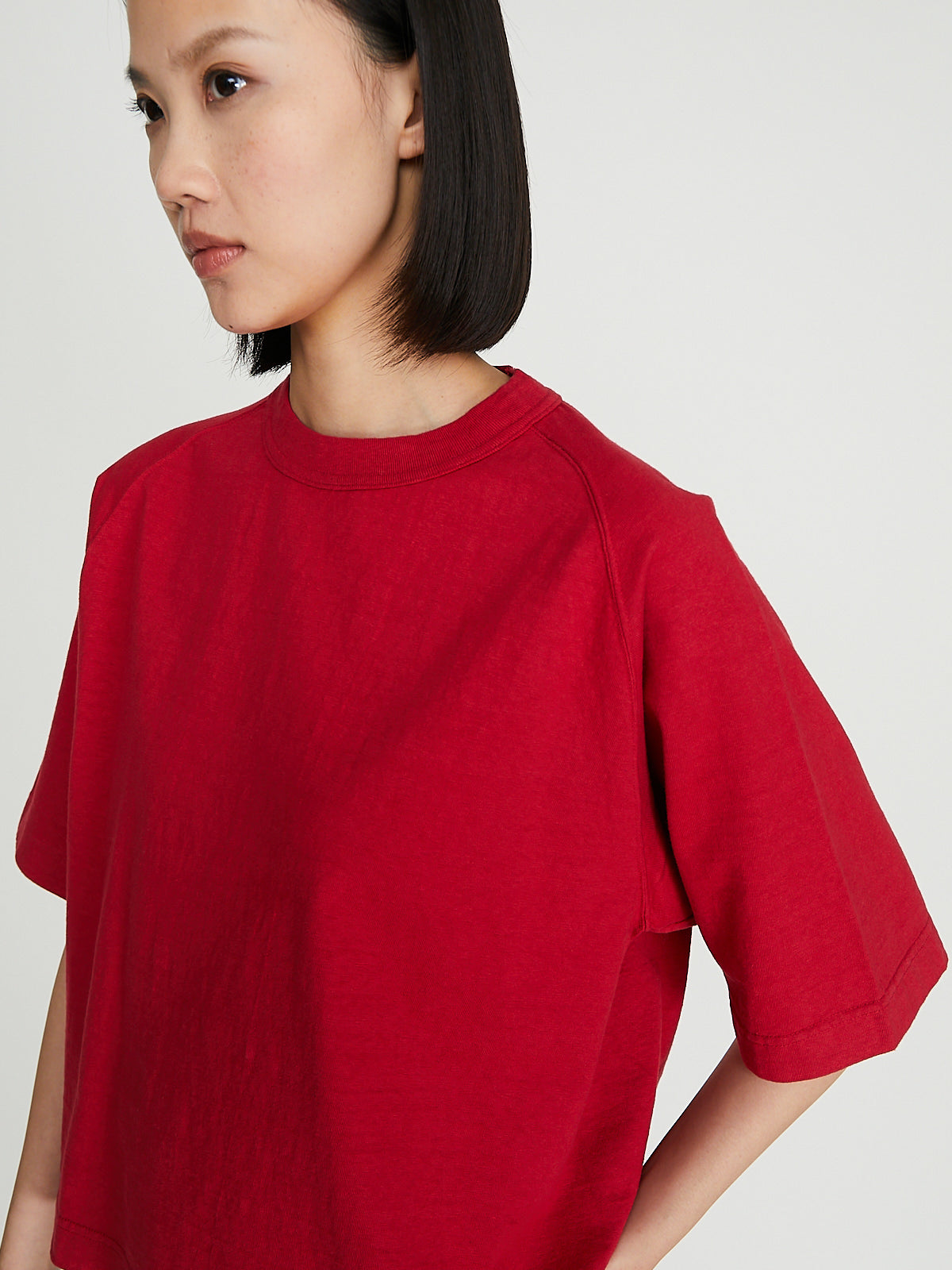 Boxy t-shirt in recycled red Ochiwata (260gsm) cottonRound reinforced neckline and short raglan sleeves with ribbed cuffs. Constructed using antique loopwheel machines for a low tension, tubular knit without side seams. Unisex.