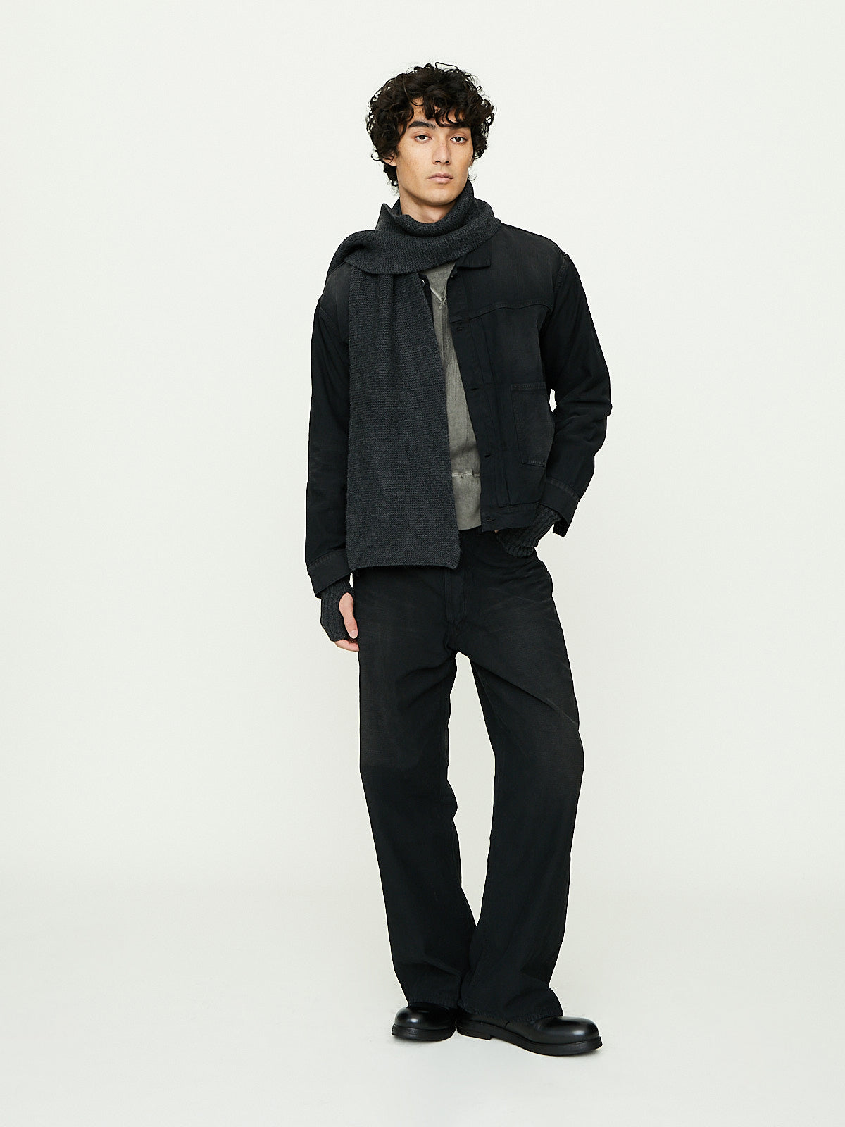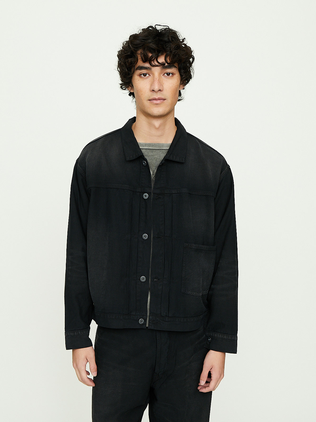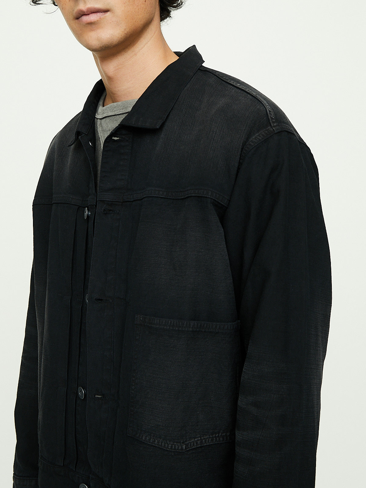 Classic denim jacket in dyed black textured slub cotton with a wrinkled texture. This jacket has been garment dyed in charcoal and is deliberately distressed to achieve a worn-in look, complete with natural wrinkles and whiskers found in used clothes. Open-end yarns employ a special technique where air twists the fibres together, resulting in a fabric with a firm surface and soft core.