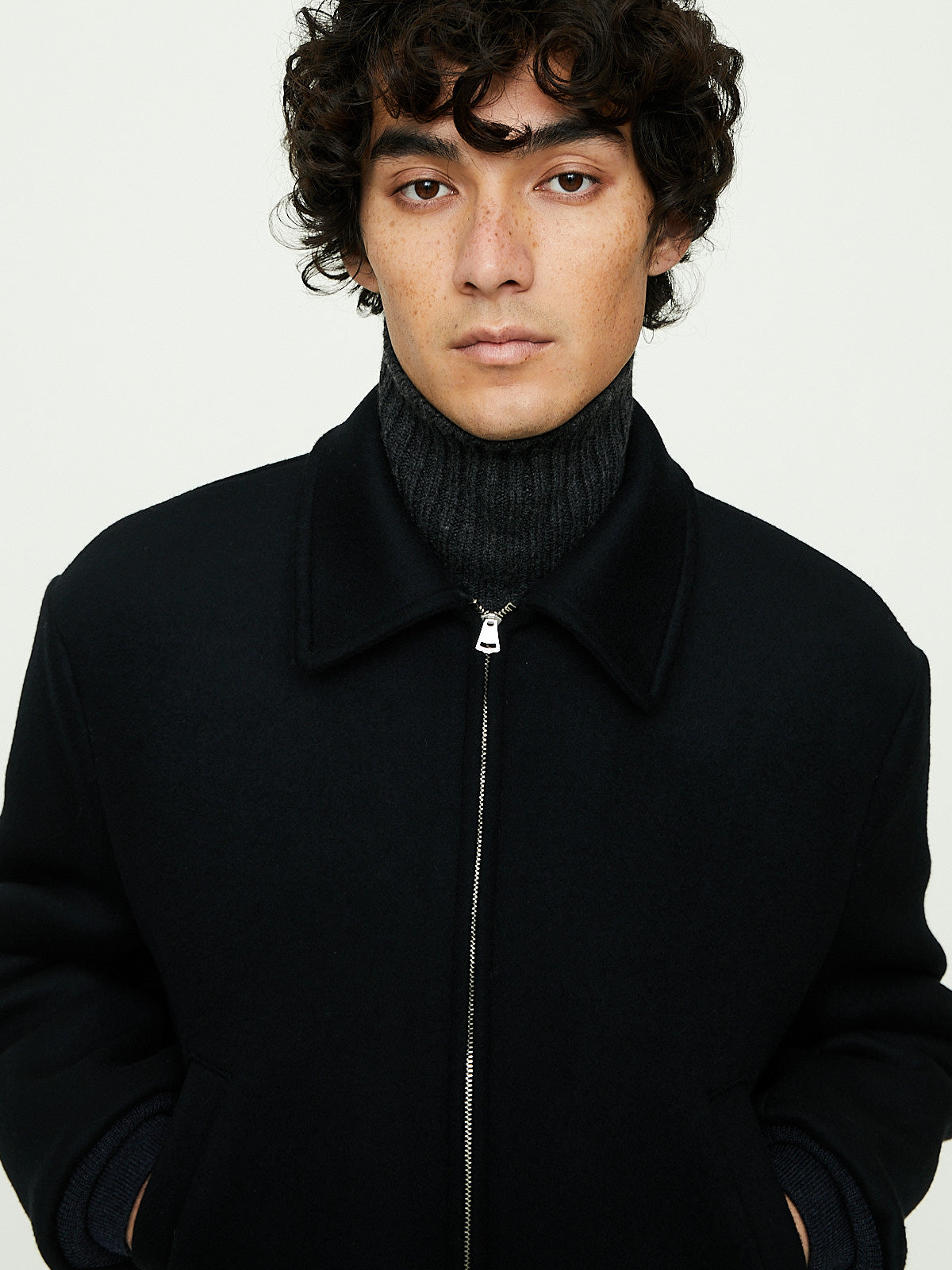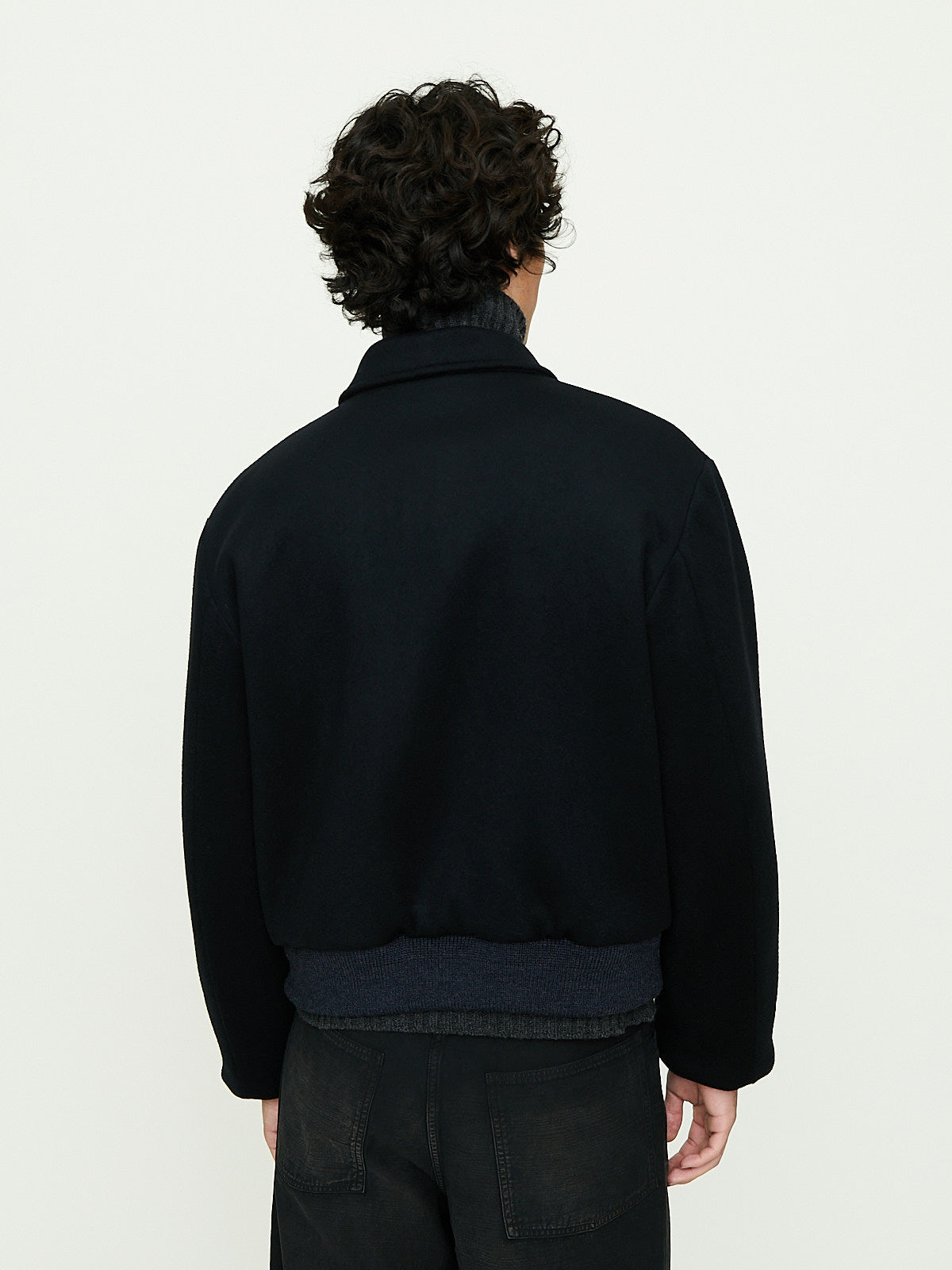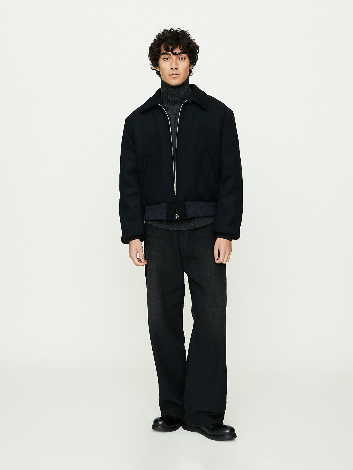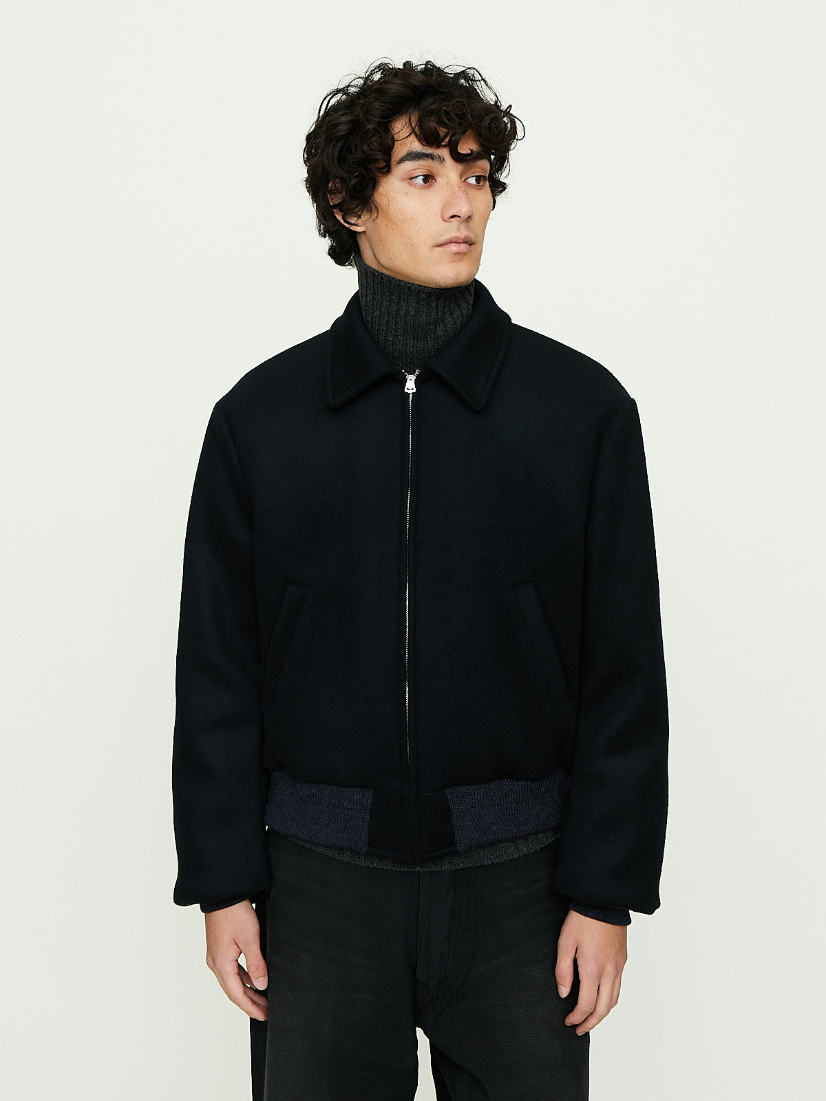 Sports jacket in black wool inspired by 1950s motorcycle culture. Constructed from a luxurious double weave fabric made from SUPER170's lamb wool with a fibre fineness equivalent to cashmere, offering both softness and excellent insulation. Pointed collar, front zip fastening and long sleeves with a tailored shoulder. Welted slip pockets on the front. Features a rib detail at the cuffs and bottom hem.