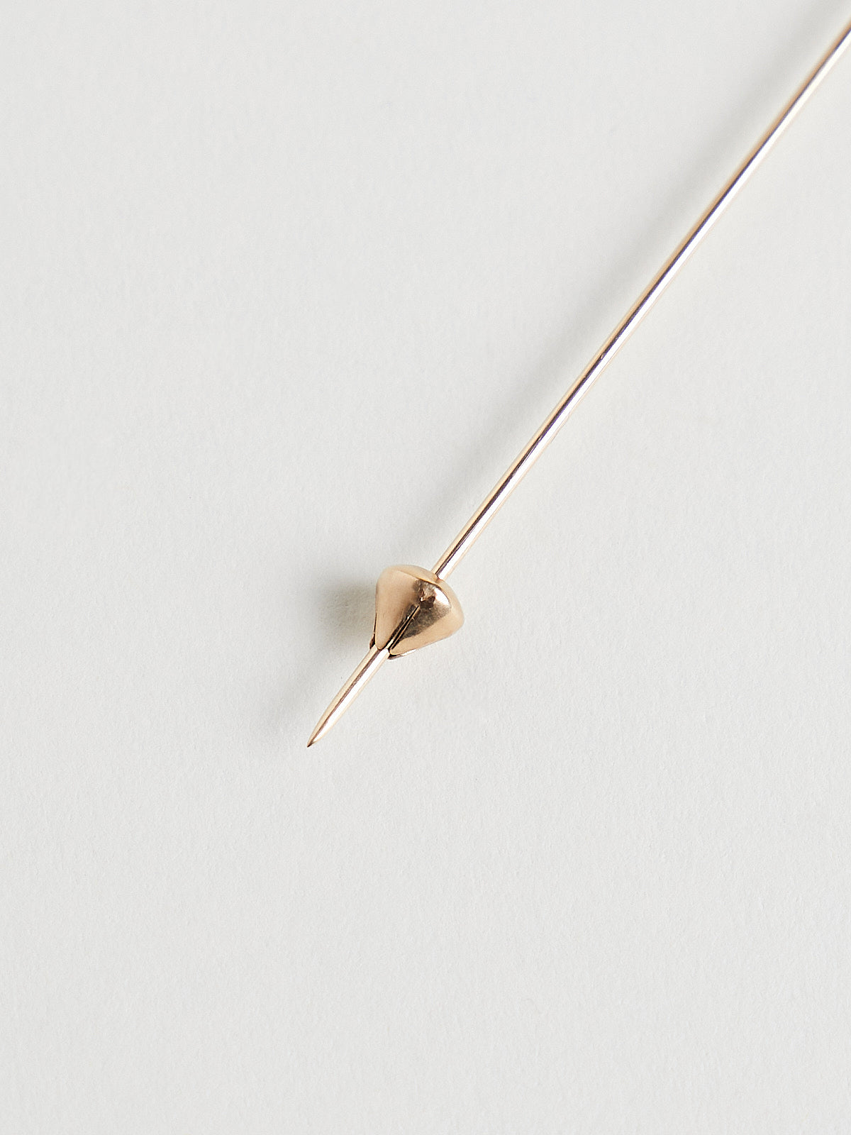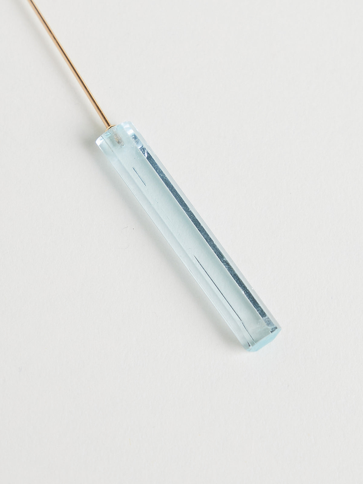 Hat pin in 14k yellow gold with a rectangular aquamarine bead. Feature an ear wire backing.
