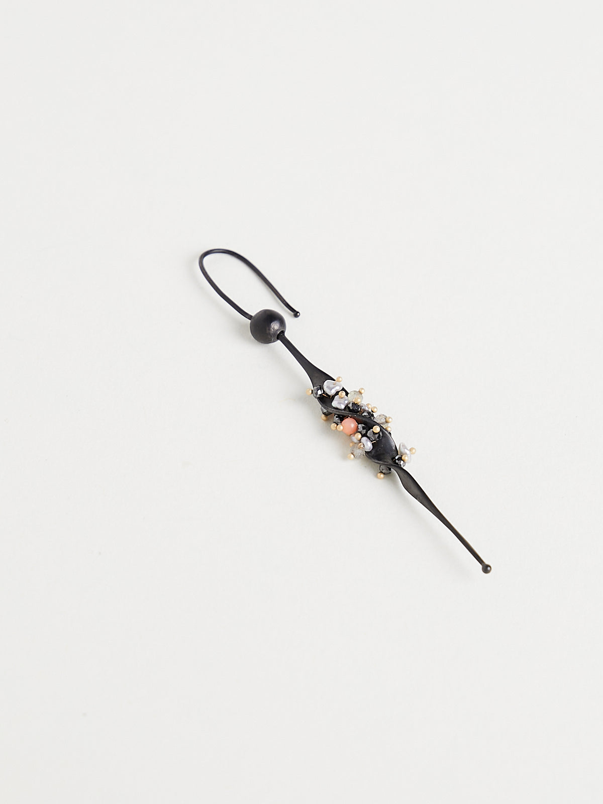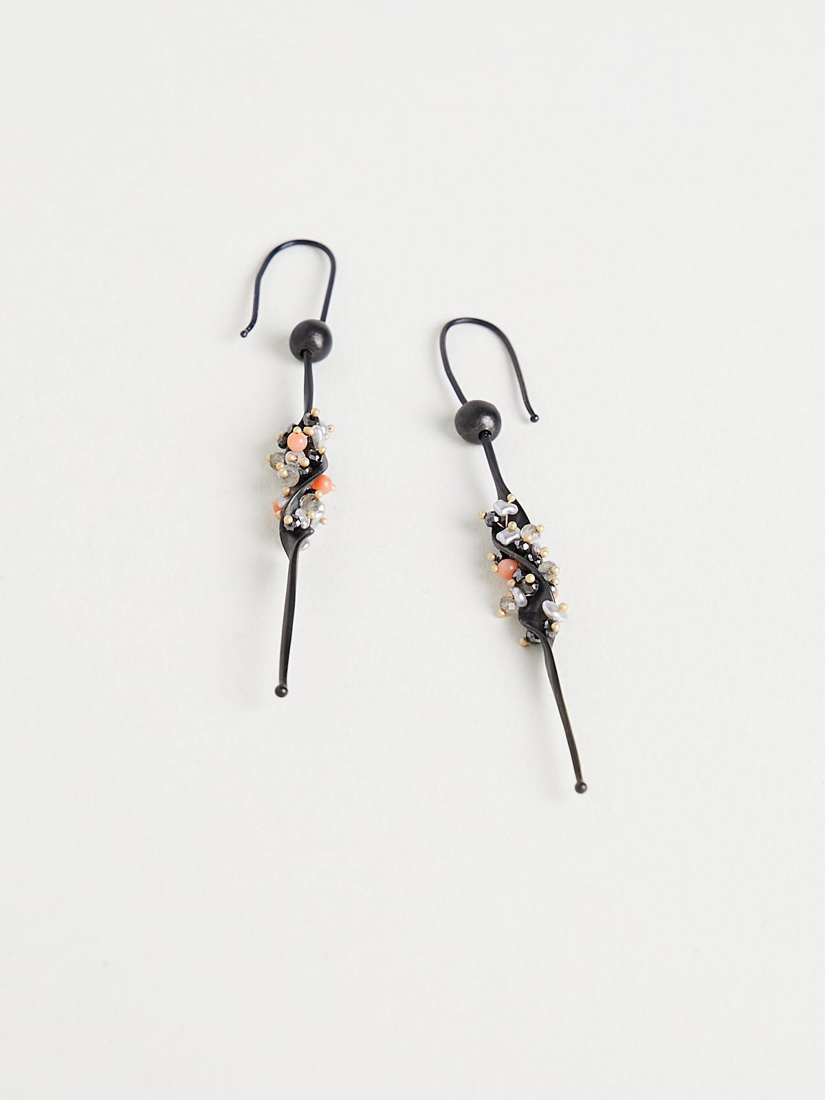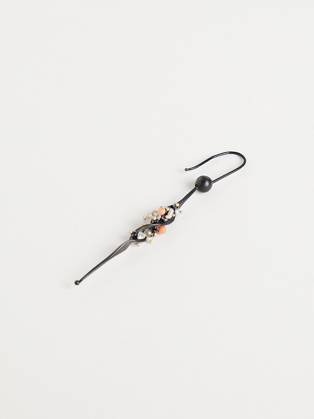 Large seaweed earrings in oxidised 18k yellow gold encrusted with various stones pierced with gold beads. Features an ear wire backing.
