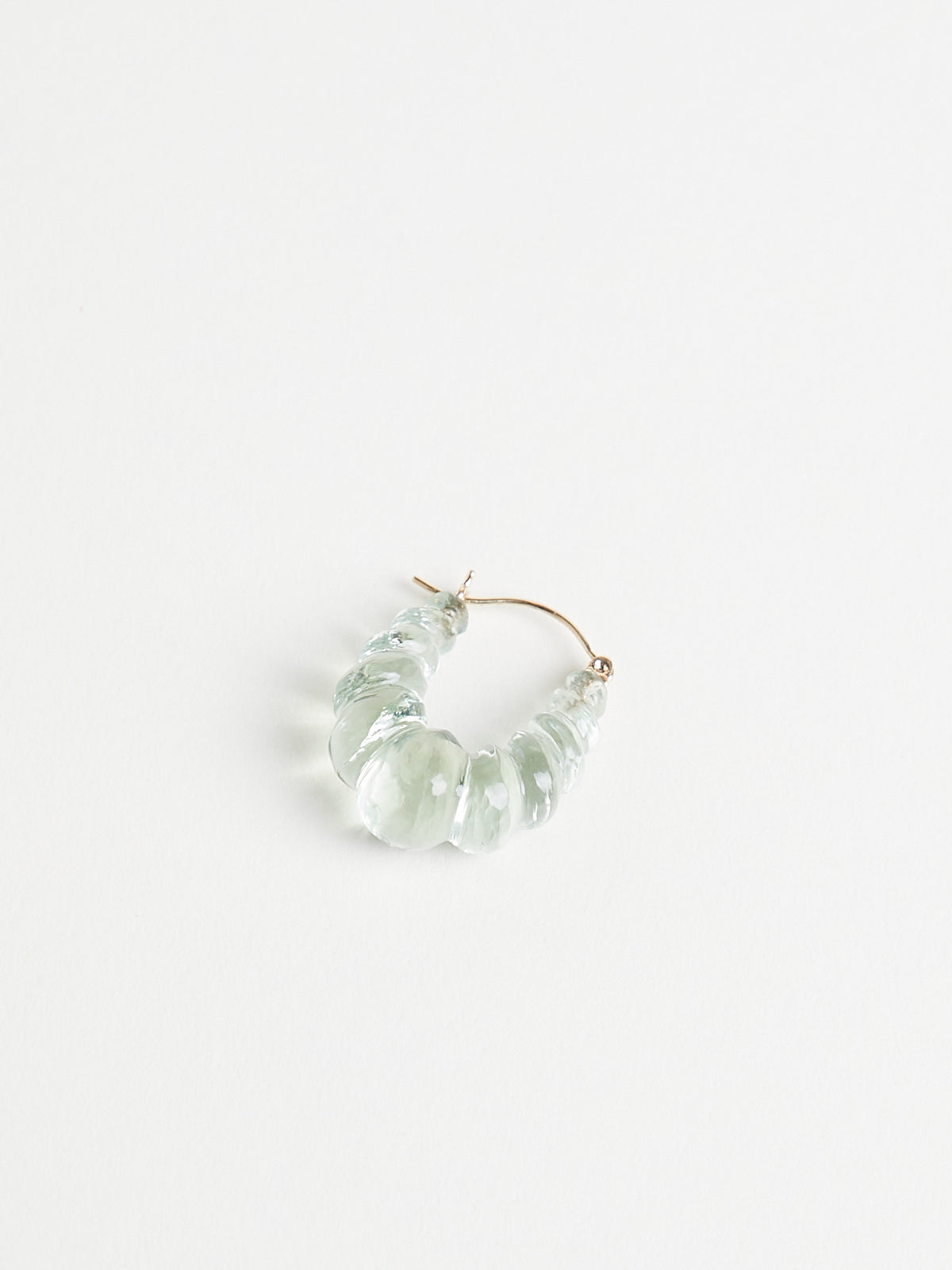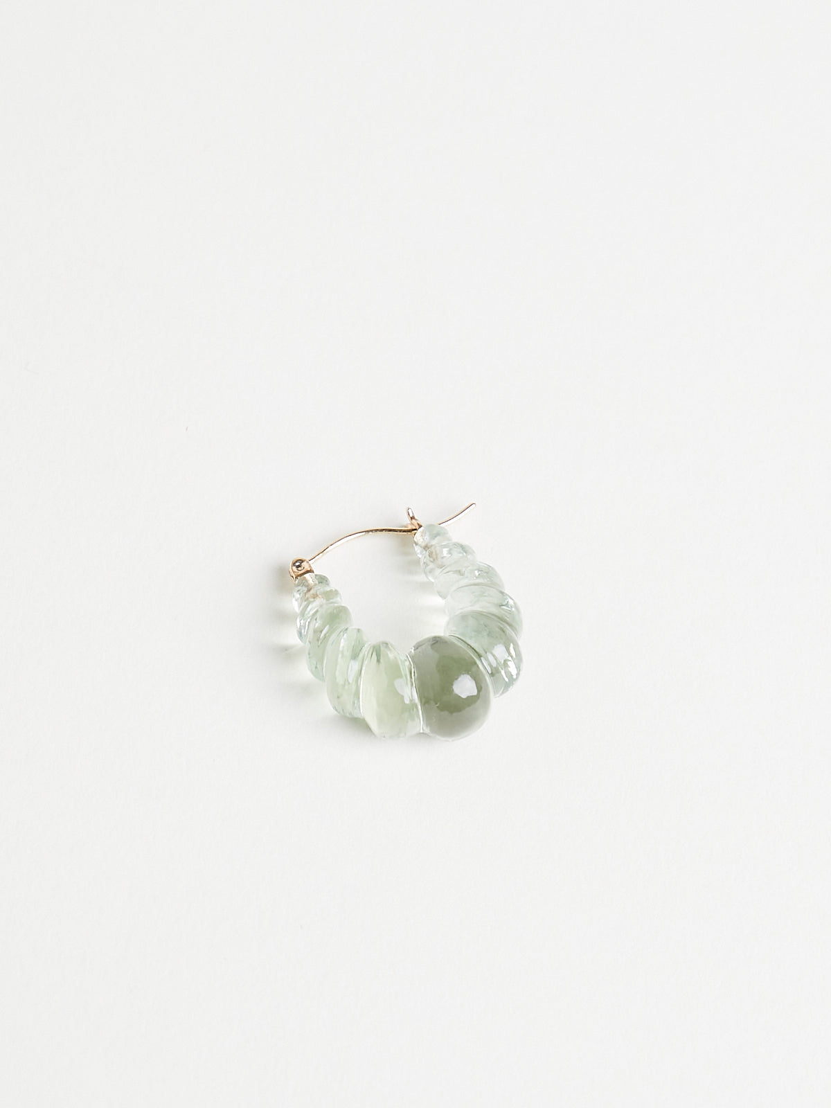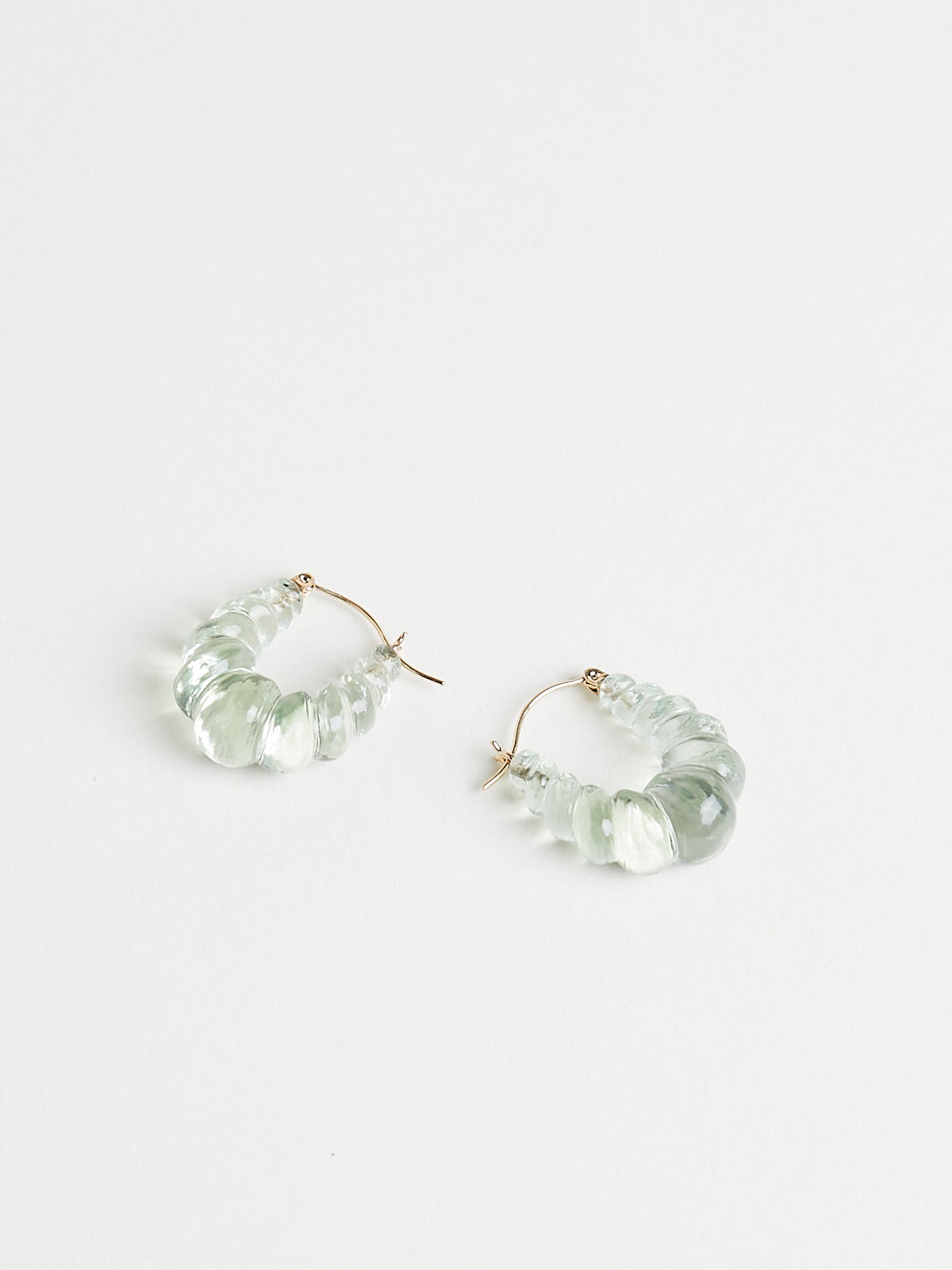 Handmade ear hoops made from hand-carved green amethyst. Features a hinged backing in 18k yellow gold.