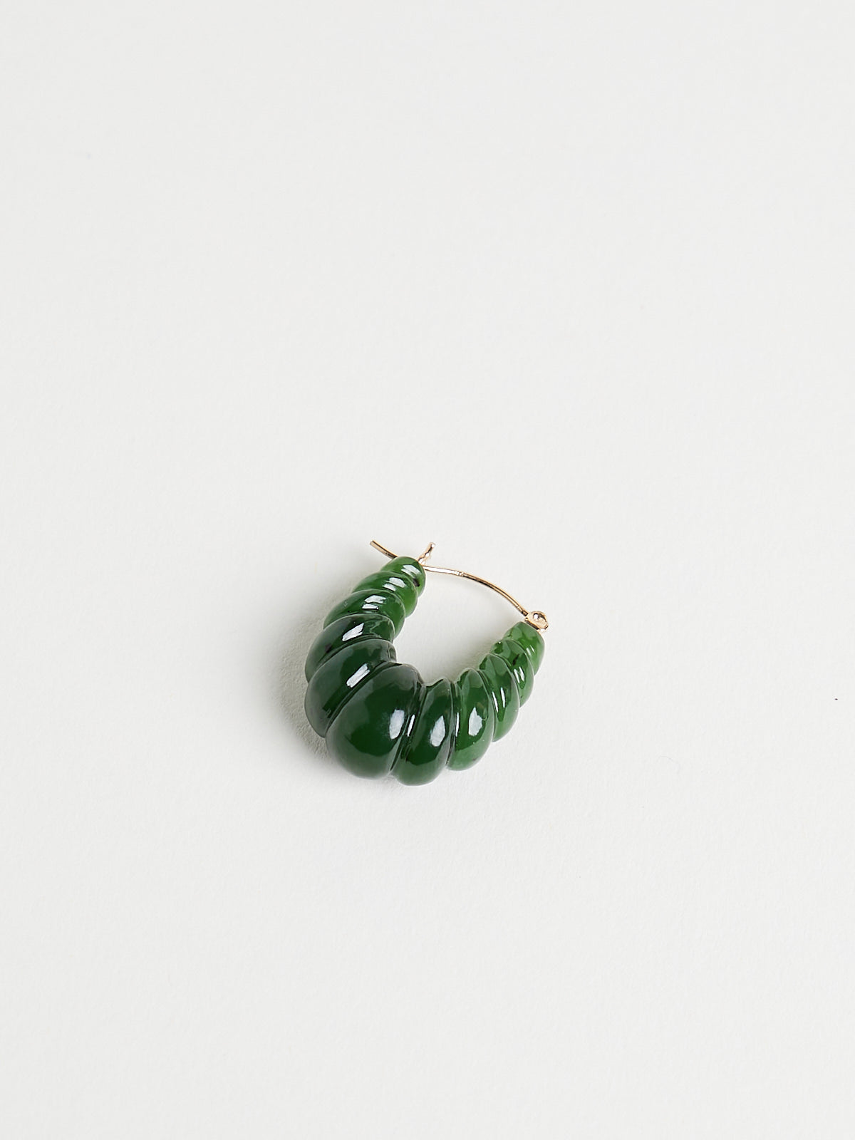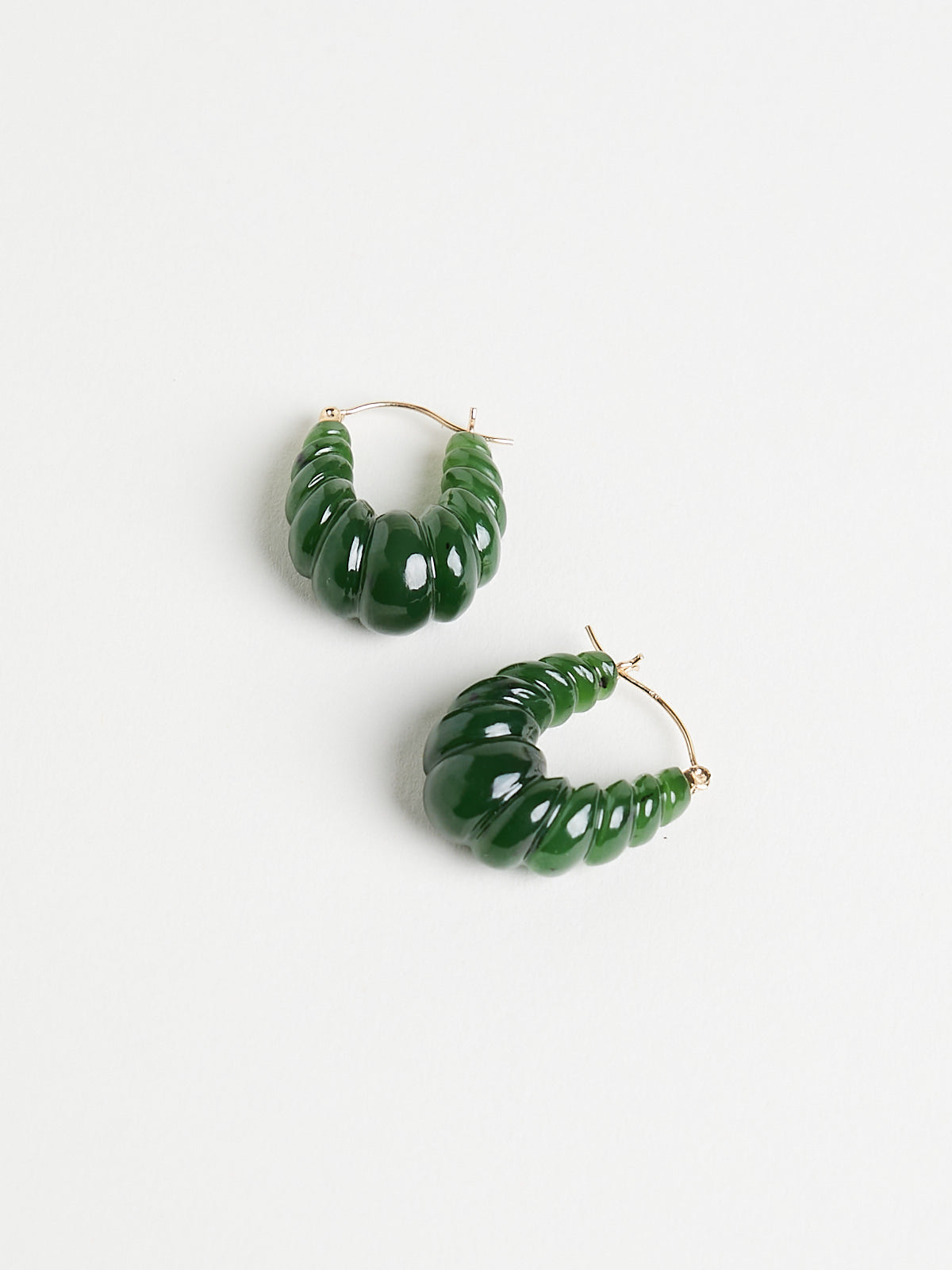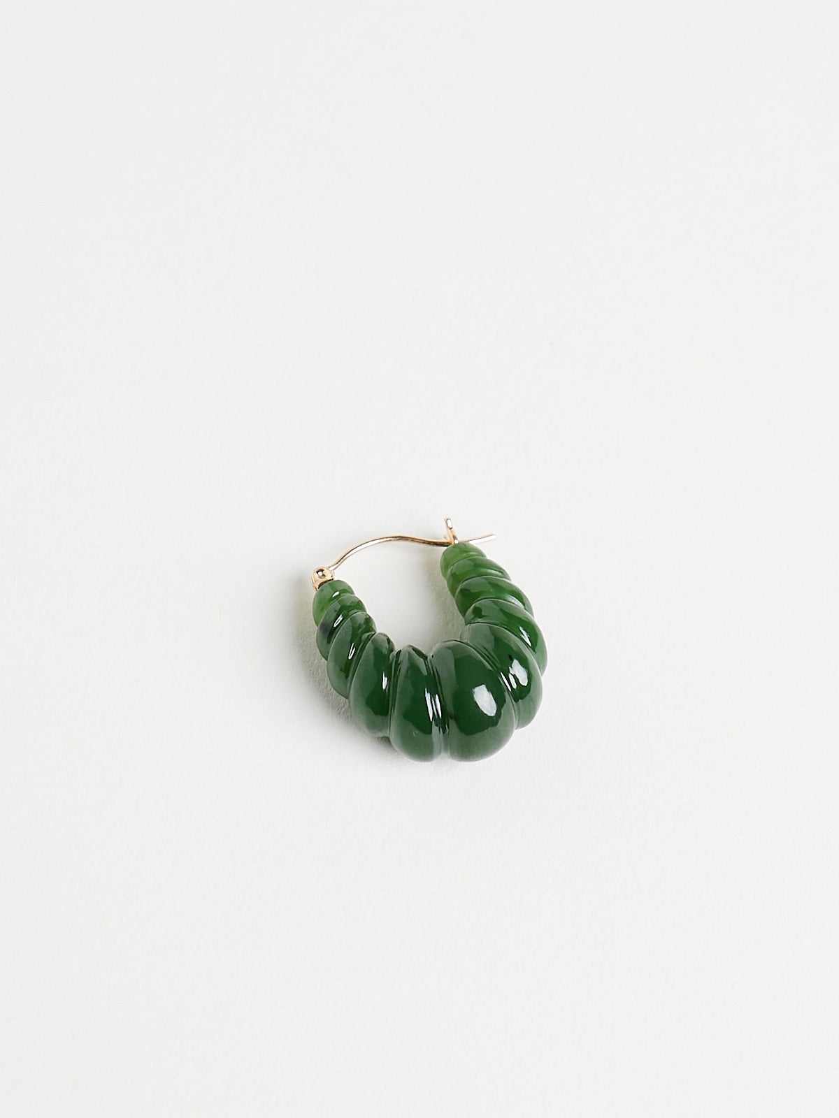 Handmade ear hoops made from hand-carved jade. Features a hinged backing in 18k yellow gold.