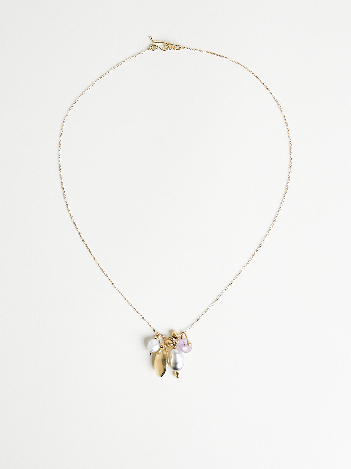 Handmade necklace in 18k yellow gold with a cluster of a moonstone pendant and pearls. Features a hook clasp.