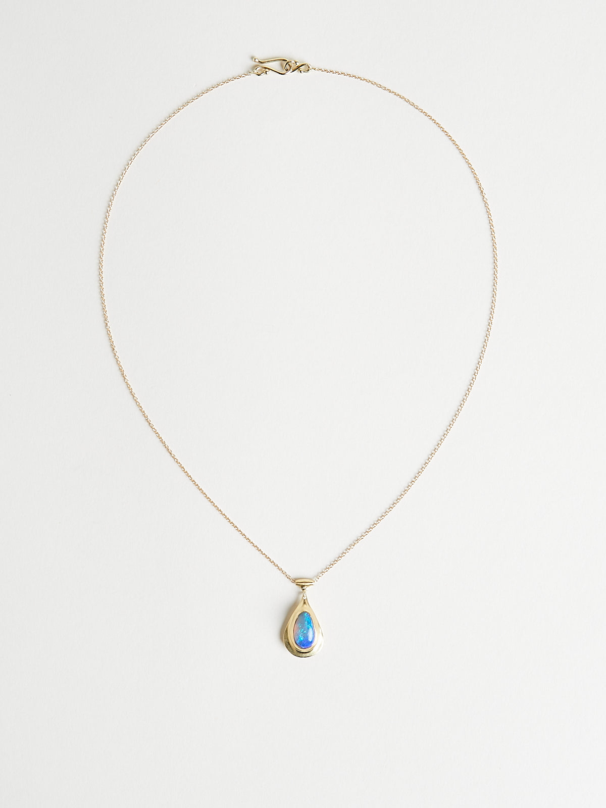 Necklace in with a delicate chain and a drop-shop pendant with an opal set in 18k yellow gold. Features a hook clasp.
