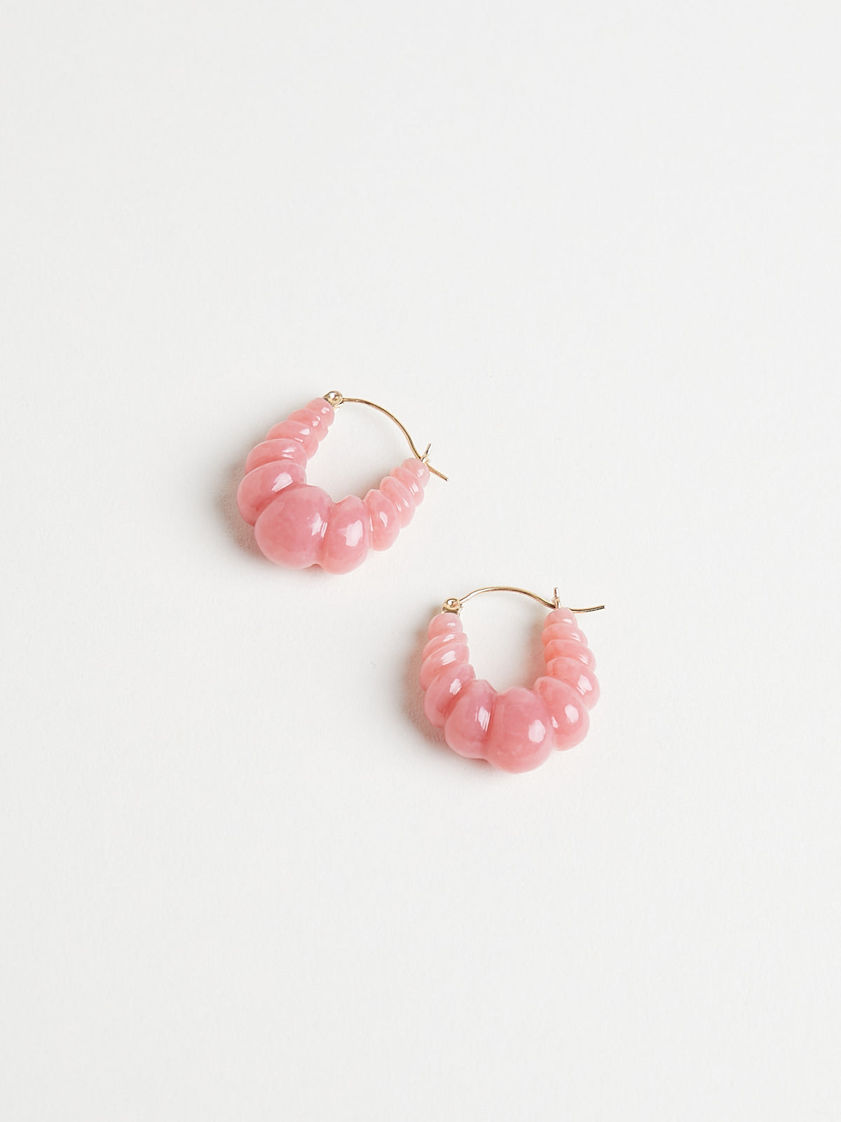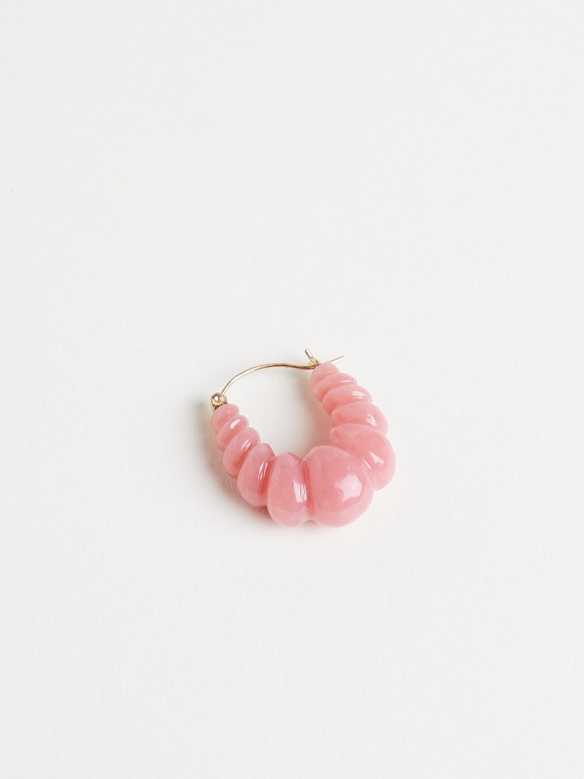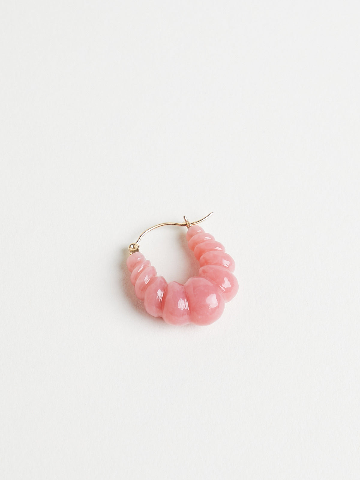 Handmade ear hoops made from hand-carved pink opal. Features a hinged backing in 18k yellow gold.