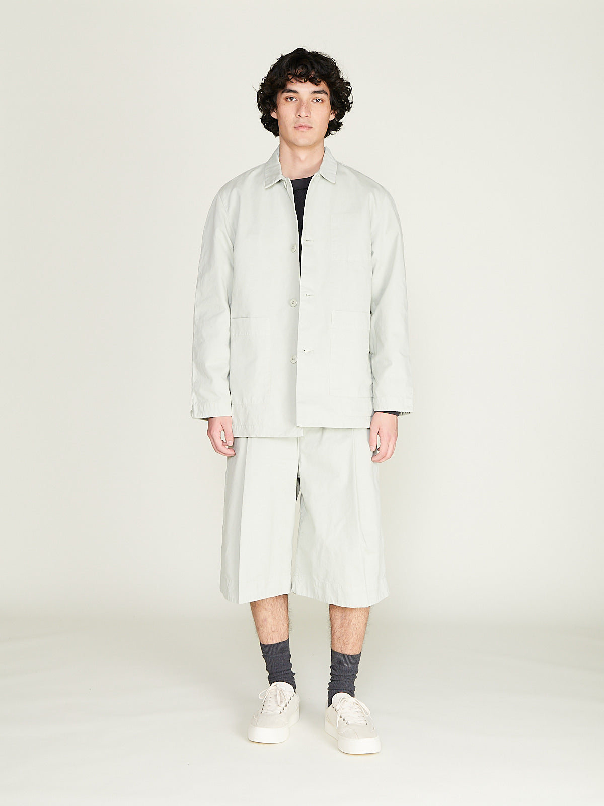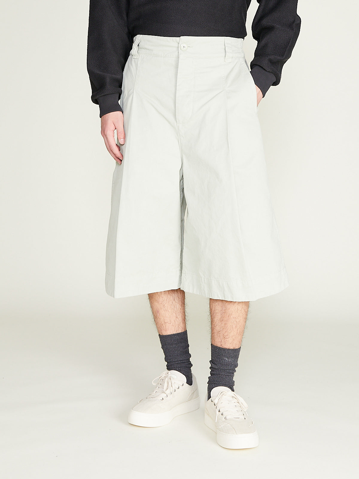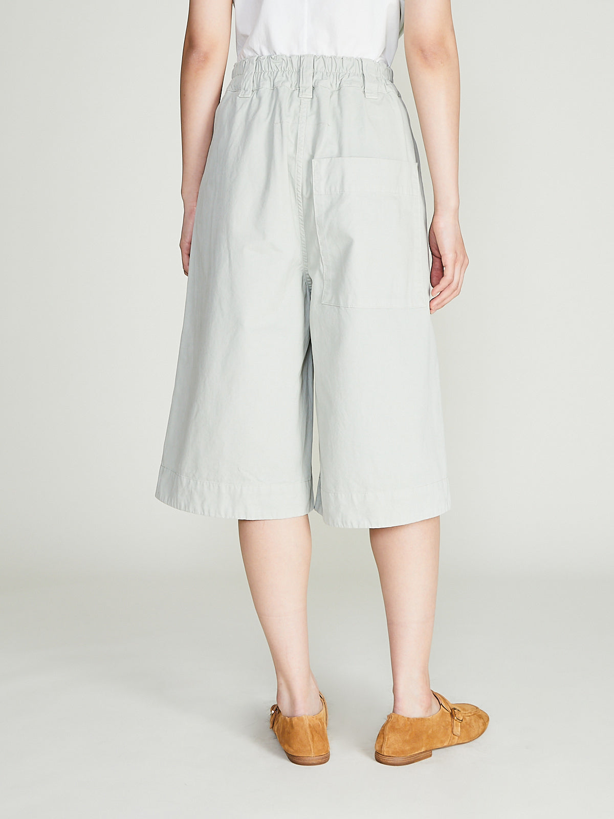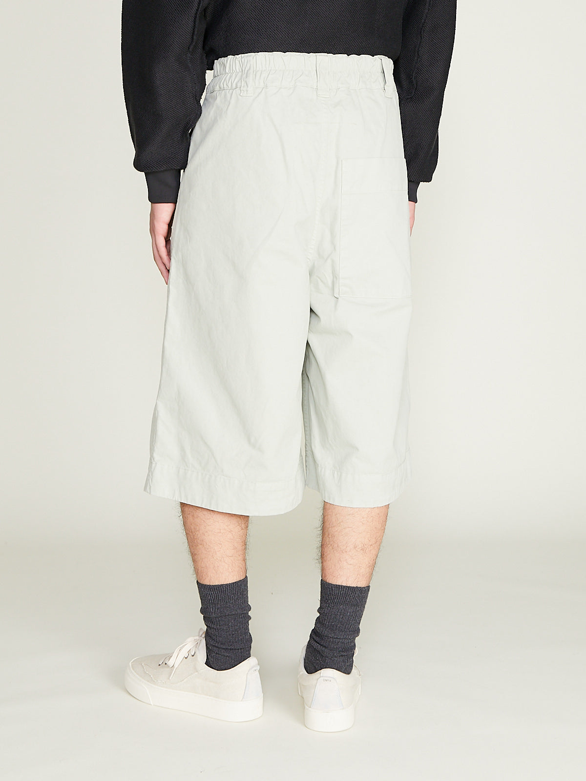 Wide leg short in pale grey mid-weight work cotton twill. Elasticated waistband on the back, belt loops, single button fastening and button fly. Pleats on the front and side seam pockets. Features a single patch pocket on the back. Cuts below-the-knee. Oversized fit.