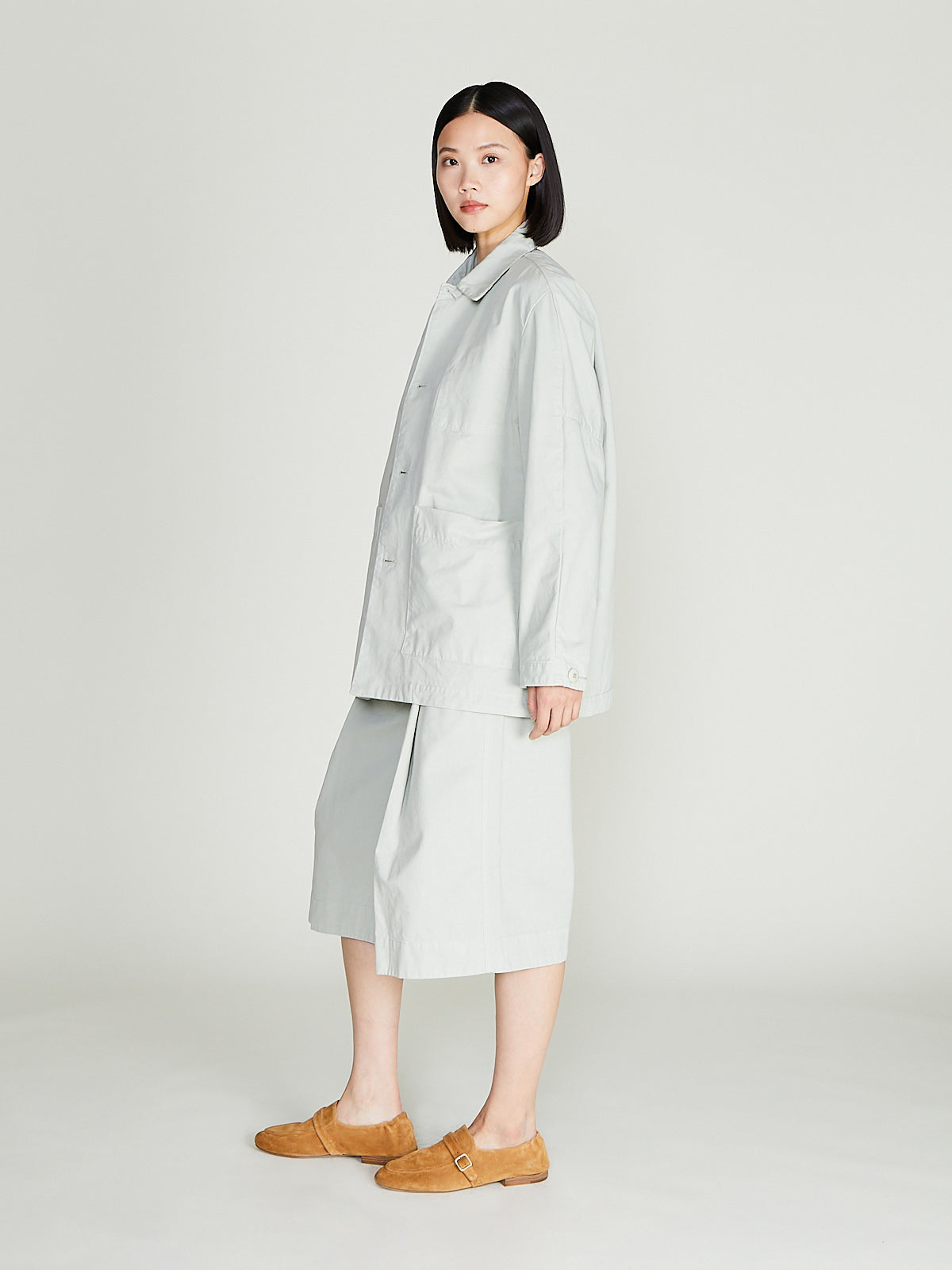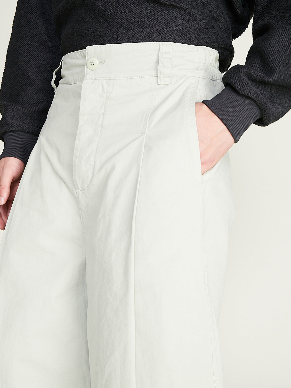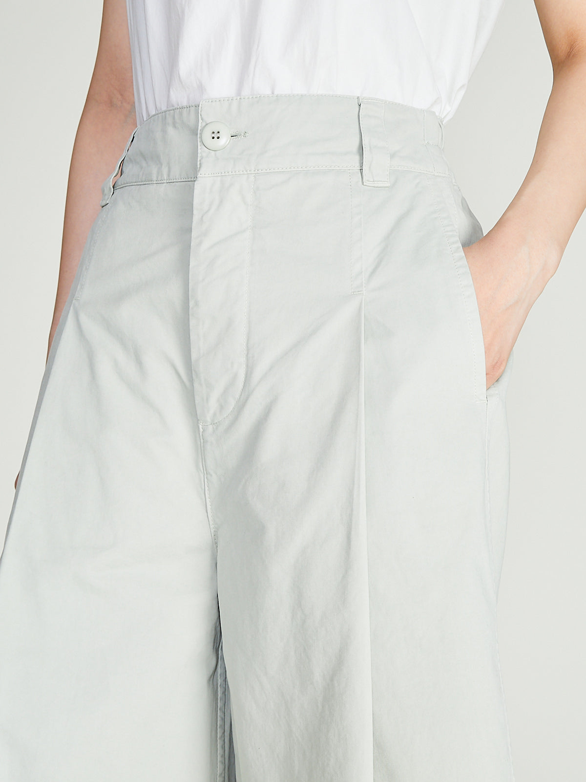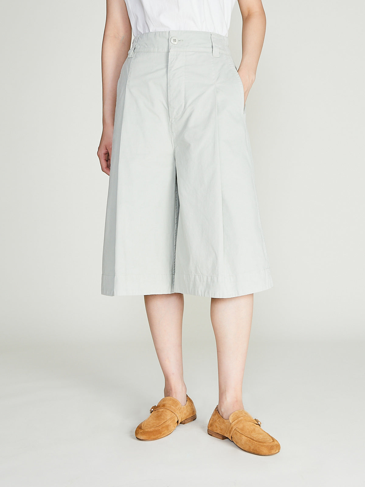 Wide leg short in pale grey mid-weight work cotton twill. Elasticated waistband on the back, belt loops, single button fastening and button fly. Pleats on the front and side seam pockets. Features a single patch pocket on the back. Cuts below-the-knee. Oversized fit.