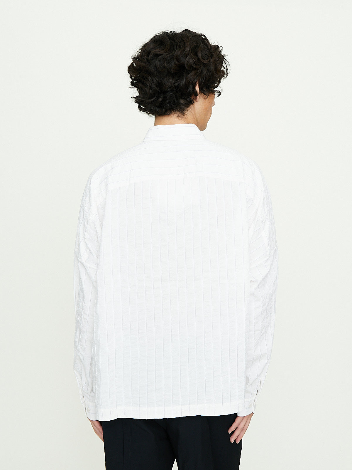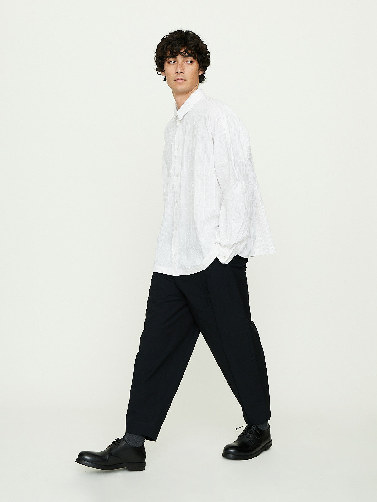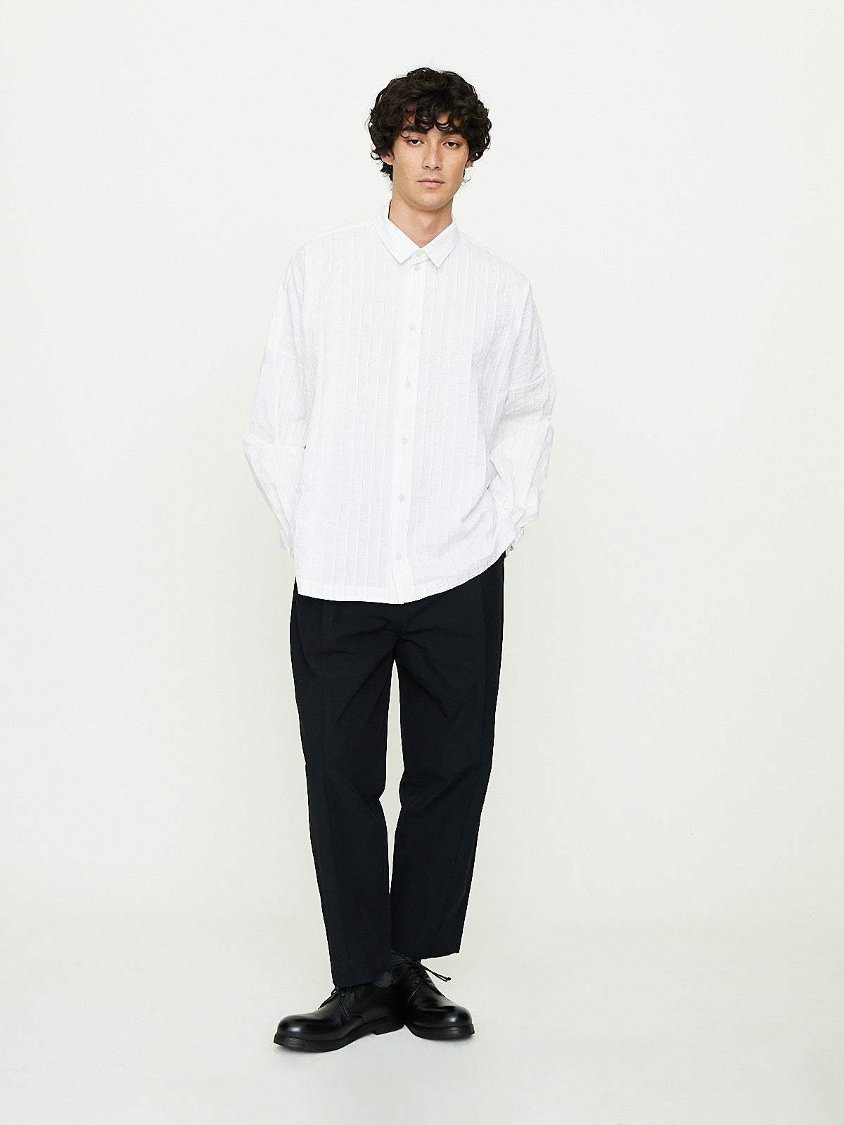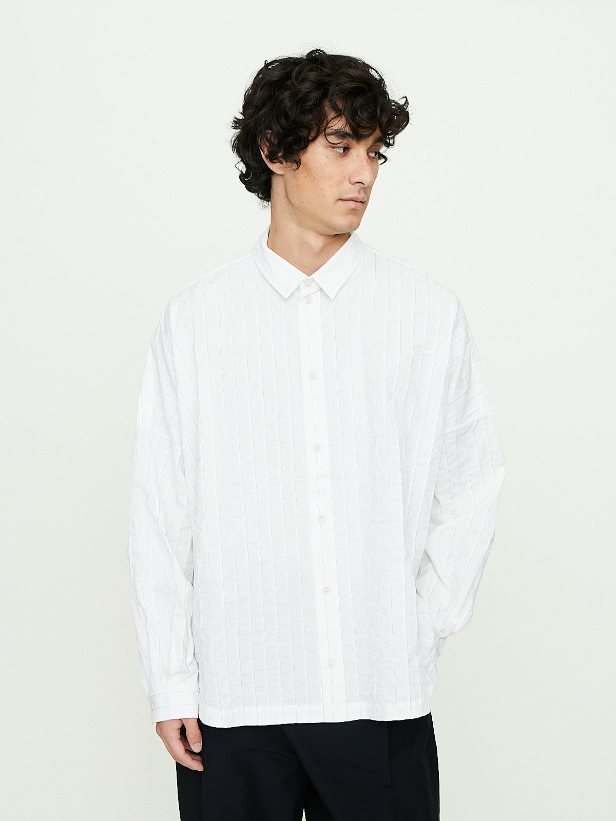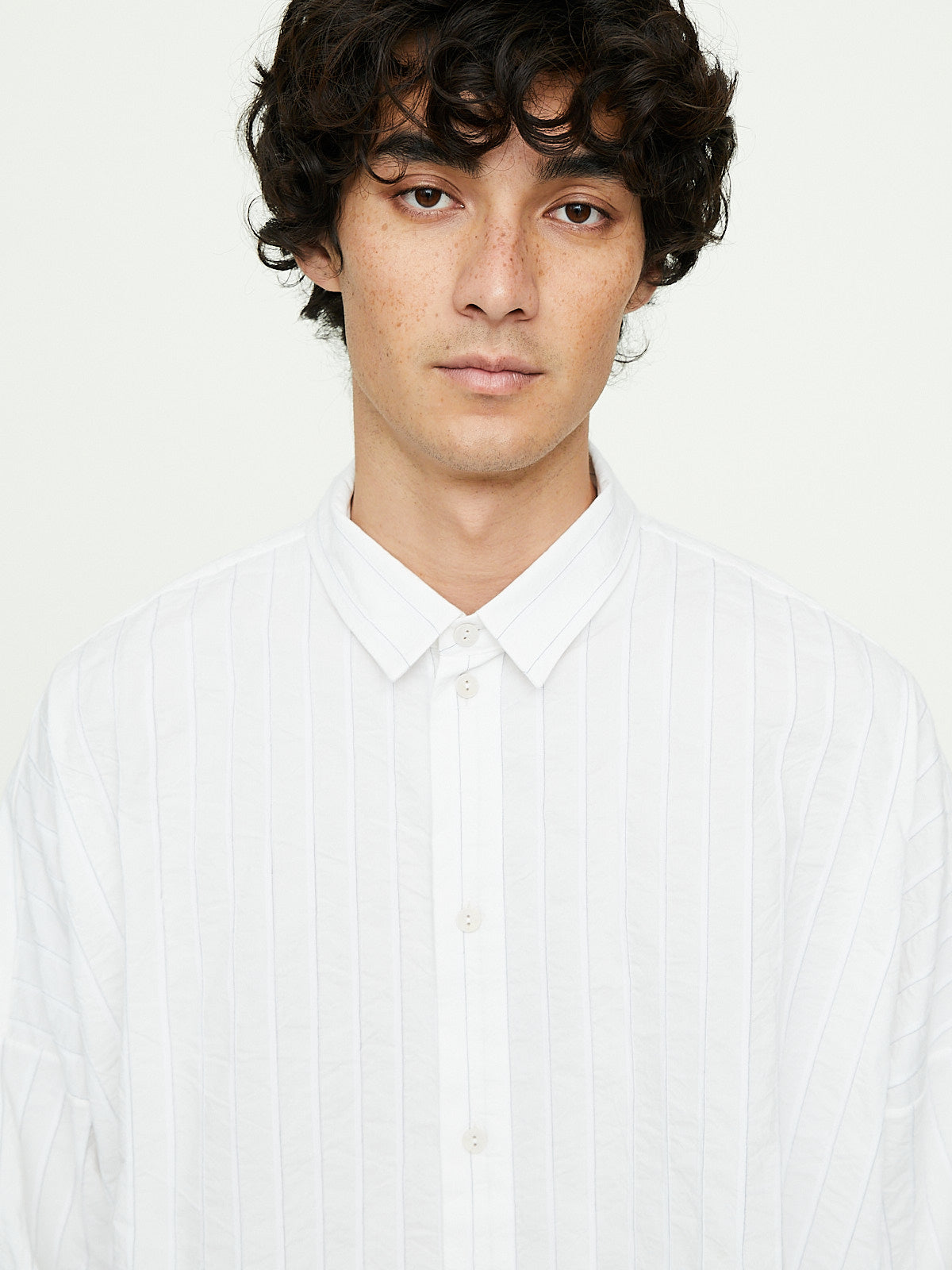 Wide unisex shirt in a chalk cotton shirting with subtle raised stripes created by a unique weaving technique. Pointed collar, front button fastening and voluminous sleeves with a dropped shoulder and buttoned cuffs. Boxy fit.