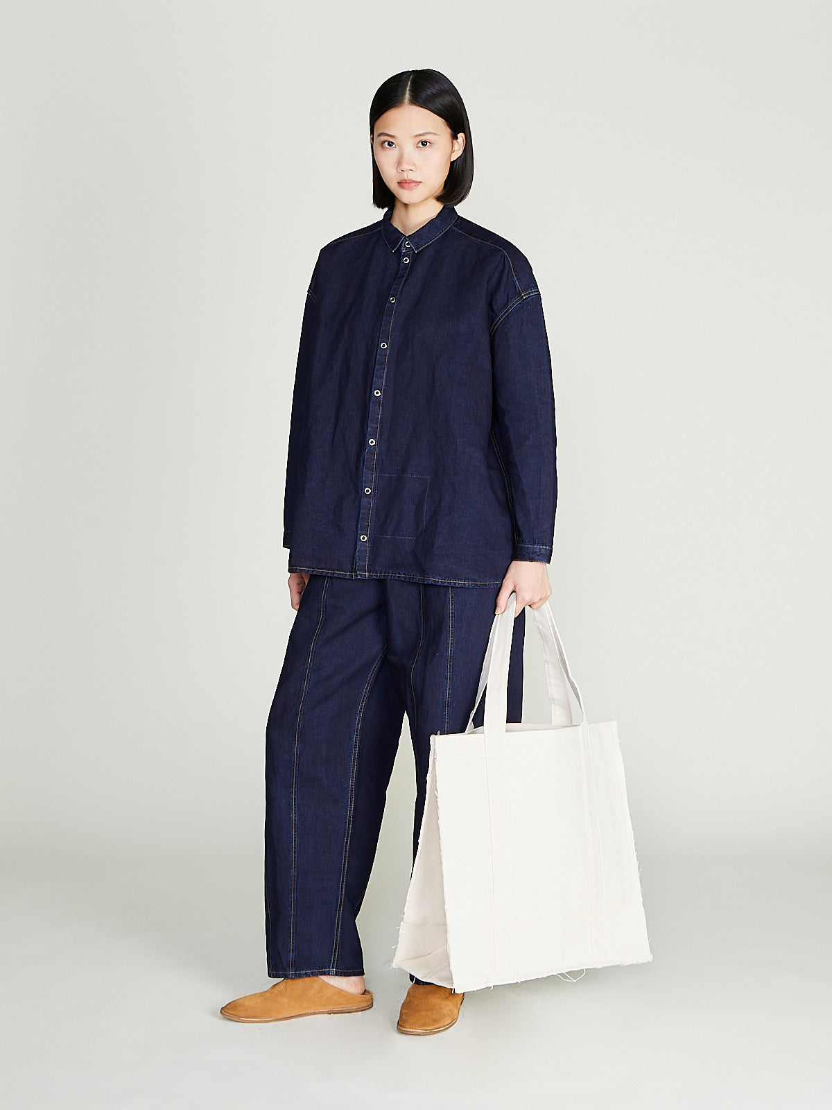 Tote made from thick bonded raw canvas inspired by a tool bag. Generous zip compartment and dedicated laptop pouch. A large metal popper brings the sides of the bag together internally. The bag is trimmed with raw edges giving added character with use.