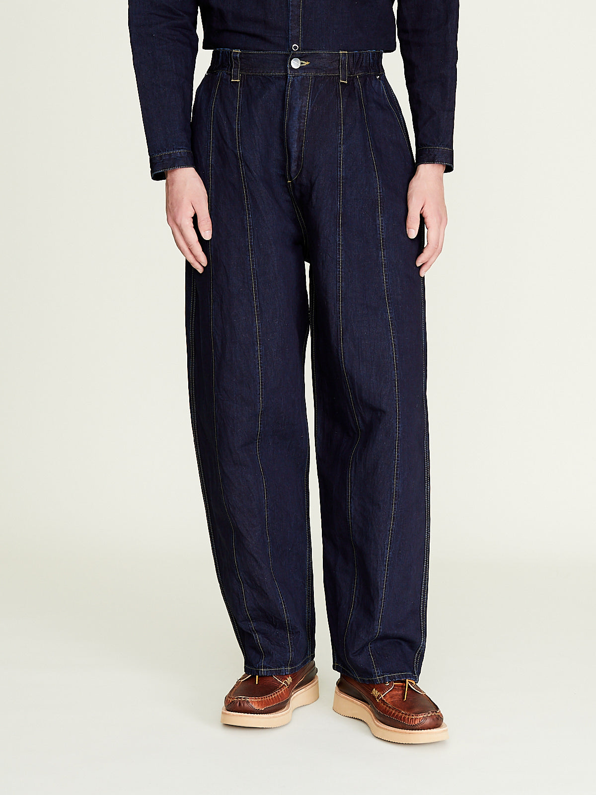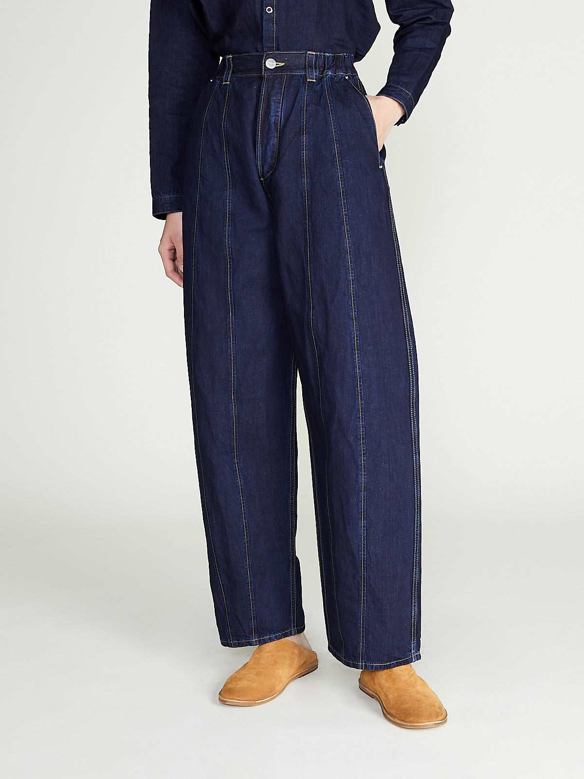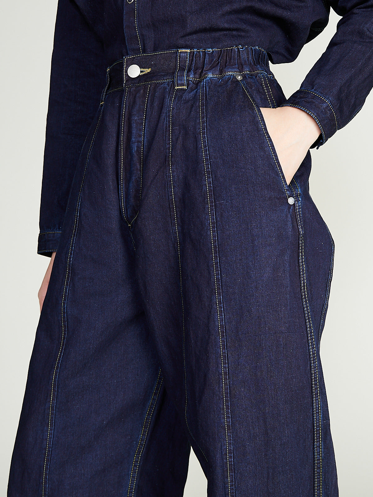 Voluminous unisex jeans in 8oz indigo cotton denim. Elasticated sides at waist, single button fastening and a zip fly. Belt loops, , slash pockets on the front and a generous back pocket. Features panelling at legs for a loose, barrel shape. Contrasting topstitching throughout.