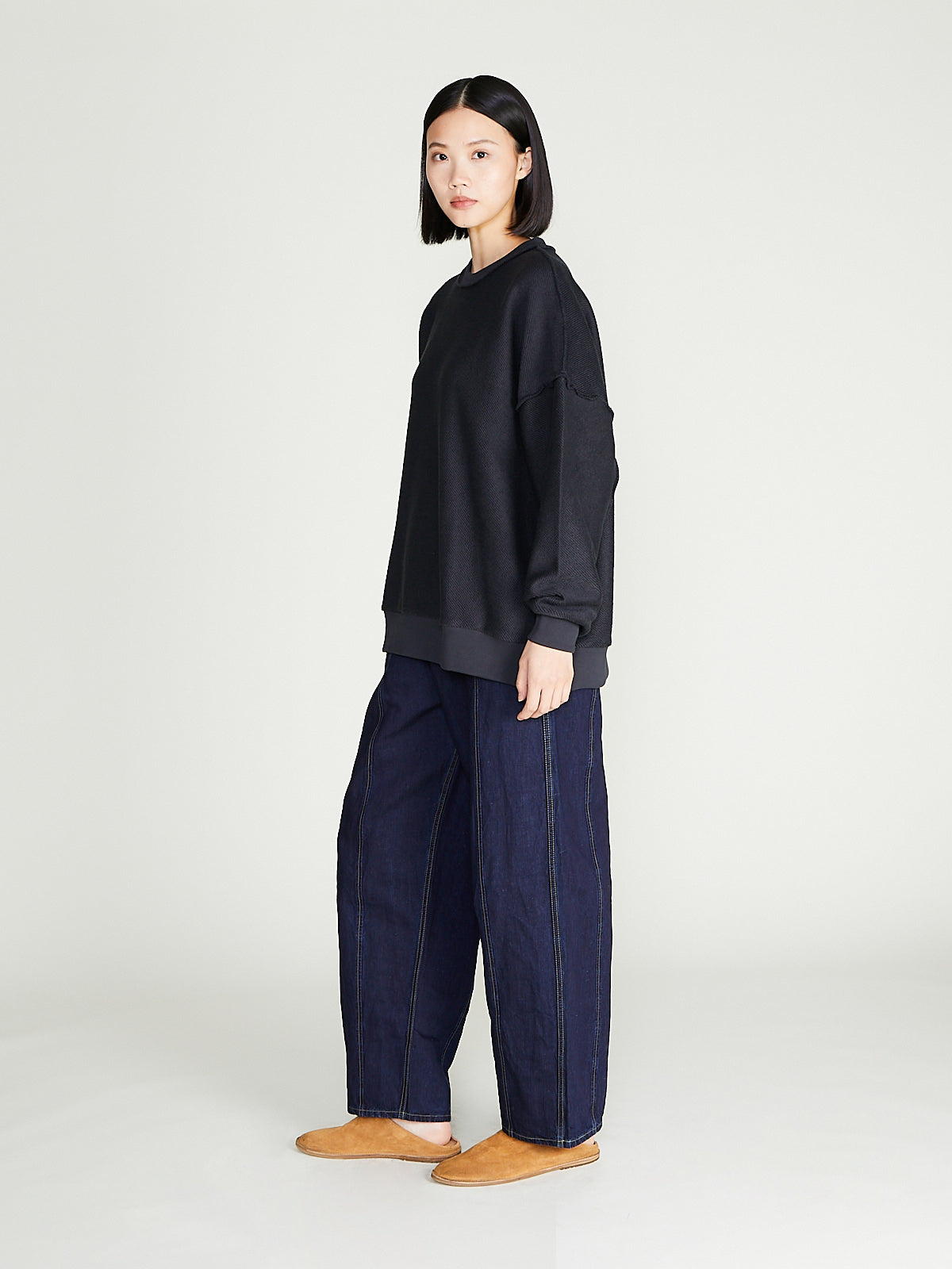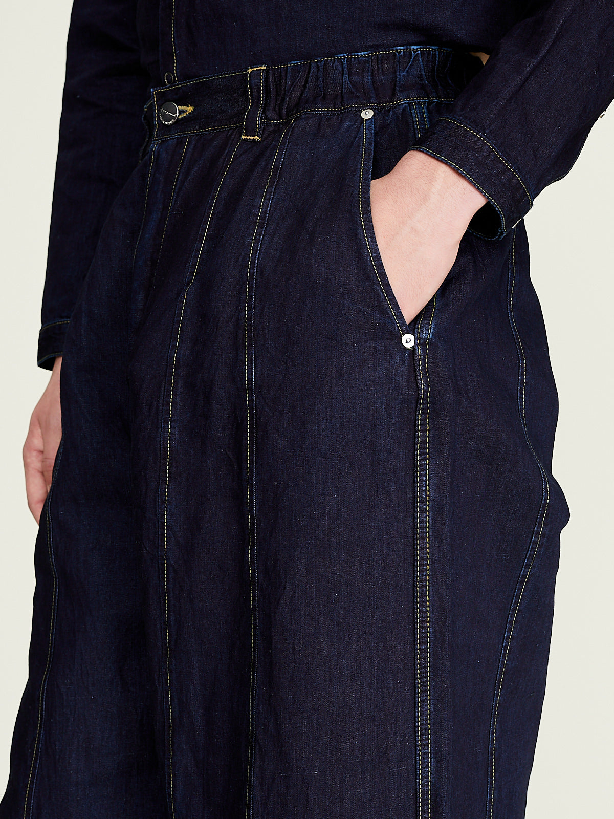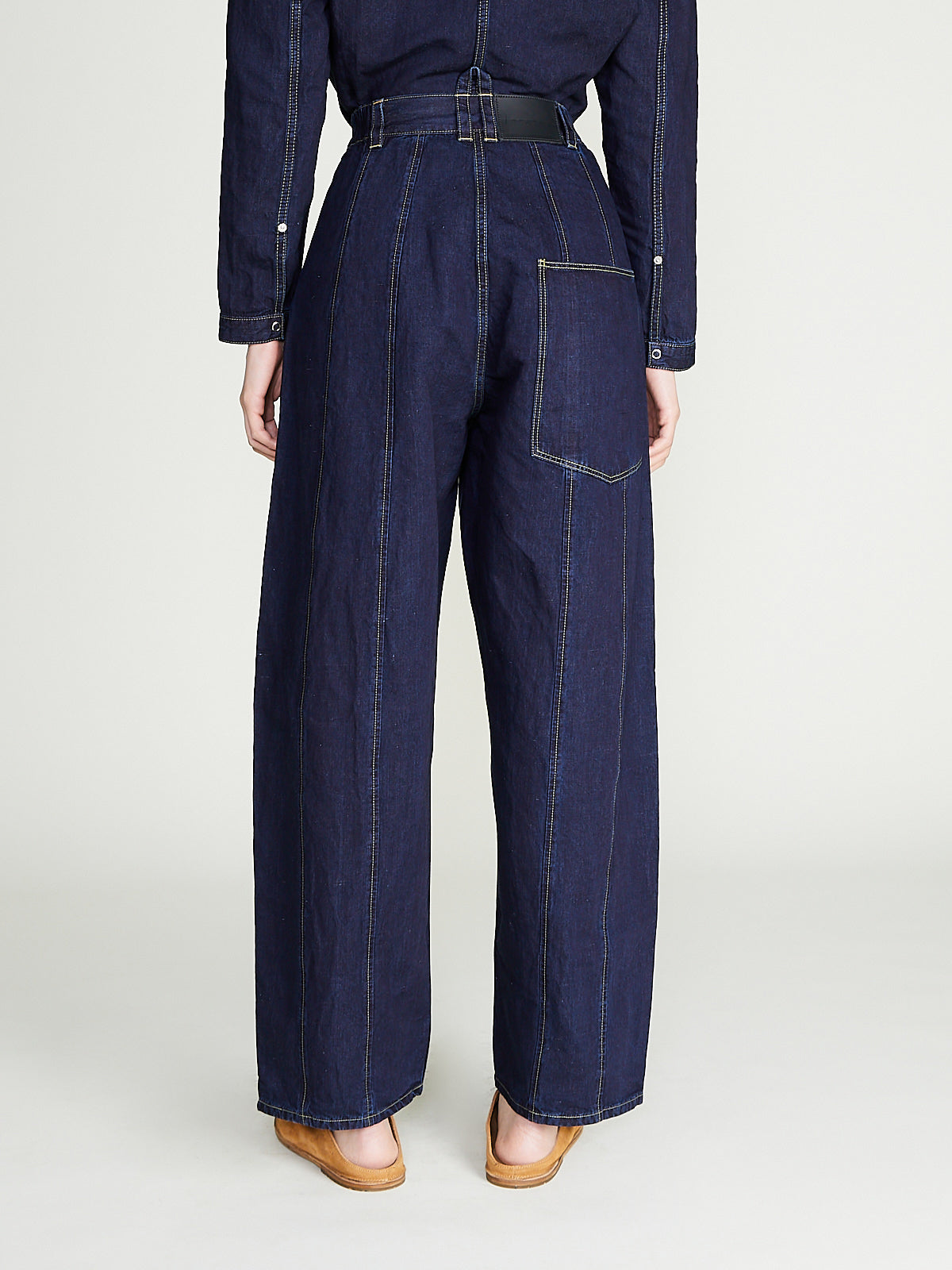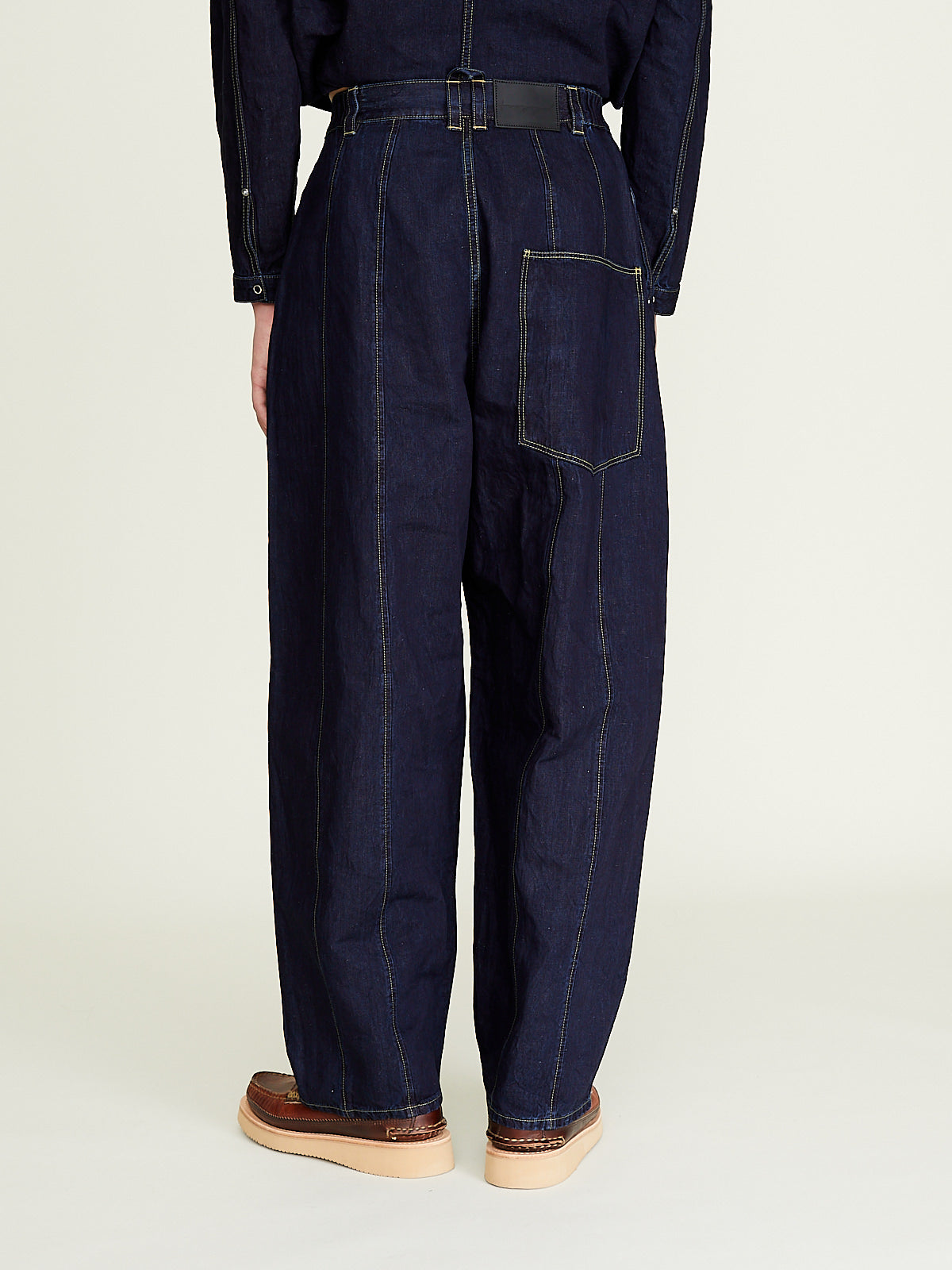 Voluminous unisex jeans in 8oz indigo cotton denim. Elasticated sides at waist, single button fastening and a zip fly. Belt loops, , slash pockets on the front and a generous back pocket. Features panelling at legs for a loose, barrel shape. Contrasting topstitching throughout.