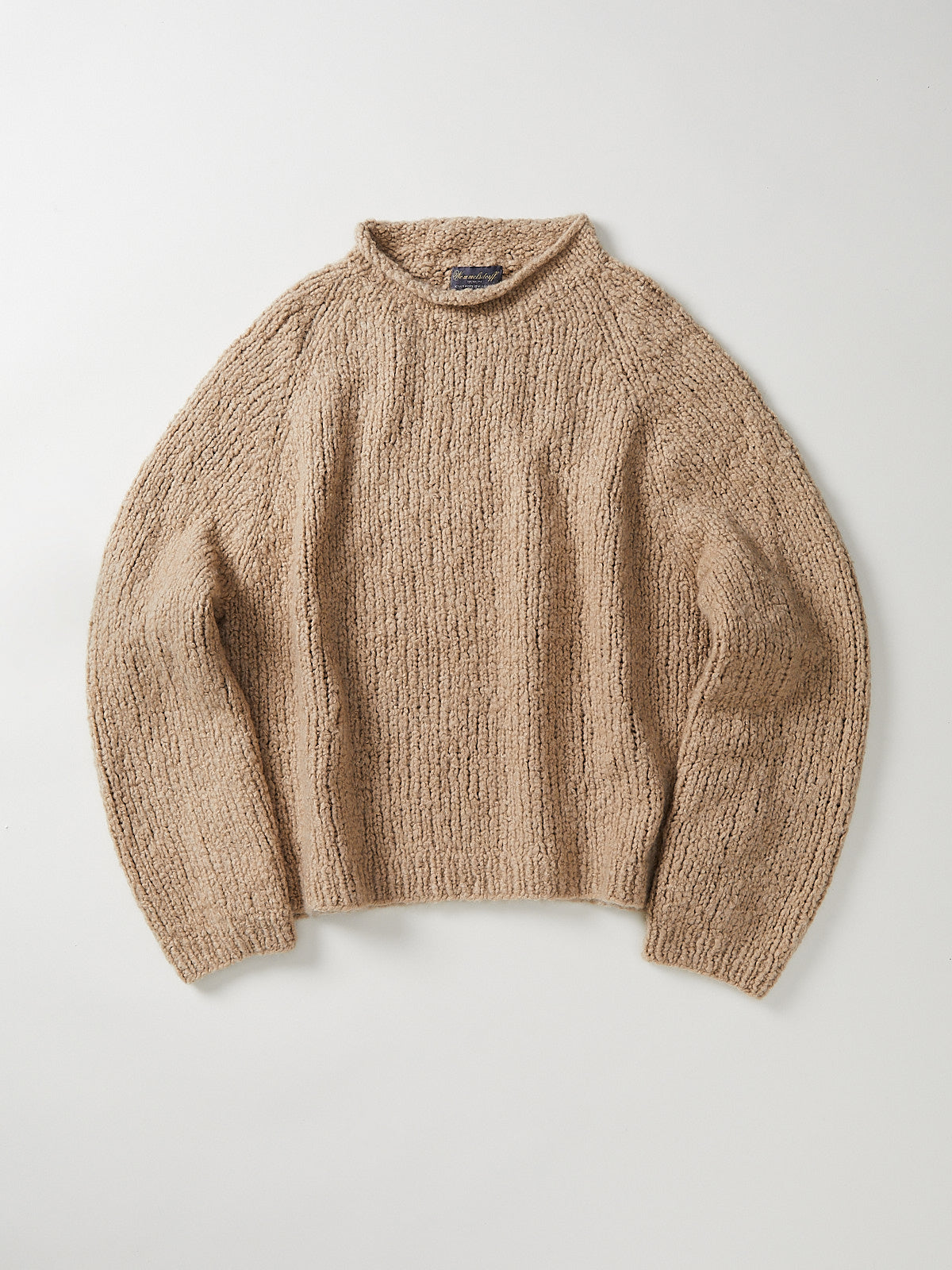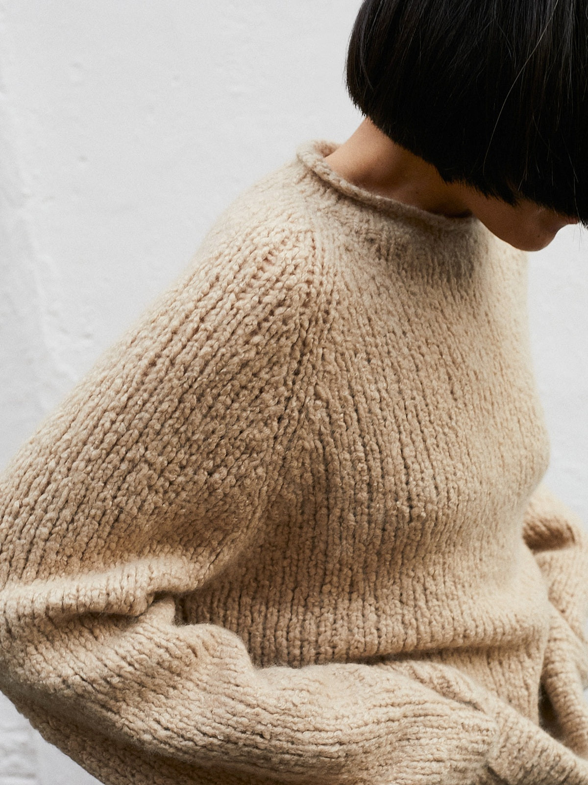 Handknitted rib-knit sweater in beige cashmere/silk. Mock neck and long raglan sleeves with a subtle blouson shape. Rib detail around the neck, cuffs and bottom hem. Relaxed fit.