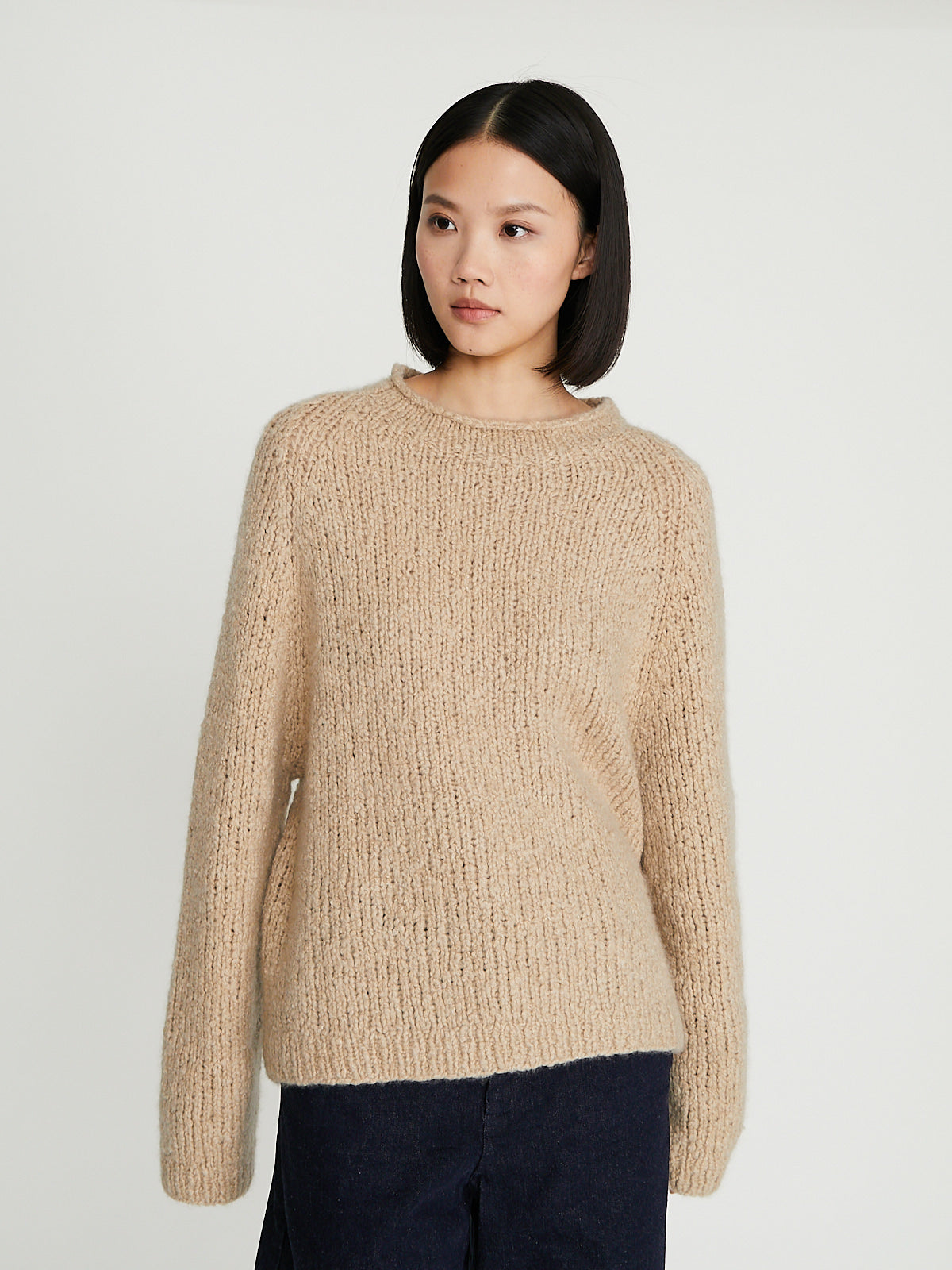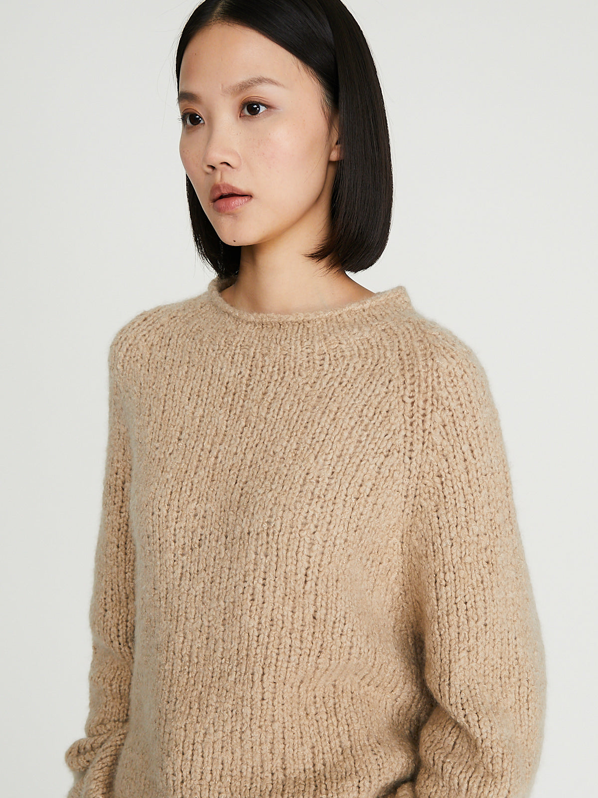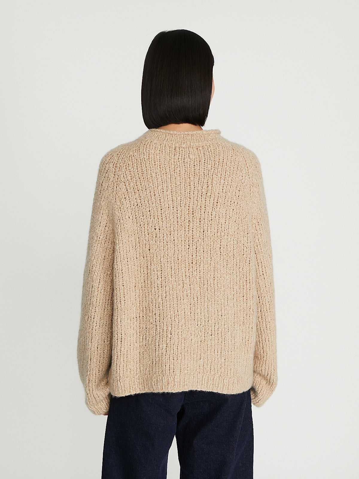 Handknitted rib-knit sweater in beige cashmere/silk. Mock neck and long raglan sleeves with a subtle blouson shape. Rib detail around the neck, cuffs and bottom hem. Oversized fit.