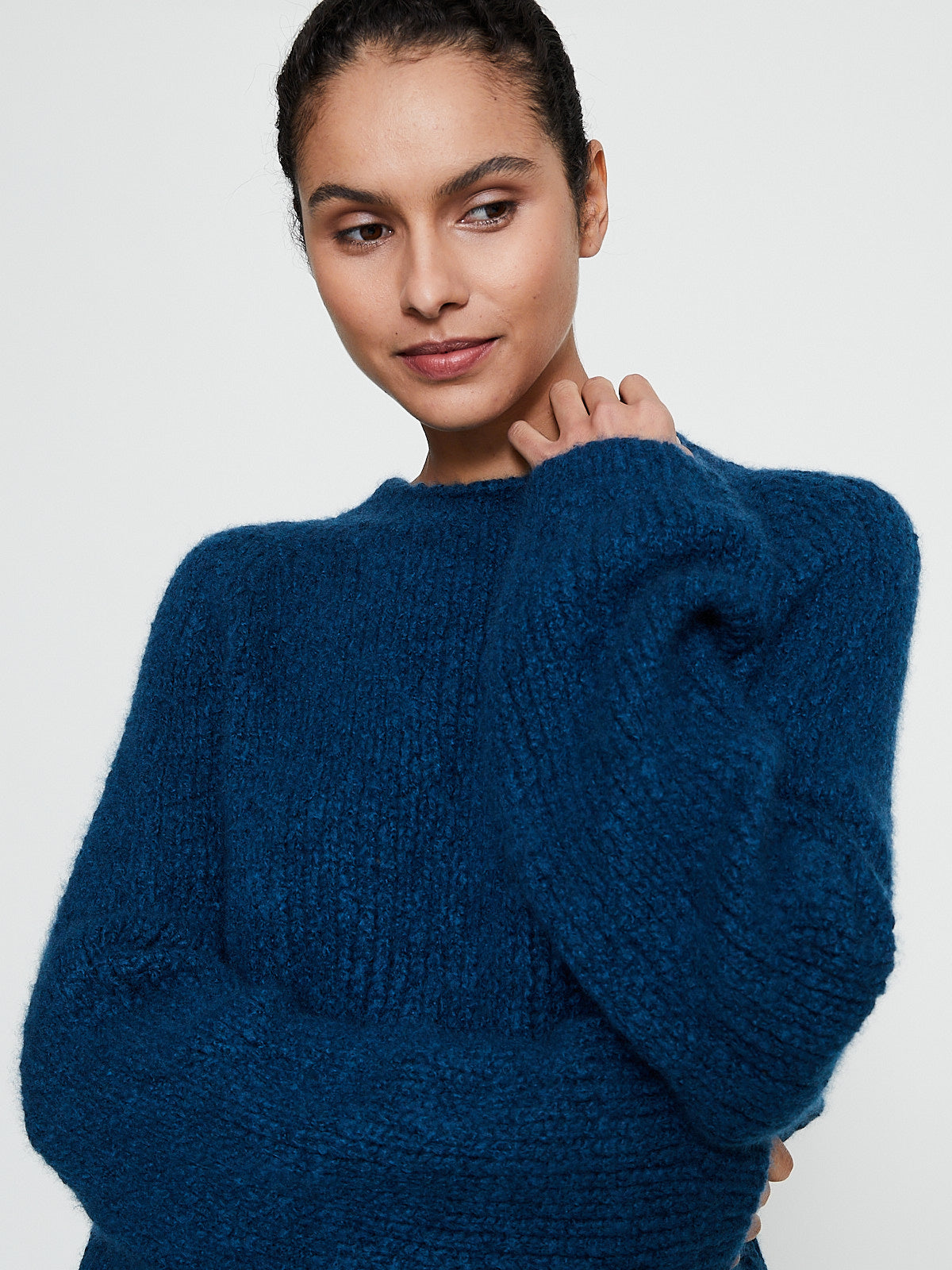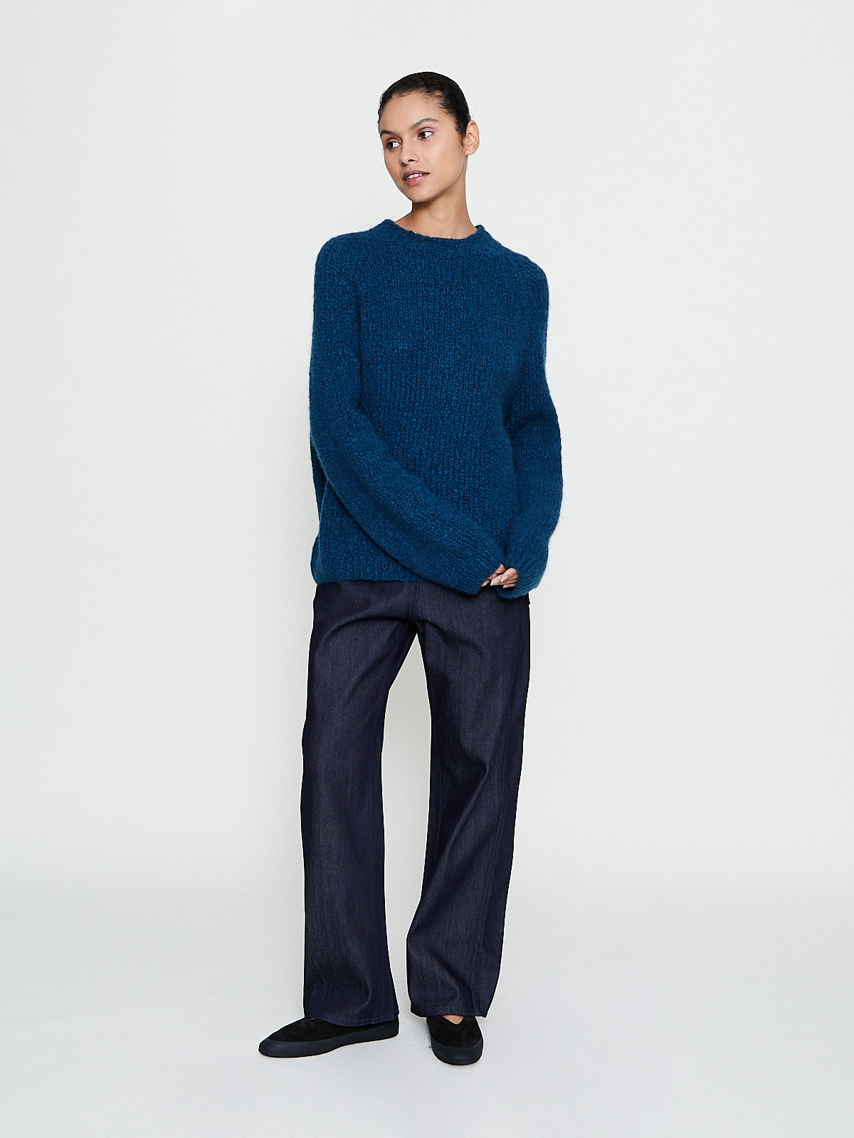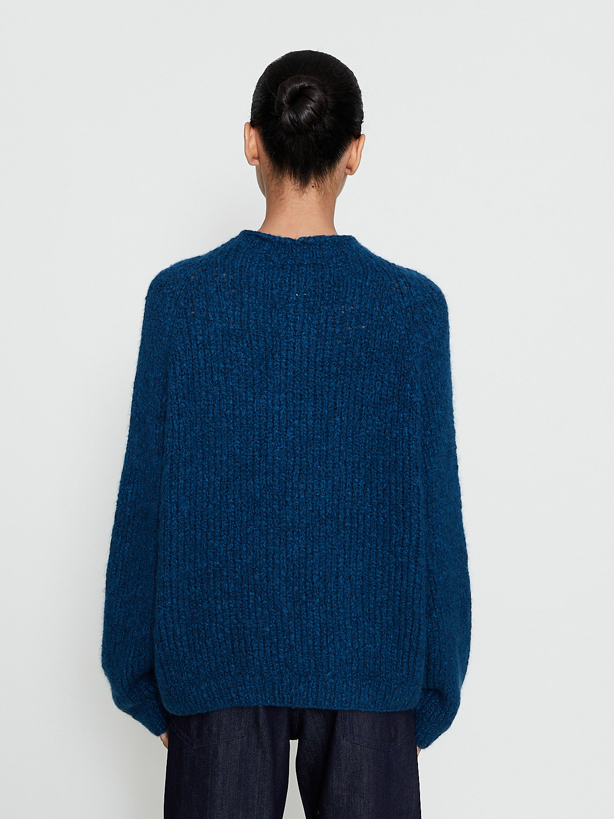 Handknitted rib-knit sweater in petrol blue cashmere/silk. Mock neck and long raglan sleeves with a subtle blouson shape. Rib detail around the neck, cuffs and bottom hem. Relaxed fit.