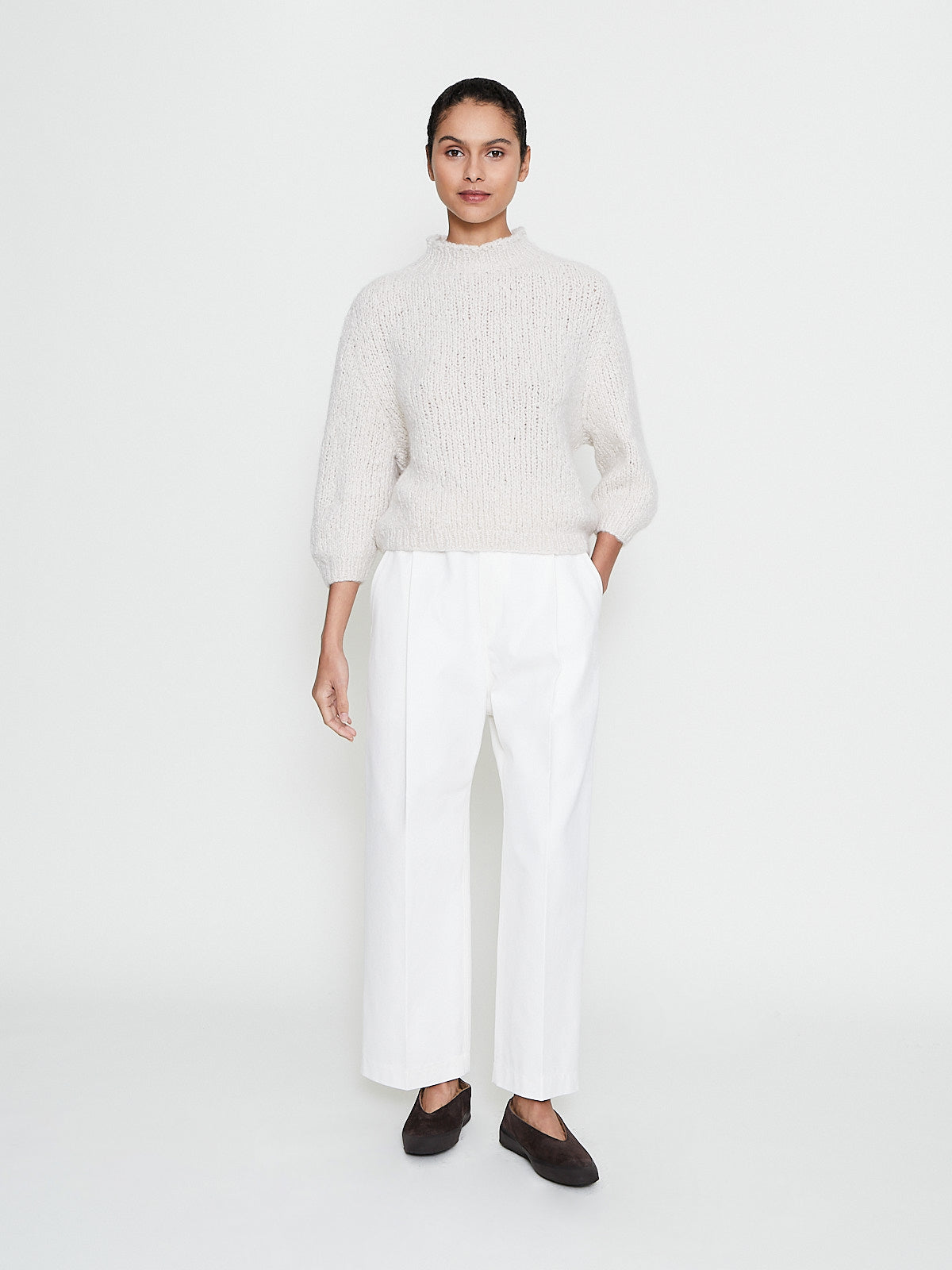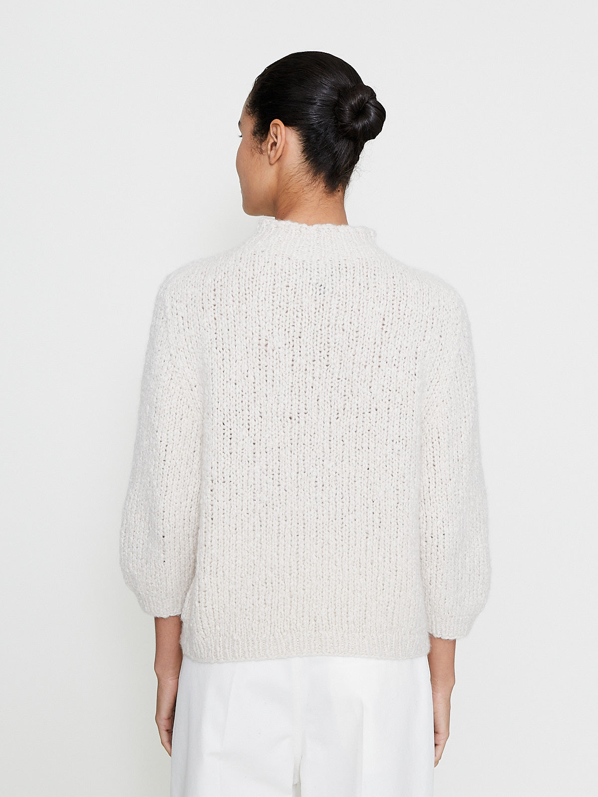 Handknitted sweater in ivory cashmere/silk. Subtle stand collar and sculpted 3/4 sleeves with a fully fashioned shoulder. Slightly cropped. Rib detail around the neck, cuffs and bottom hem.