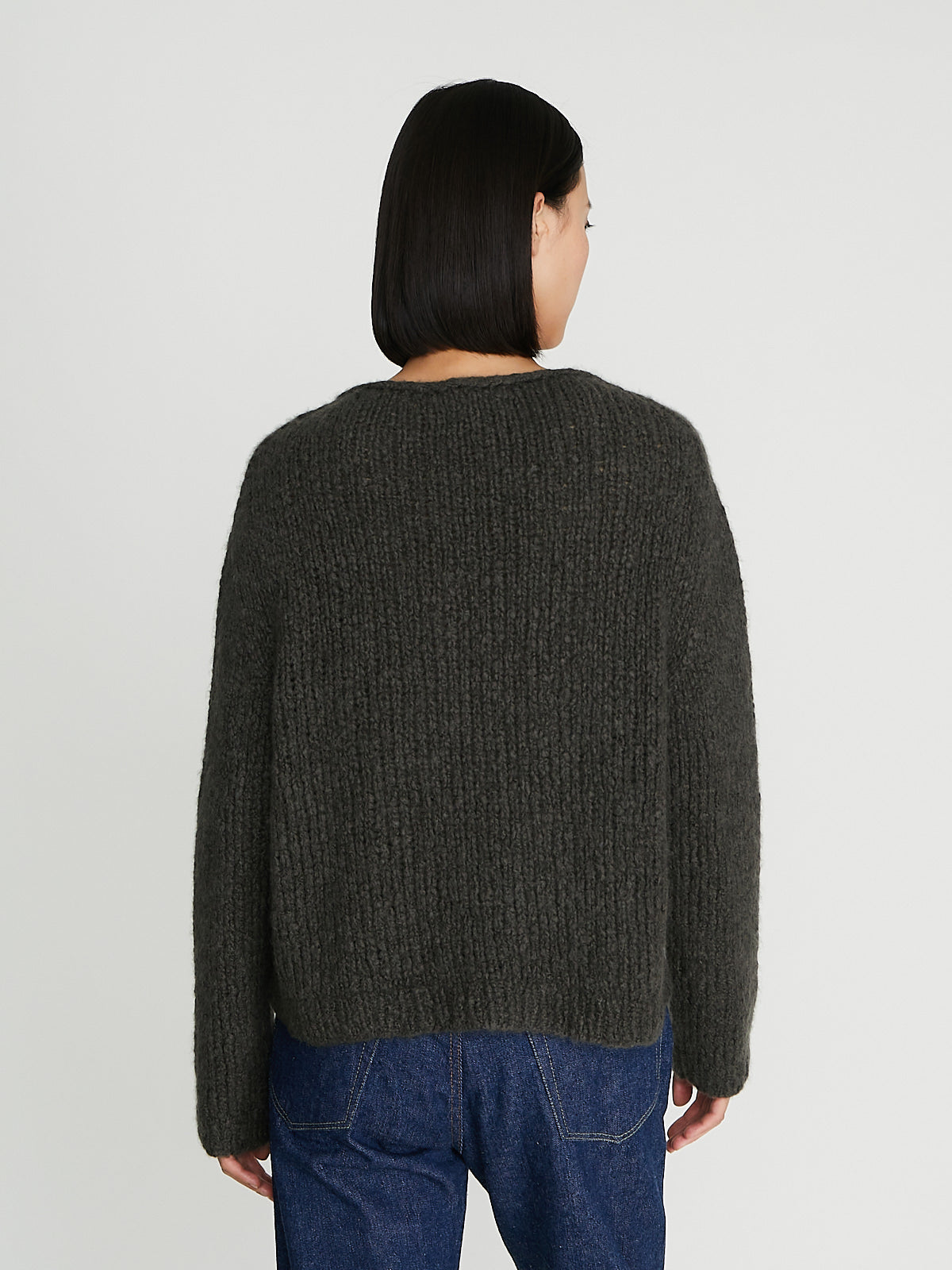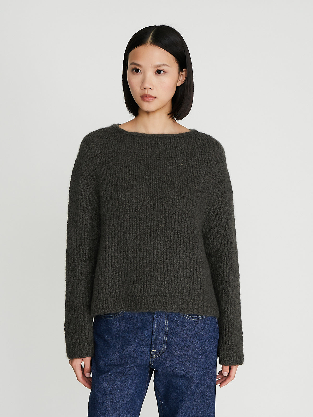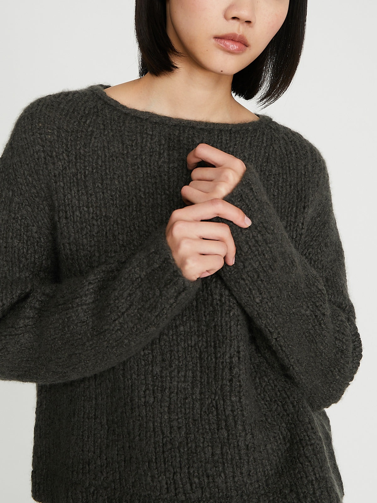 Handknitted rib-knit sweater in a dark taupe cashmere/silk. Round neckline, and long sleeves with a dropped shoulder. Features a rolled edge at the neckline and a rib detail around the cuffs and bottom hem.